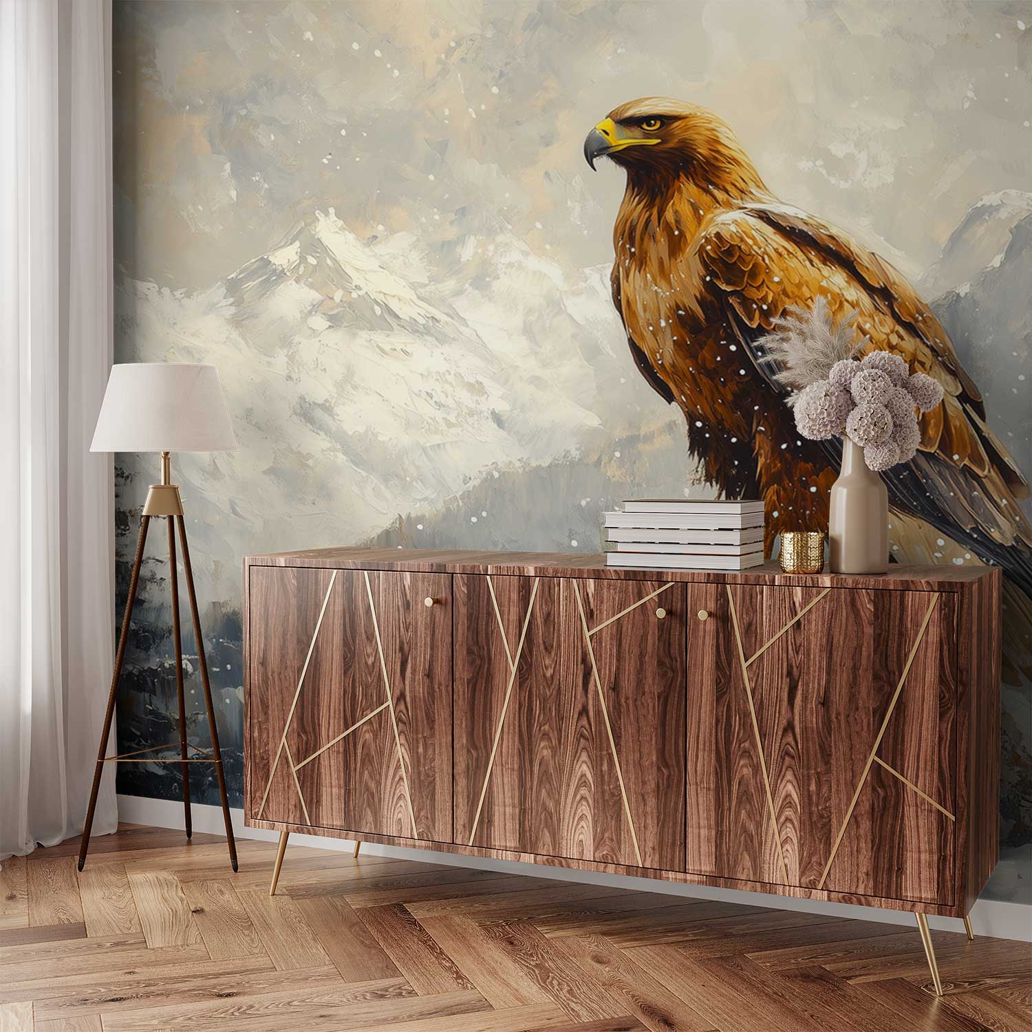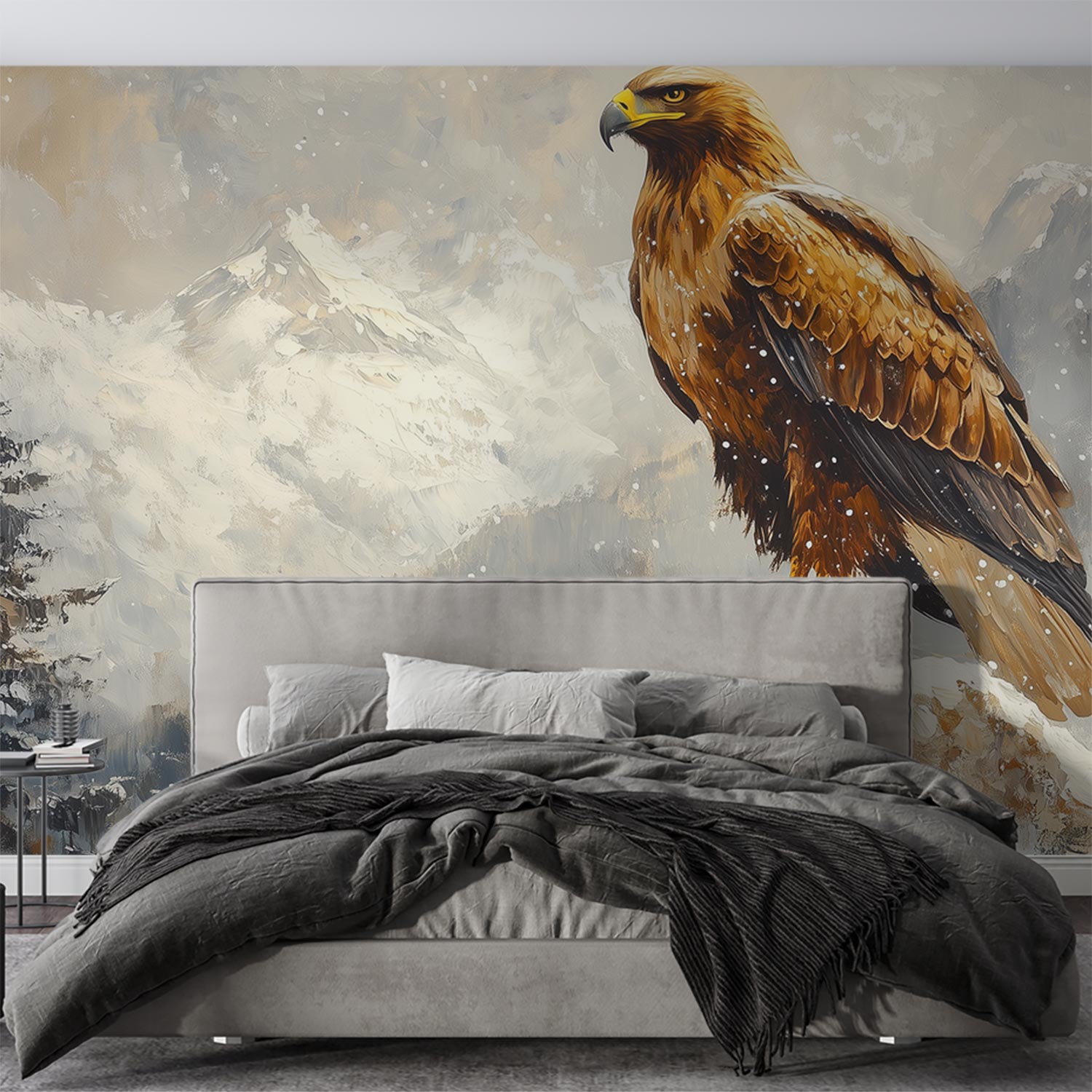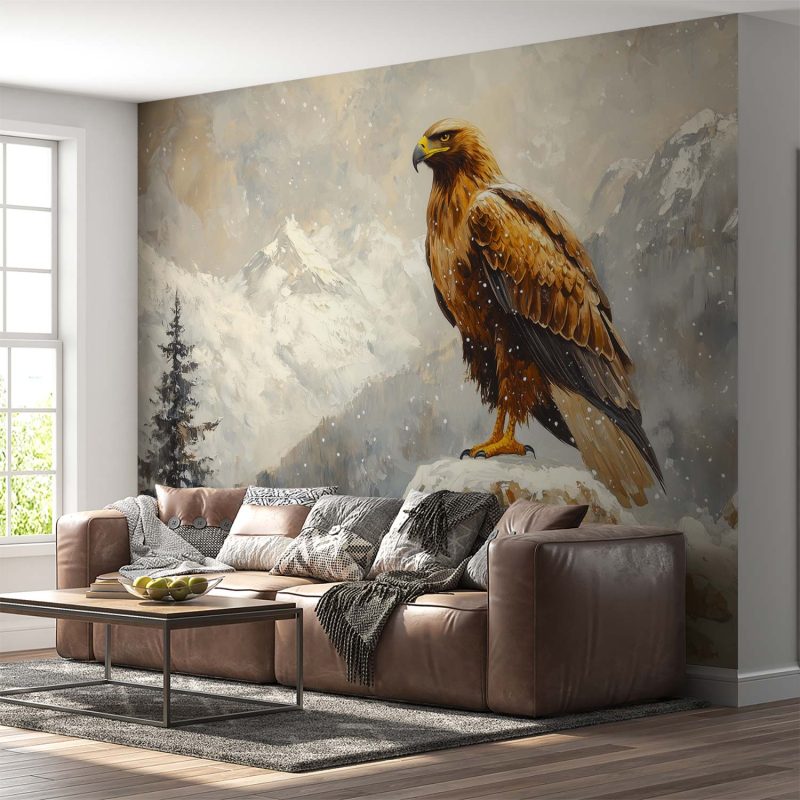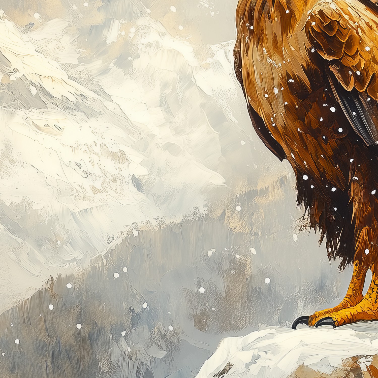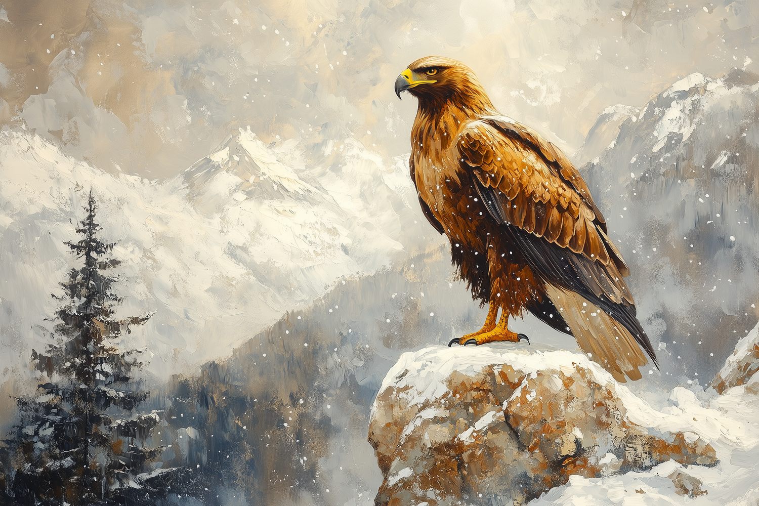 Gouden veren glinsteren in het koude licht, hoog op een besneeuwde bergtop. Deze adelaar heerst over een serene wildernis, elk veertje levensecht weergegeven. Zijn indrukwekkende silhouet tegen de witte achtergrond brengt pure natuurkracht en rust in je interieur. Perfect voor wie verlangt naar een statement vol vrijheid en majesteit in de woonruimte.
