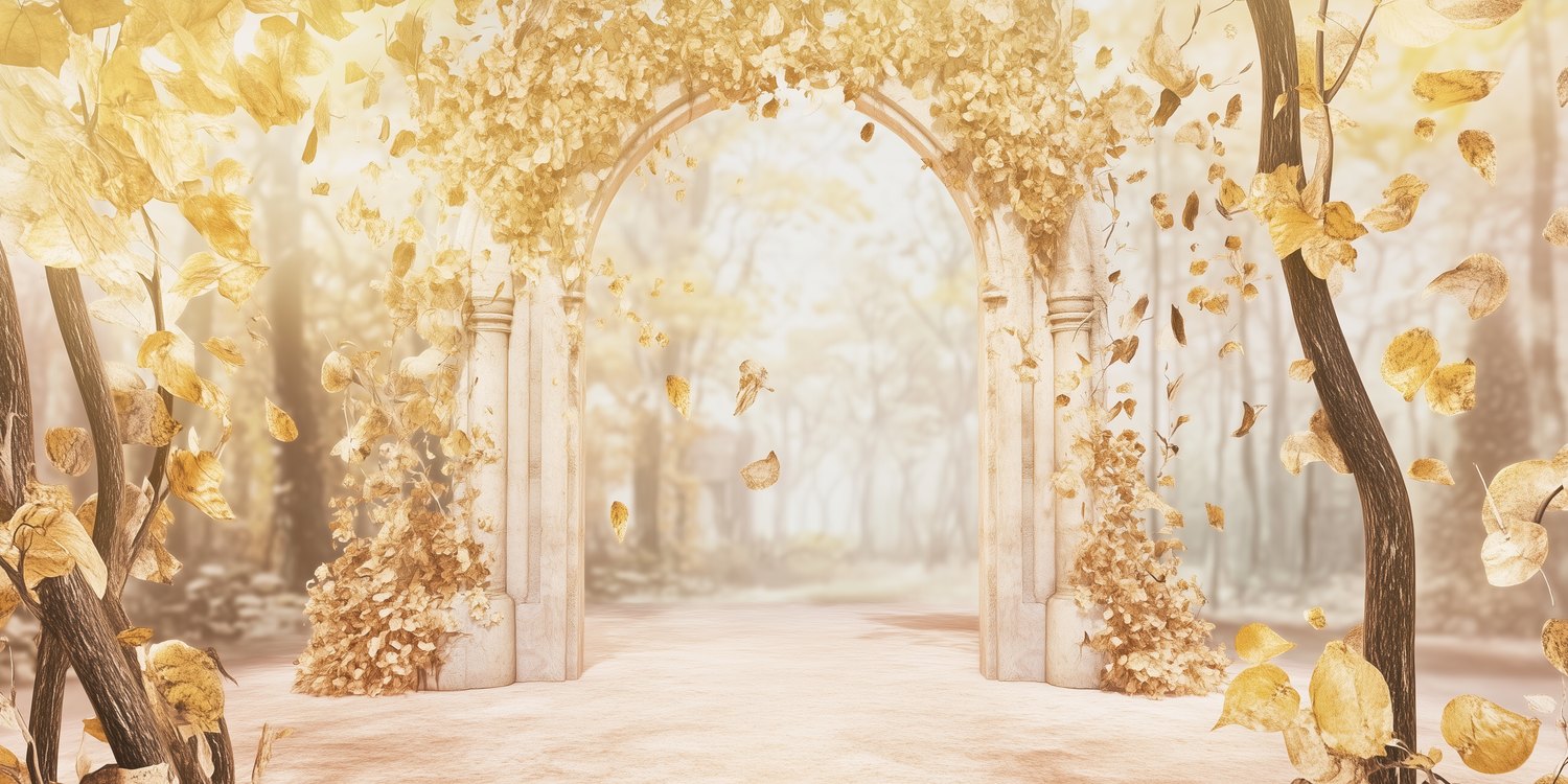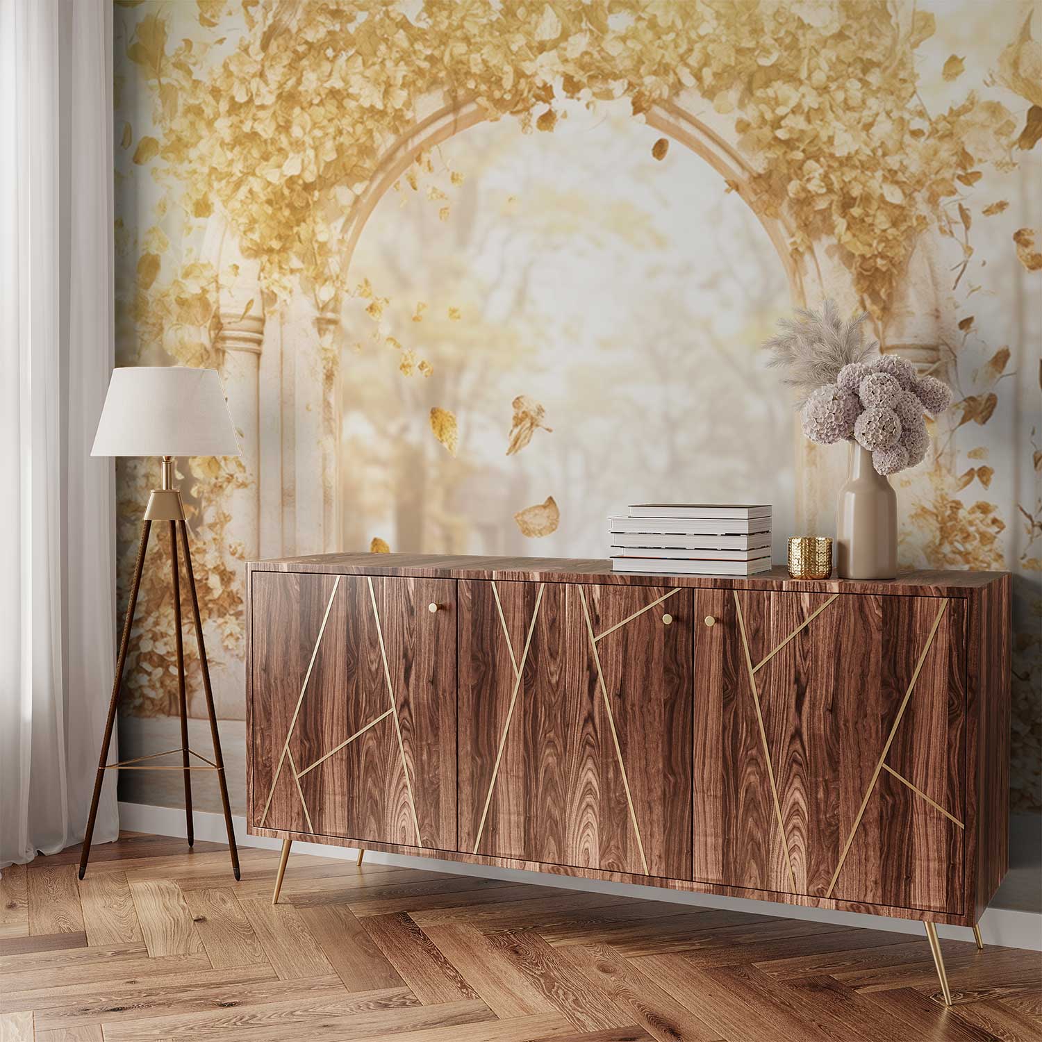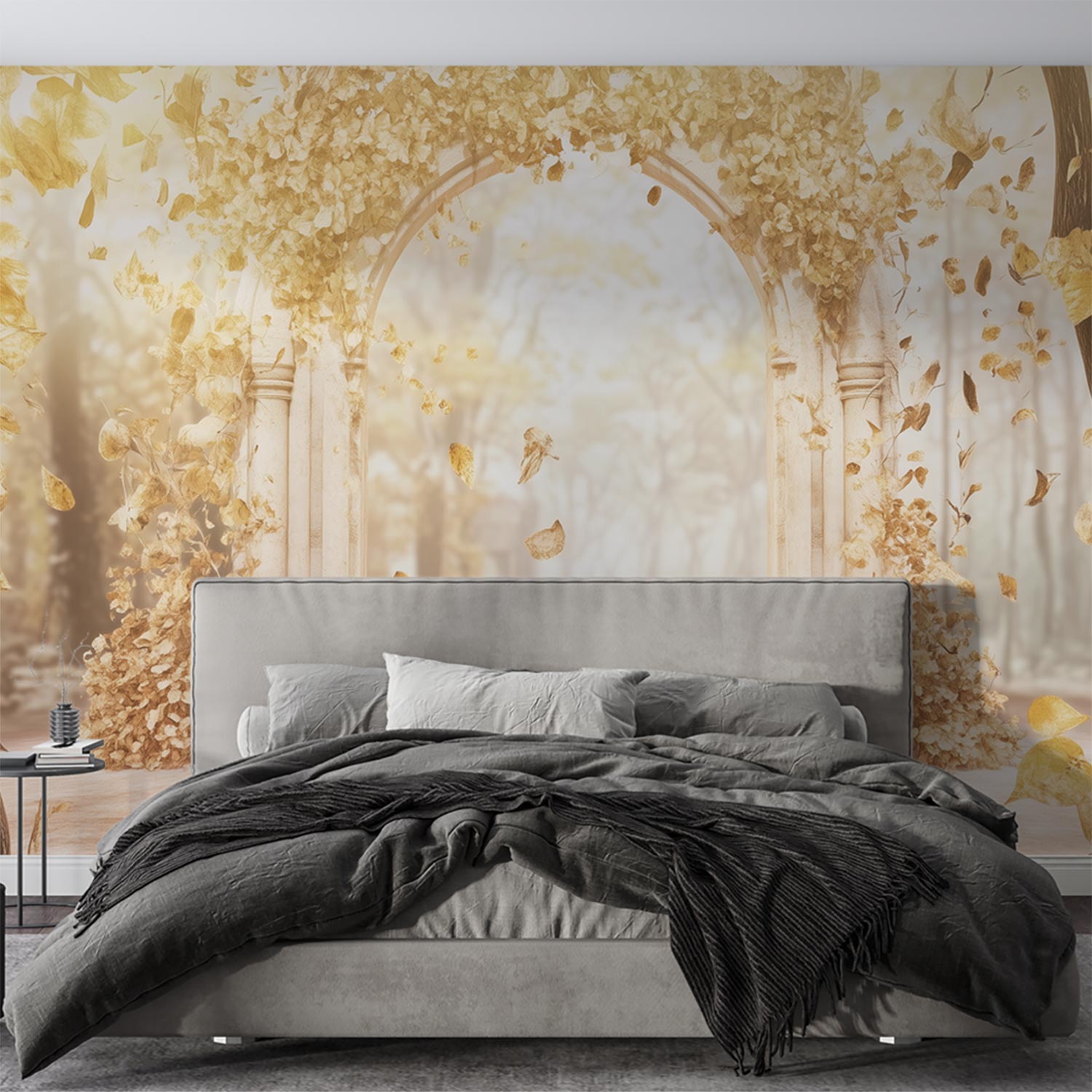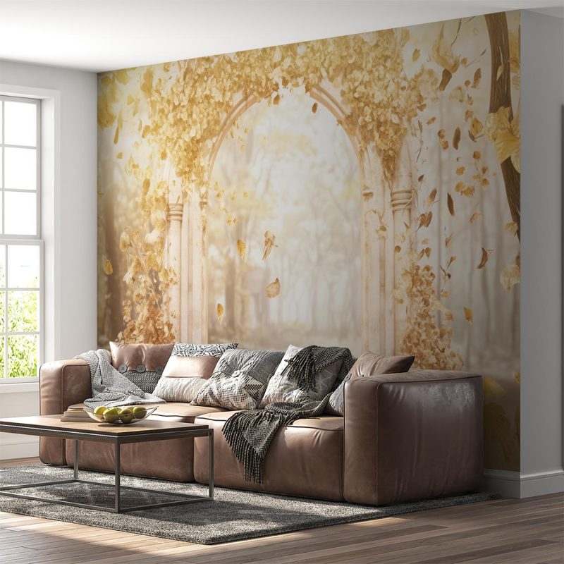 Verwarmend geel en frisgroen dansen tussen de bomen. Een met klimop omarmde stenen boog nodigt je uit dit betoverende woud binnen te glippen. Levendige herfstbladeren fluisteren in de wind en creëren een oase van rust. Breng deze magische sfeer naar huis; dit behang transformeert elke ruimte tot een serene natuurlijke ontsnapping vol harmonie en diepte.