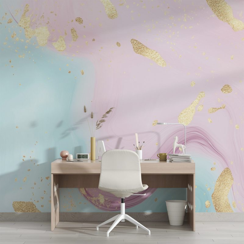 Vibrante blauwe en roze tinten dansen in dynamische beweging over het behang, verrijkt met gouden glitters die een vleugje luxe toevoegen. Deze levendige abstracte compositie brengt energie en verwondering in elke ruimte, perfect voor wie durft te experimenteren met een statement muur die zowel harmonieus als opvallend is.