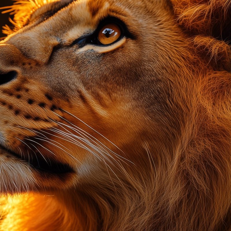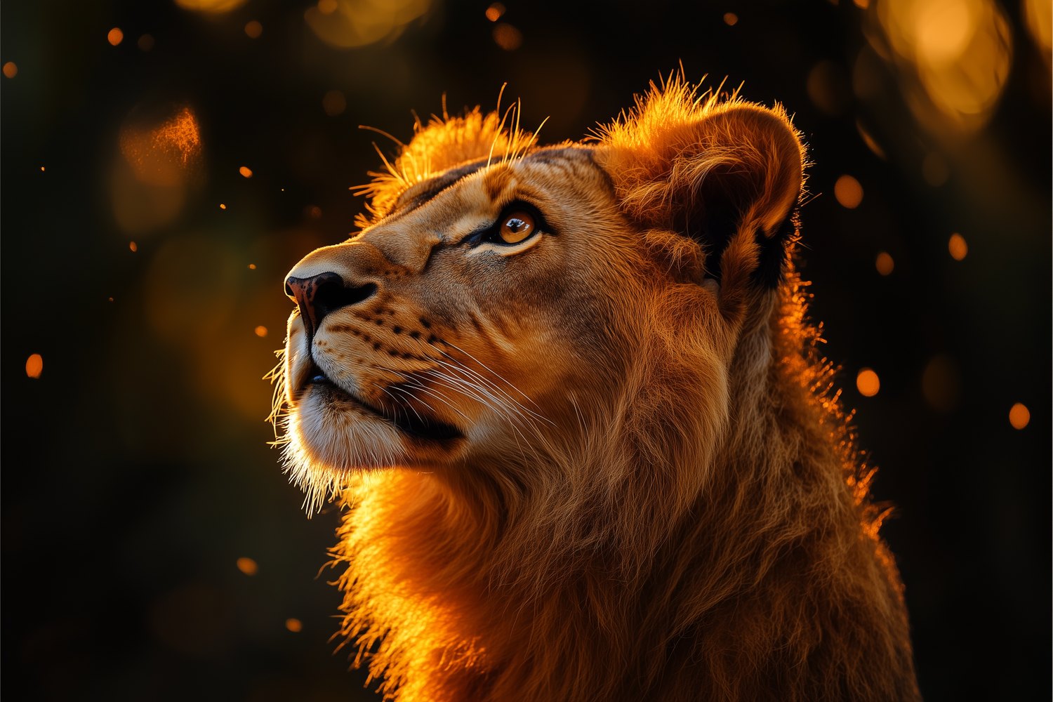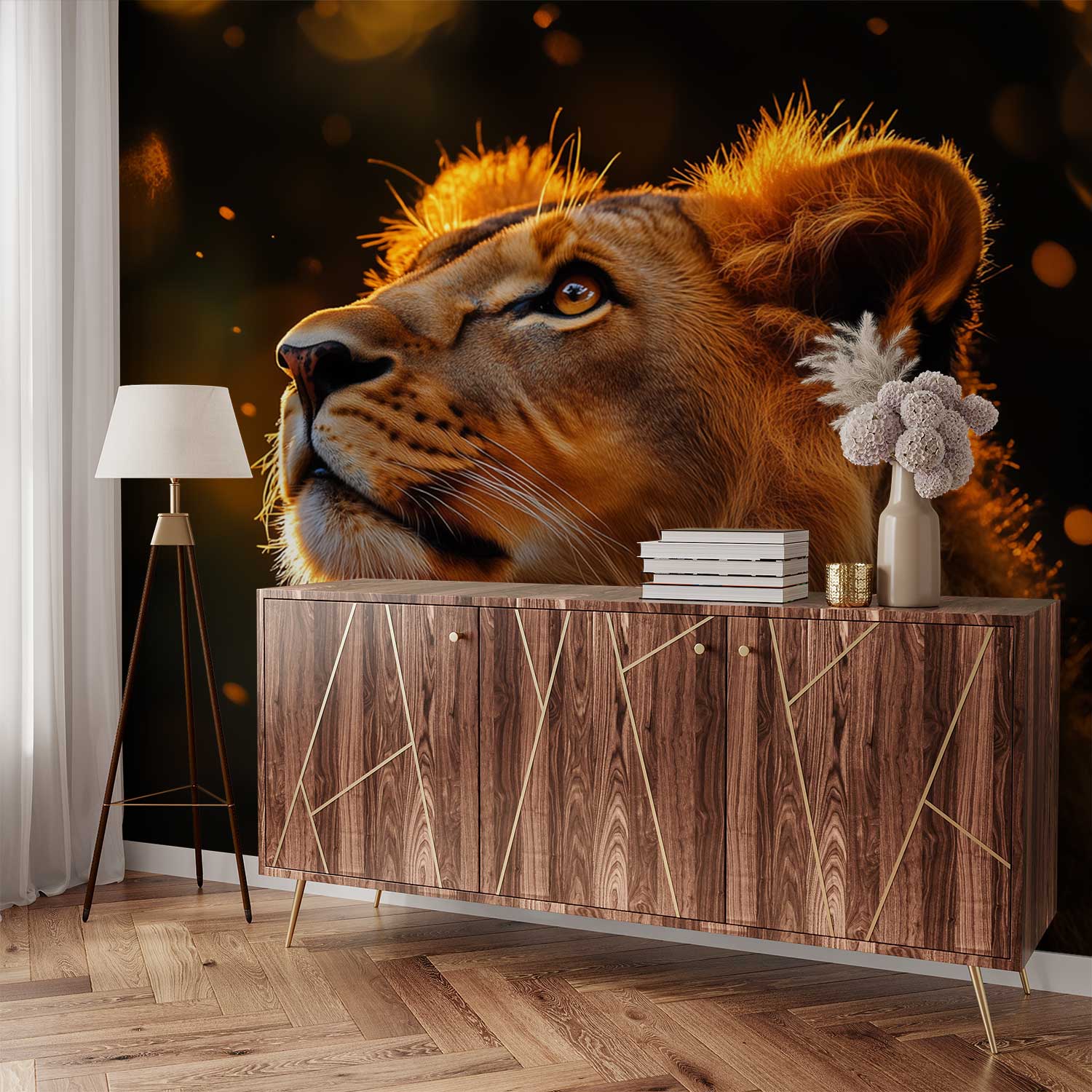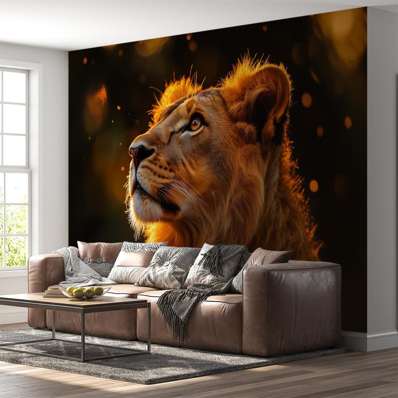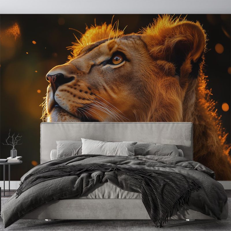 Gouden licht omarmt de trotse leeuw, wiens doordringende blik naar boven reikt. Zijn stralende manen fonkelen tegen een donkere achtergrond, vol alertheid en kracht. Deze muurdecoratie brengt wild elegance en dramatische diepte in je ruimte, ideaal als statement in een moderne woonkamer of studeerruimte.
