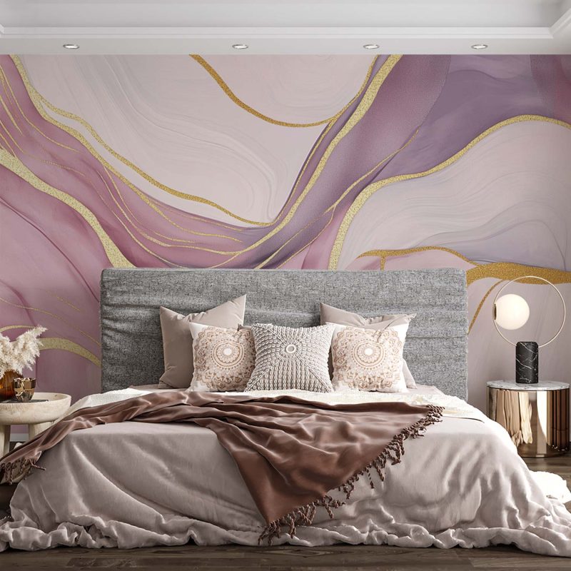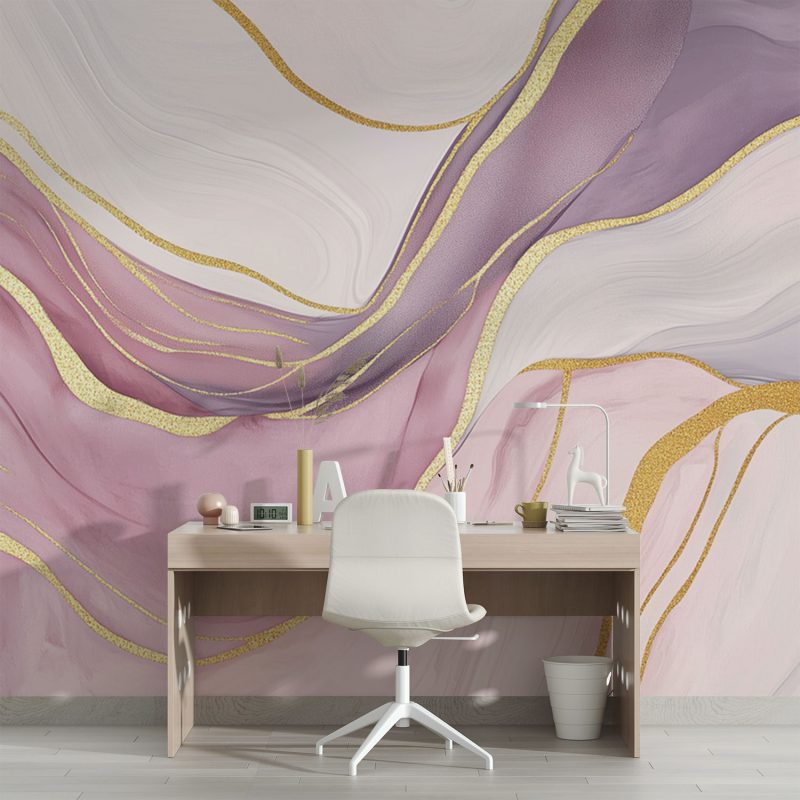 Dansende gouden lijnen kronkelen speels door een zee van roze en paarse tinten. Dit levendige abstracte patroon brengt elegantie en beweging in je ruimte, terwijl de warme kleuren een uitnodigende sfeer creëren. Perfect voor wie durft te spelen met luxe en creativiteit in het interieur.