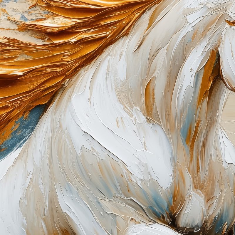 Gouden manen wapperen wild in de wind terwijl dit majestueuze witte paard vol kracht voorbij galoppeert. Zijn impressionistische verschijning straalt pure vrijheid uit en brengt dynamische energie in je ruimte. De sprankelende goudtinten contrasteren prachtig met het stralende wit, waardoor dit kunstwerk een statement maakt in moderne of klassieke interieurs. Een betoverend blikvanger dat elke muur transformeert tot een levendig tafereel vol beweging en elegantie.