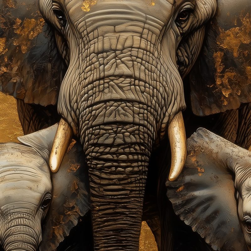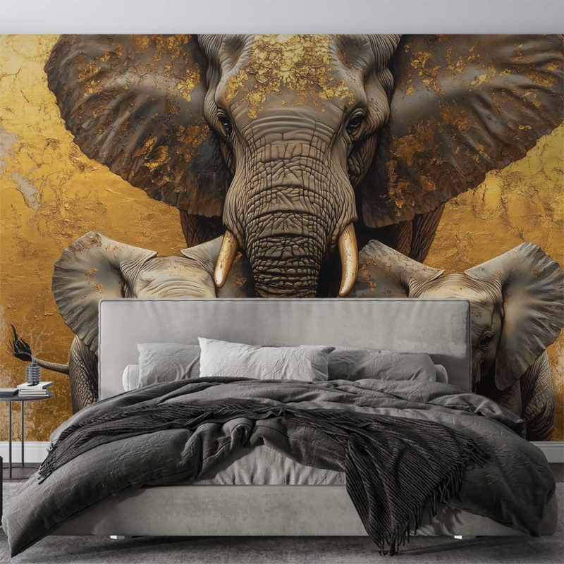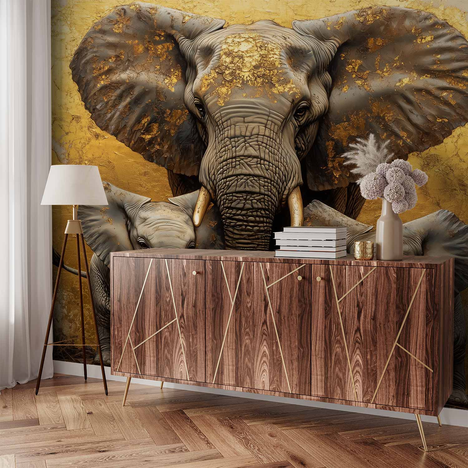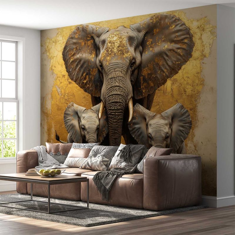 Gouden warmte omhult een imposante olifant geflankeerd door twee jongere metgezellen. Hun serene aanwezigheid straalt rust en majesteit uit terwijl ze zich aftekenen tegen de stralende achtergrond. Dit behang brengt een gevoel van waardigheid en natuurlijke harmonie in je ruimte, perfect voor een rustgevende en stijlvolle sfeer.
