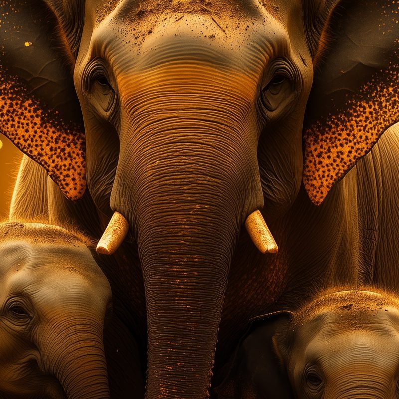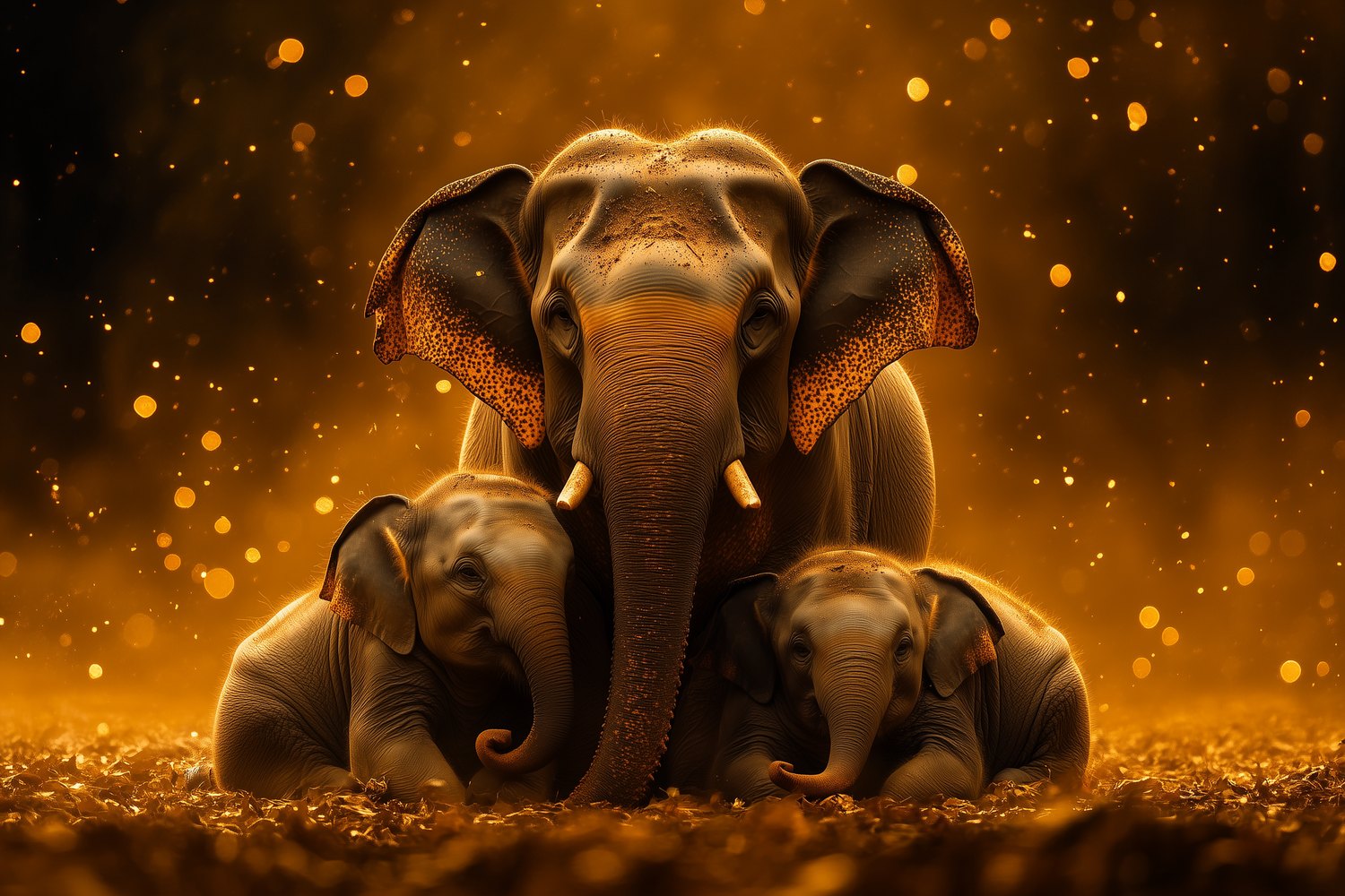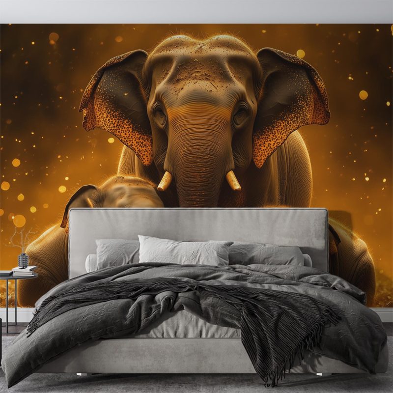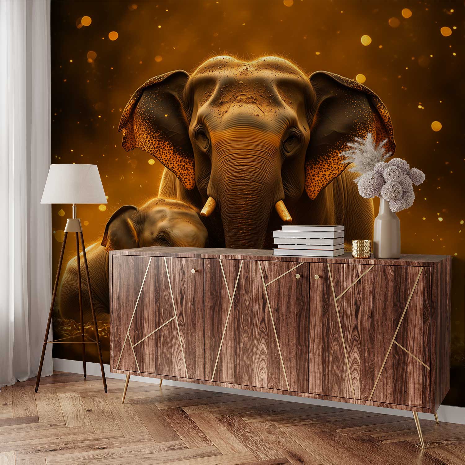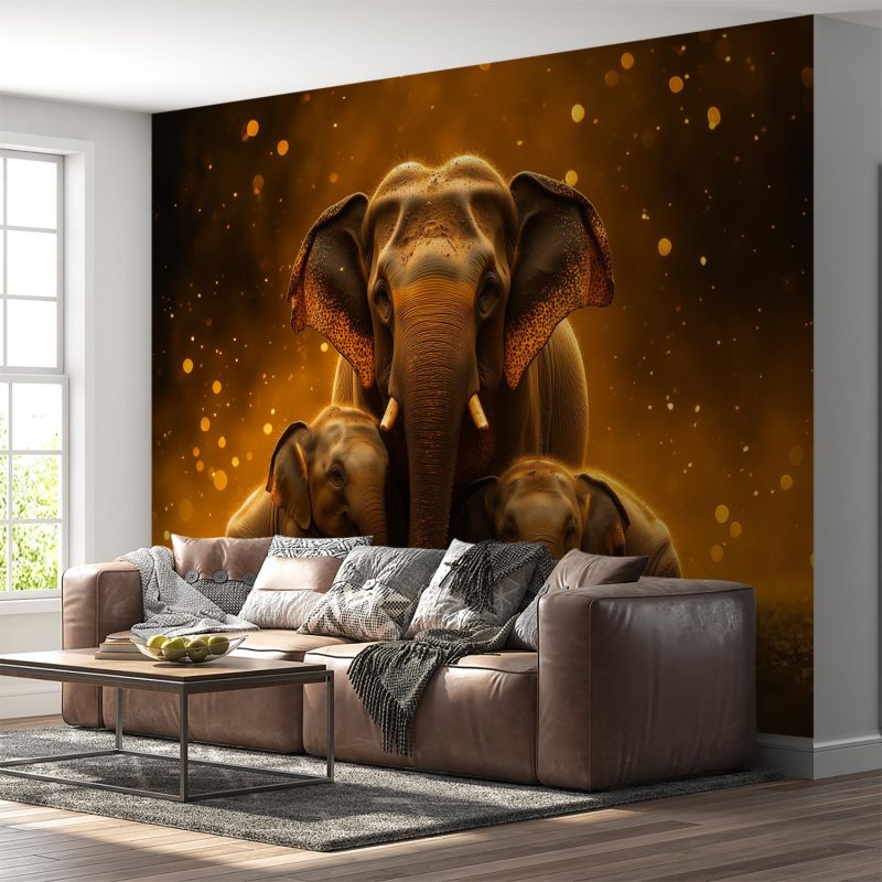 Gouden licht omhult dit olifantengezin in een warme gloed. Drie generaties schuiven dicht tegen elkaar aan, een tafereel vol tederheid en verbondenheid. Hun serene poses stralen pure liefde en bescherming uit. Dit behang brengt een hartverwarmende sfeer in je interieur, perfect voor een ruimte waar samenzijn en geborgenheid centraal staan.