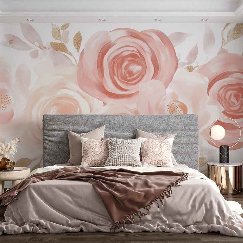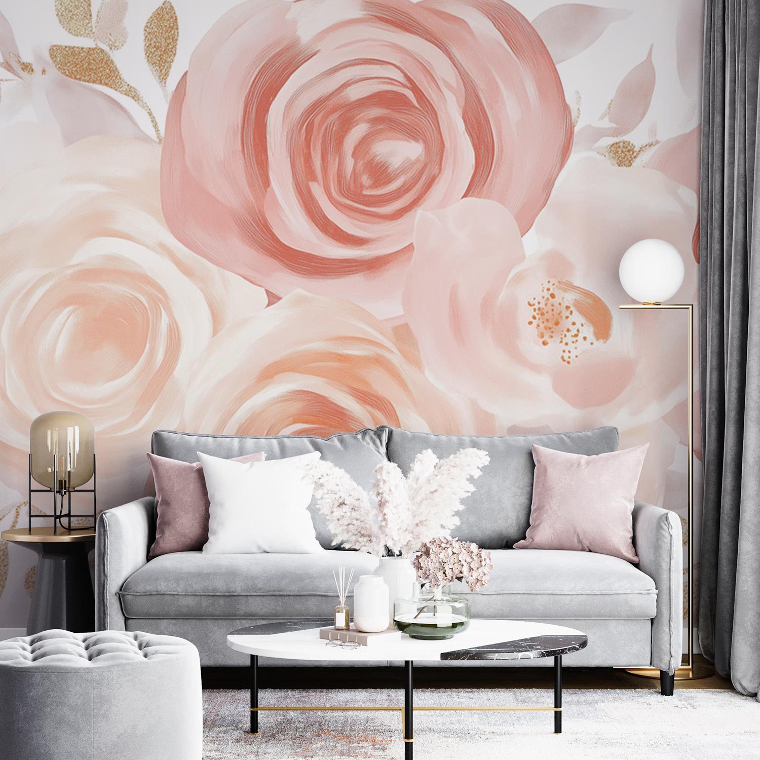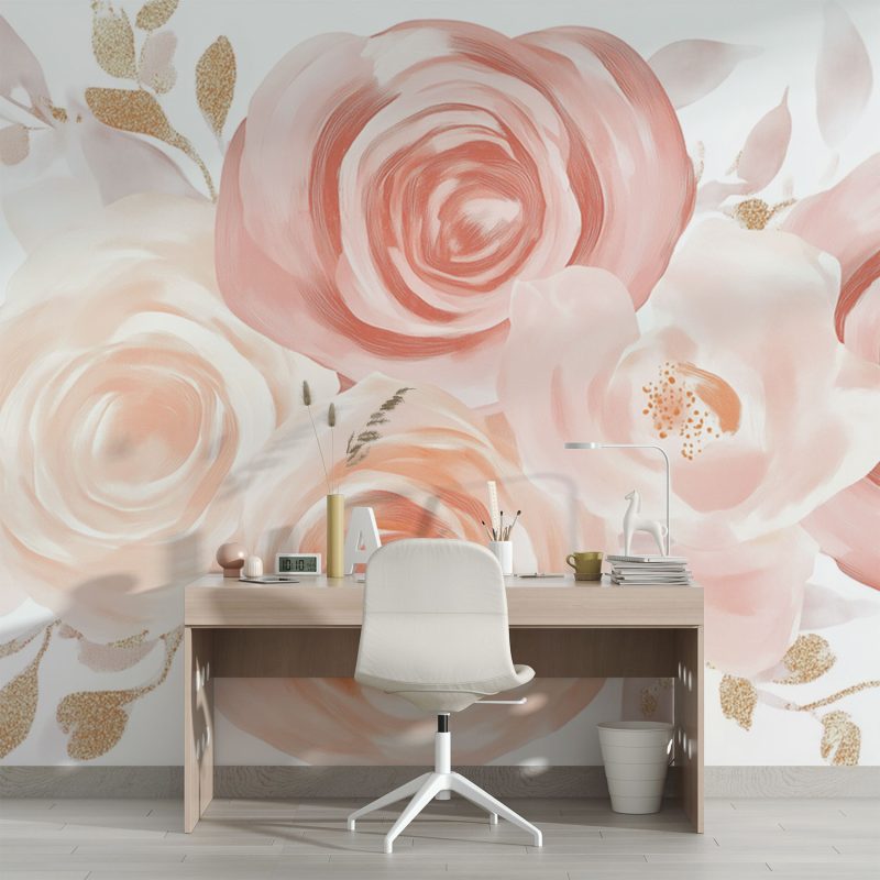 Zachte roze en witte rozen dansen in een harmonieuze cirkel, verrijkt met gouden accenten die elegantie uitstralen. Dit levendige bloemenmotief brengt een serene romantische sfeer in elke ruimte, waar de uitgebalanceerde compositie rust en liefde uitstraalt. Perfect voor interieurs die verfijning zoeken, het behang voegt een tijdloze zachtheid toe die zowel kalmeert als inspireert.