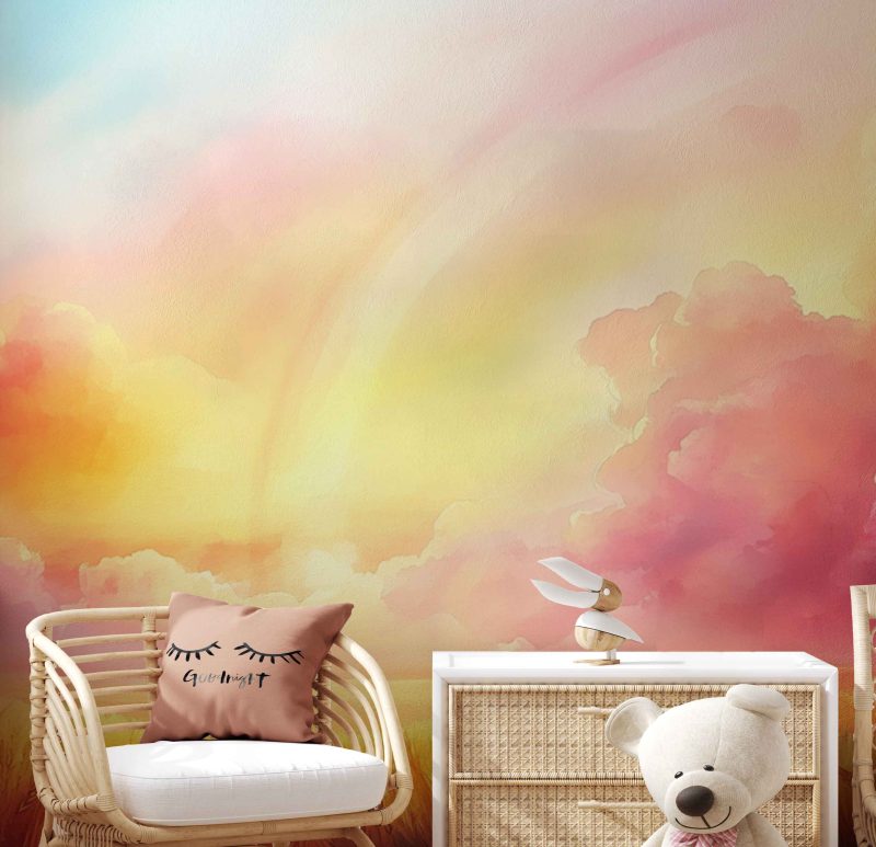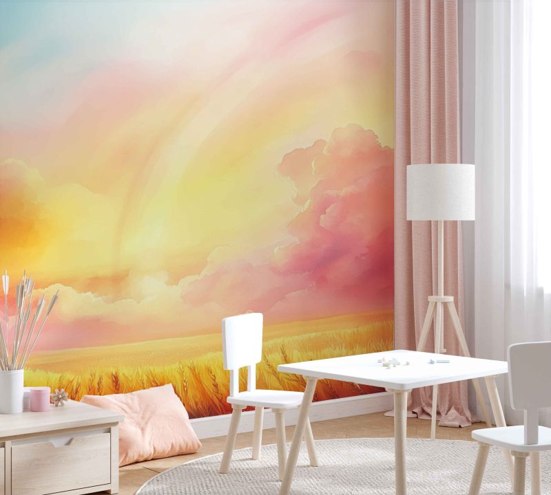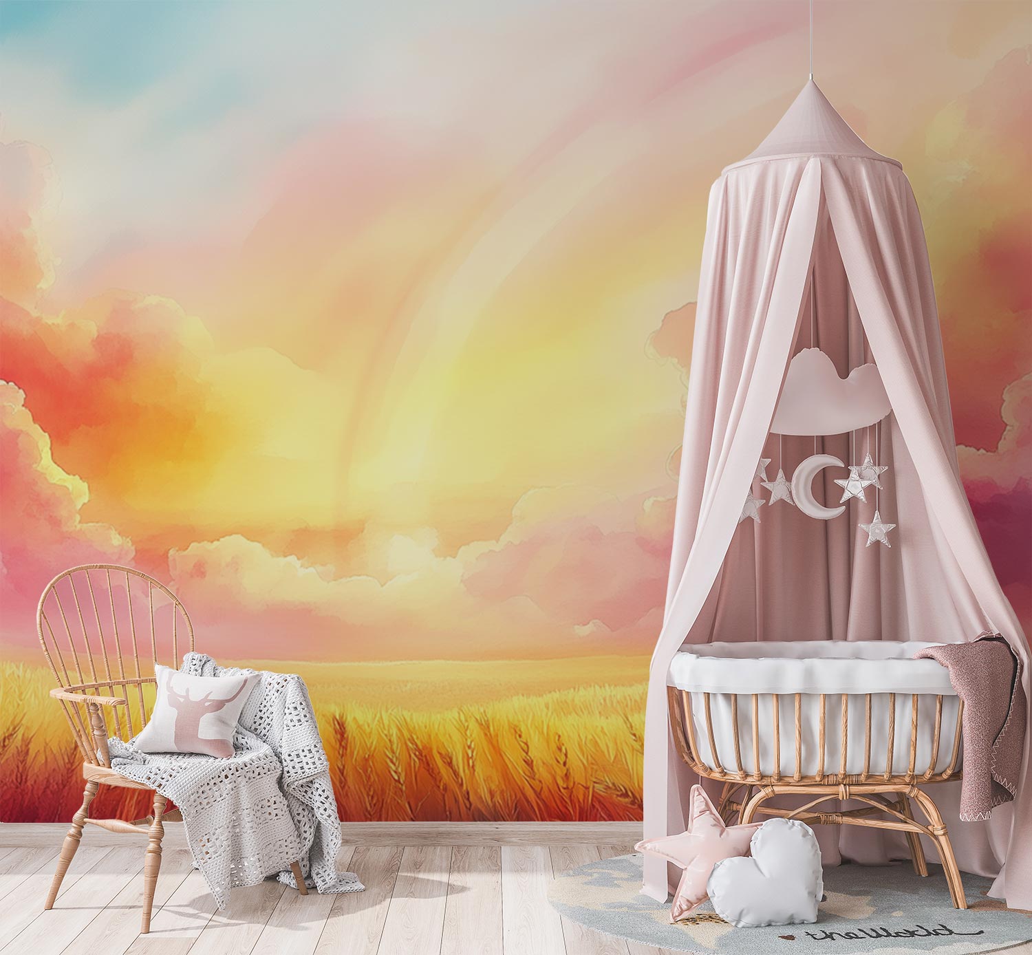 Zachte roze en oranje wolken dansen in de lucht terwijl de zon een gouden gloed over het golvende graanveld werpt. Dit levendige landschap brengt oneindige warmte en rust, perfect voor dromerige momenten. De harmonieuze kleuren en vredige sfeer stimuleren de verbeelding en creëren een veilige, idyllische wereld waar kinderfantasie tot leven komt.