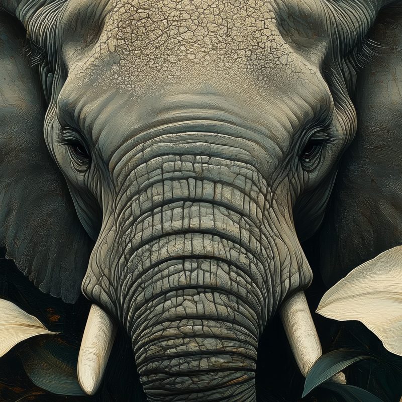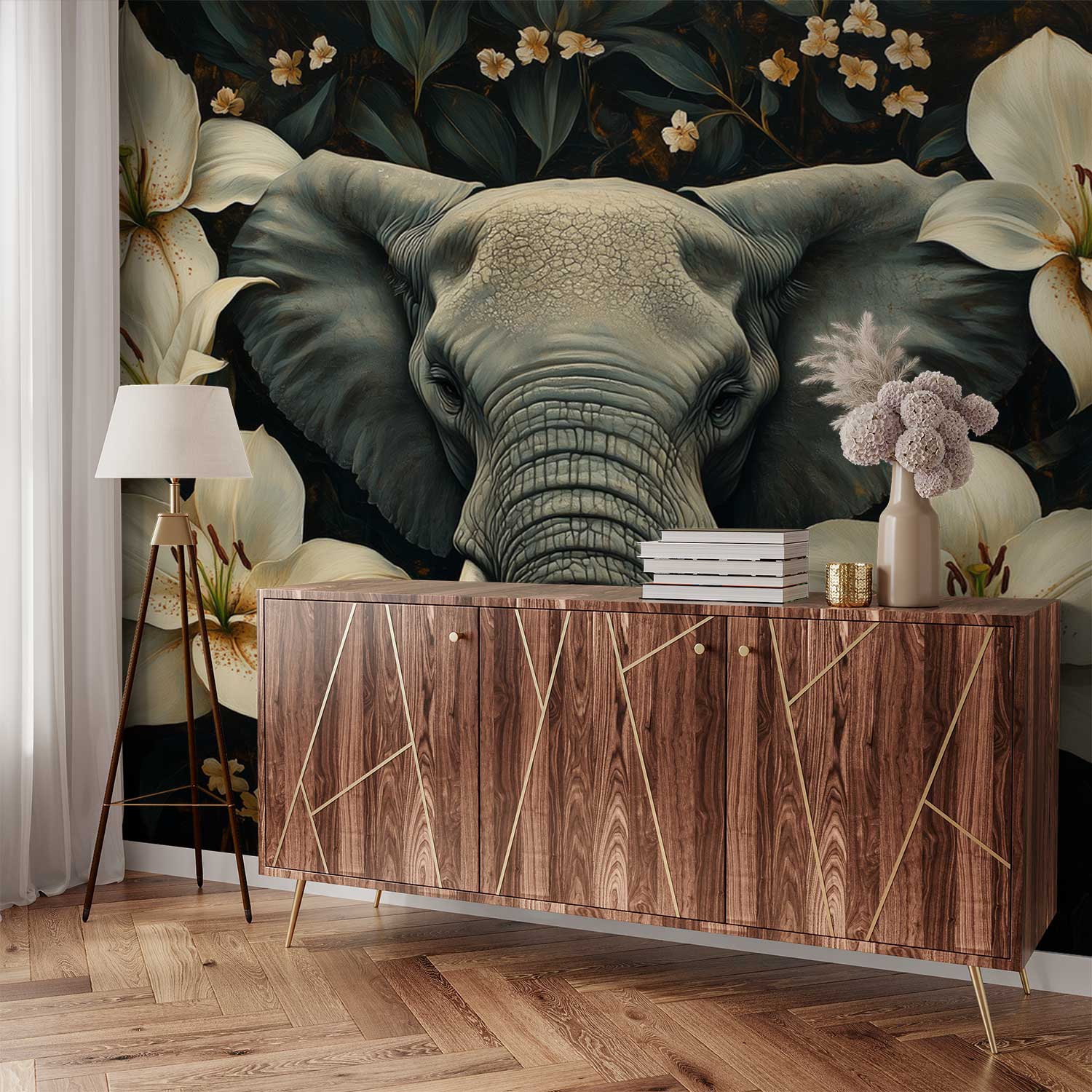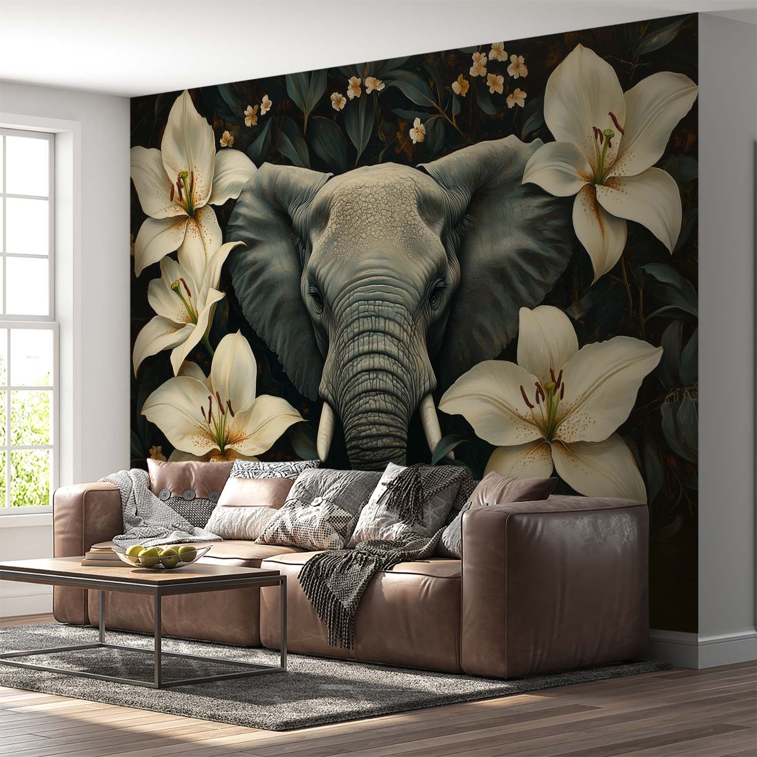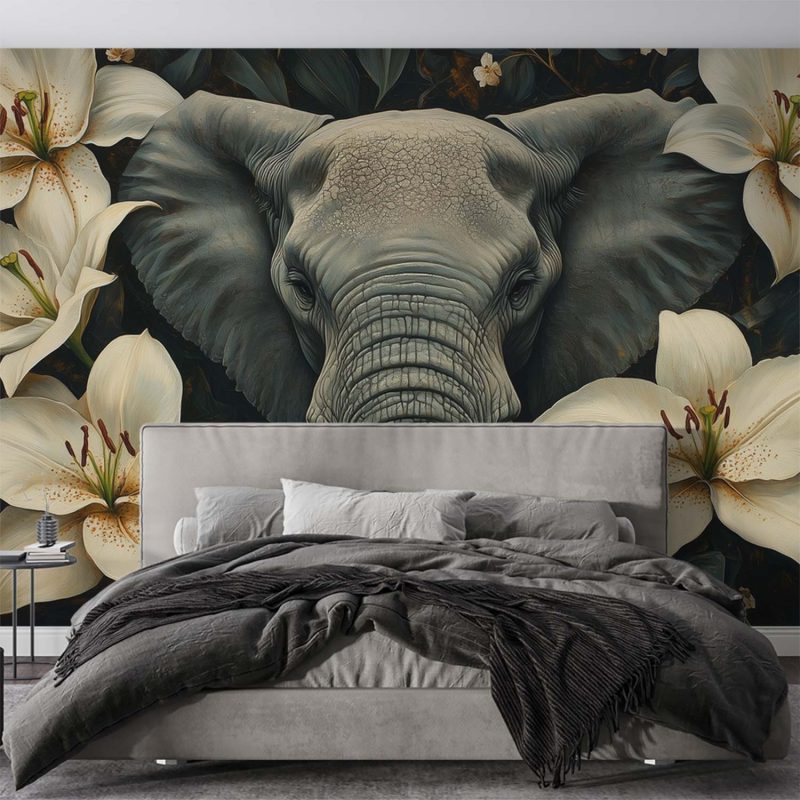 Grijze olifant tussen bloemen behang