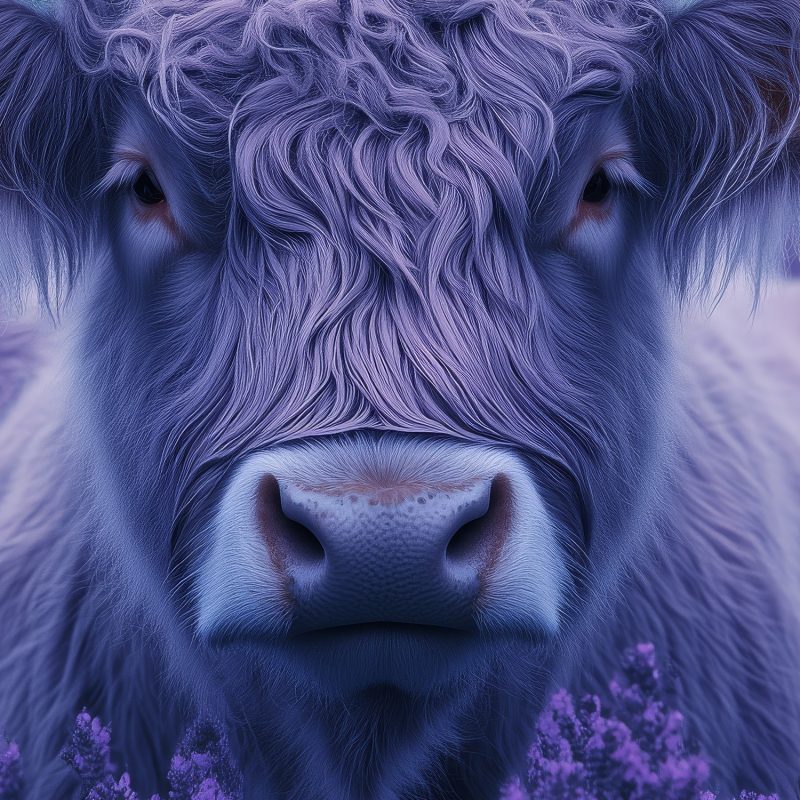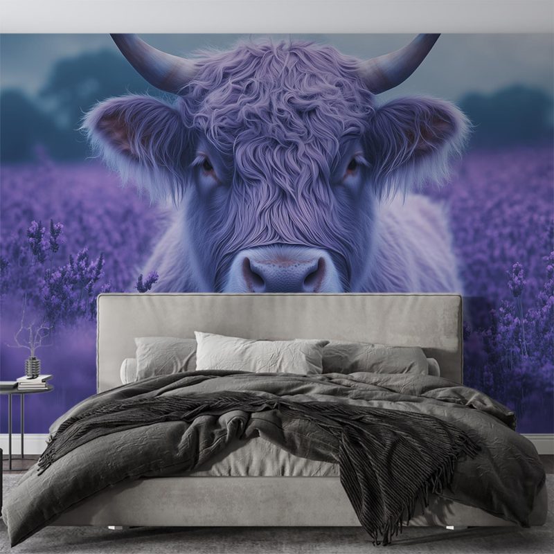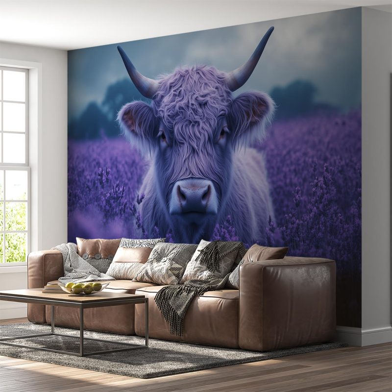 Violette bloemen golven zacht rond de statige koe met weelderige horens. Haar kalme blik domineert het tafereel, omringd door een zee van paarse bloesems die prachtig contrasteren met haar gevlekte vacht. Deze rustgevende scène brengt de sereniteit van de natuur naar binnen, perfect voor een ruimte die verlangt naar harmonie en natuurlijke schoonheid.
