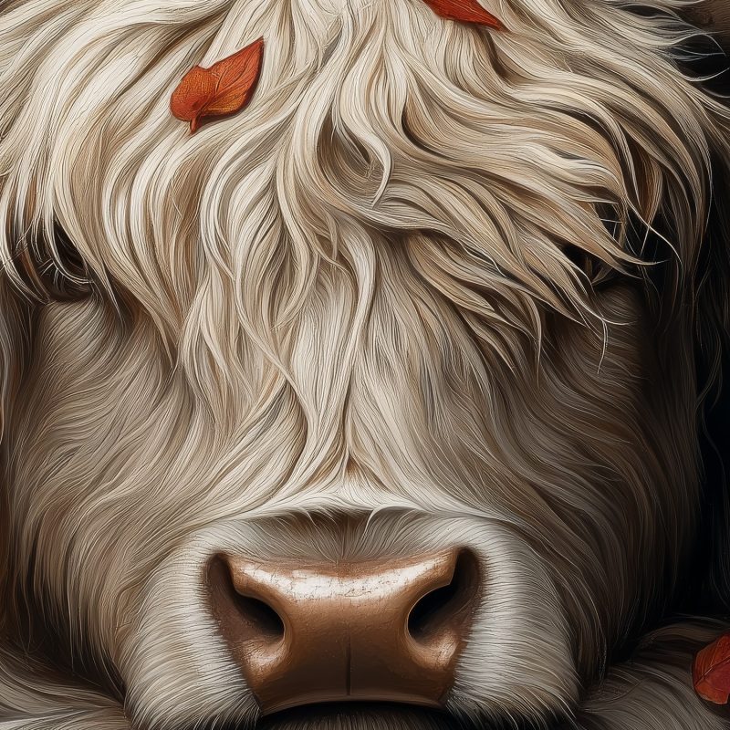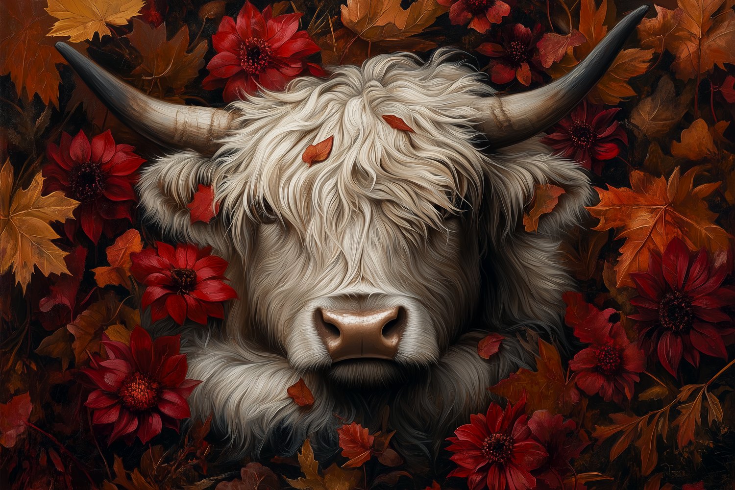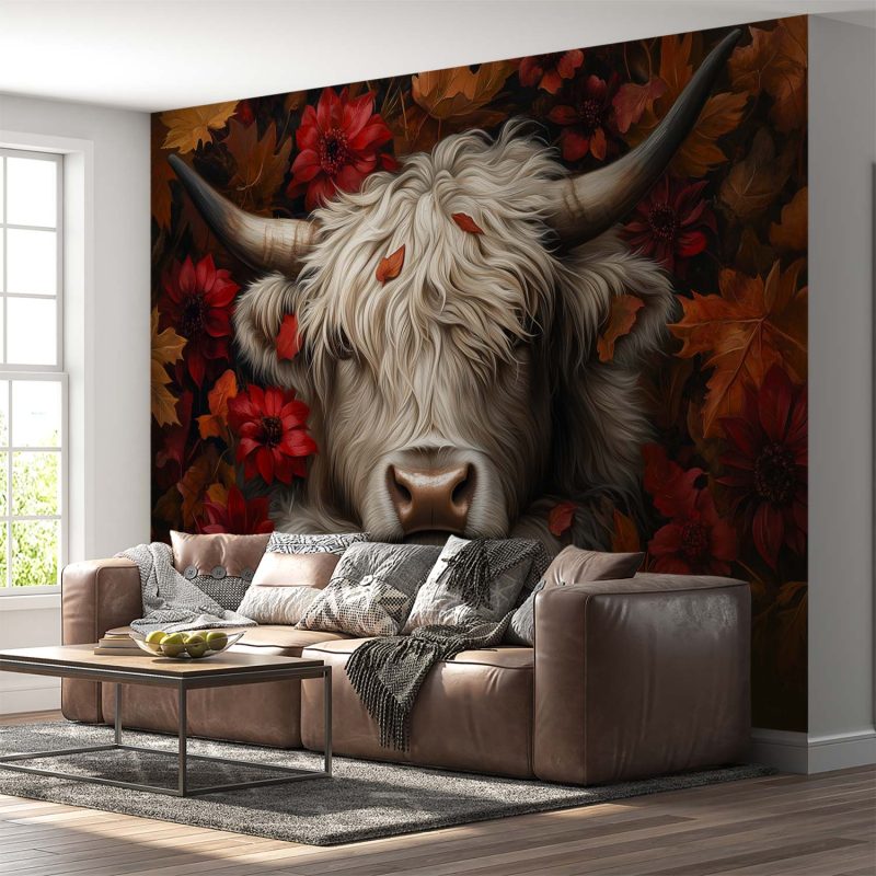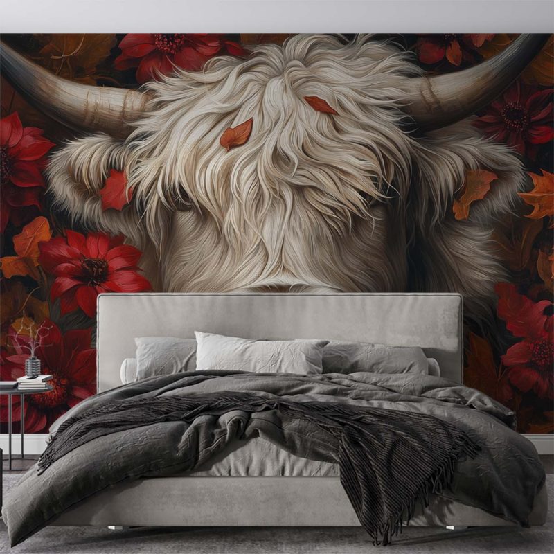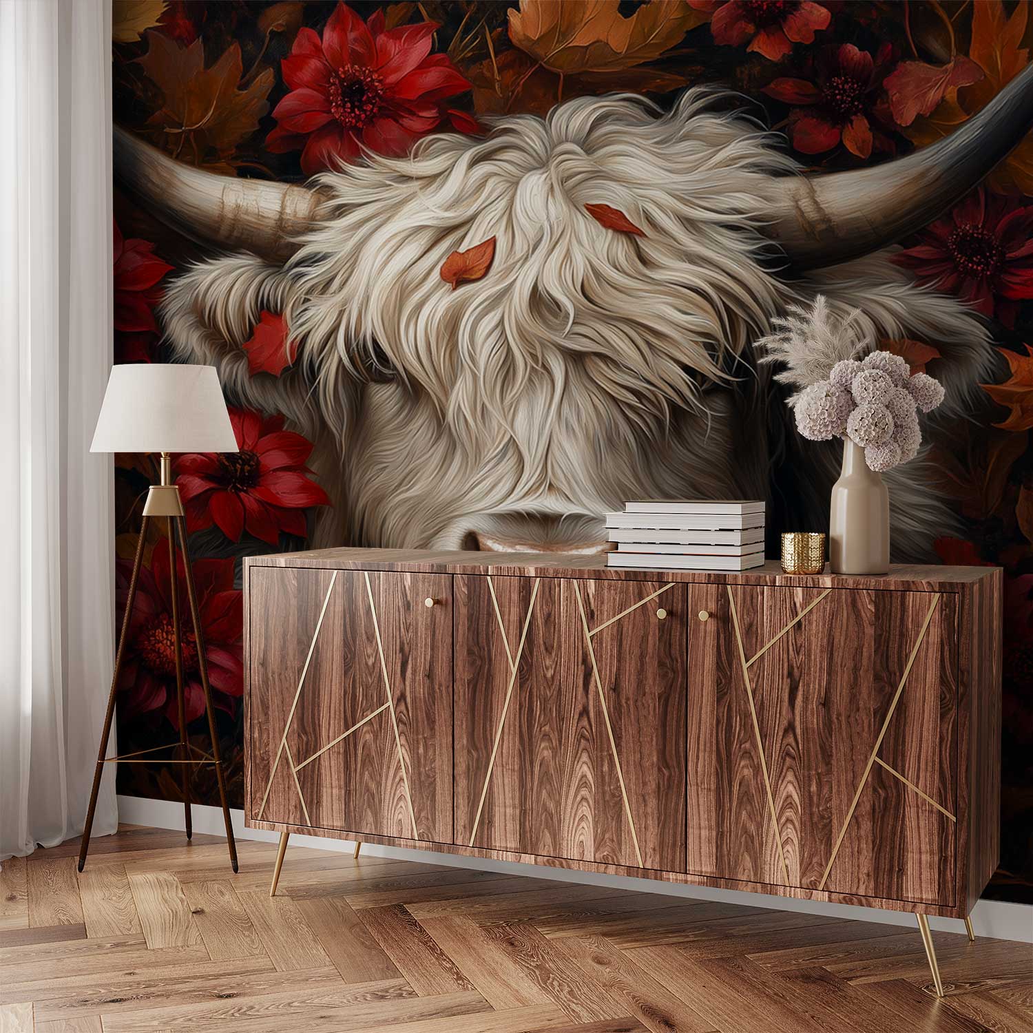 Warme herfsttonen dansen rond een statige witte koe met indrukwekkende horens. Levendige rode bloemen en goudoranje bladeren omarmen het dier in een harmonieus tafereel. Deze rustgevende scène brengt de serene energie van de natuur naar binnen, perfect voor een accentmuur die zowel kalmeert als inspireert.