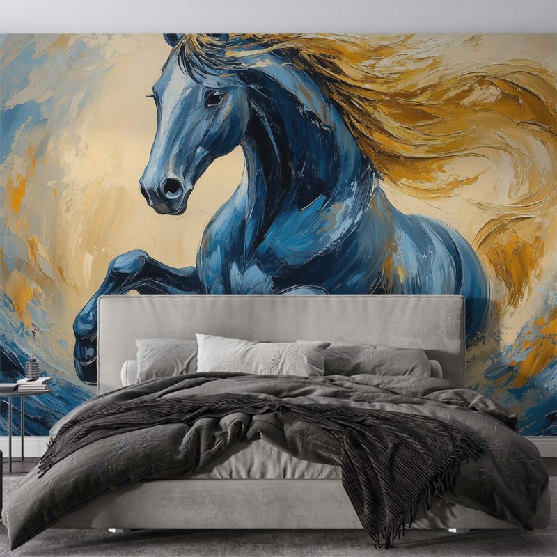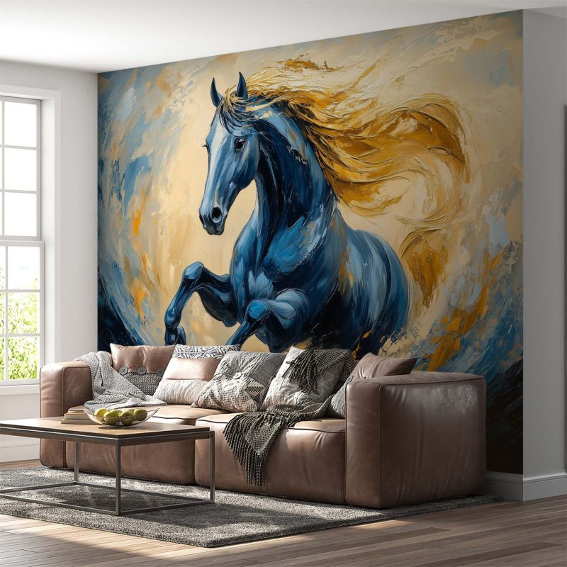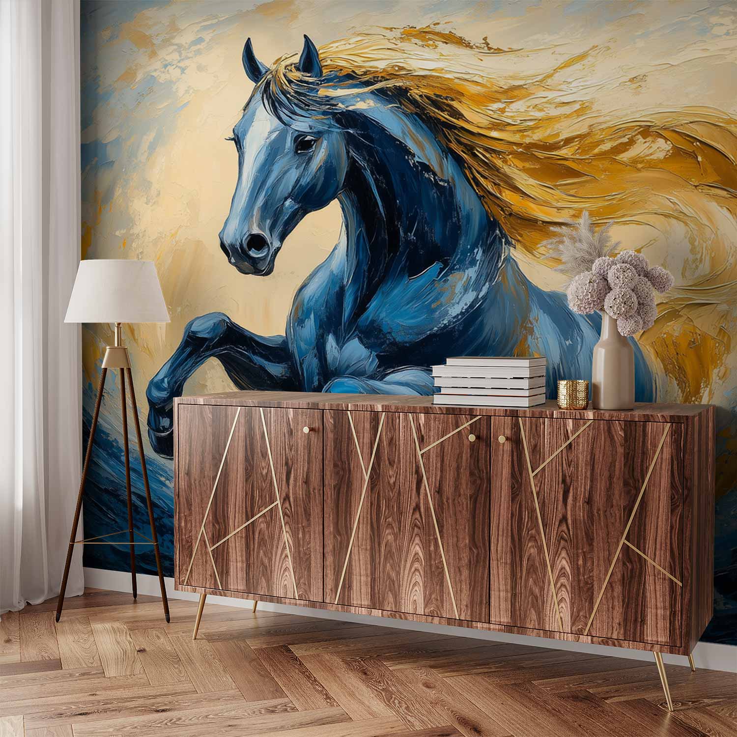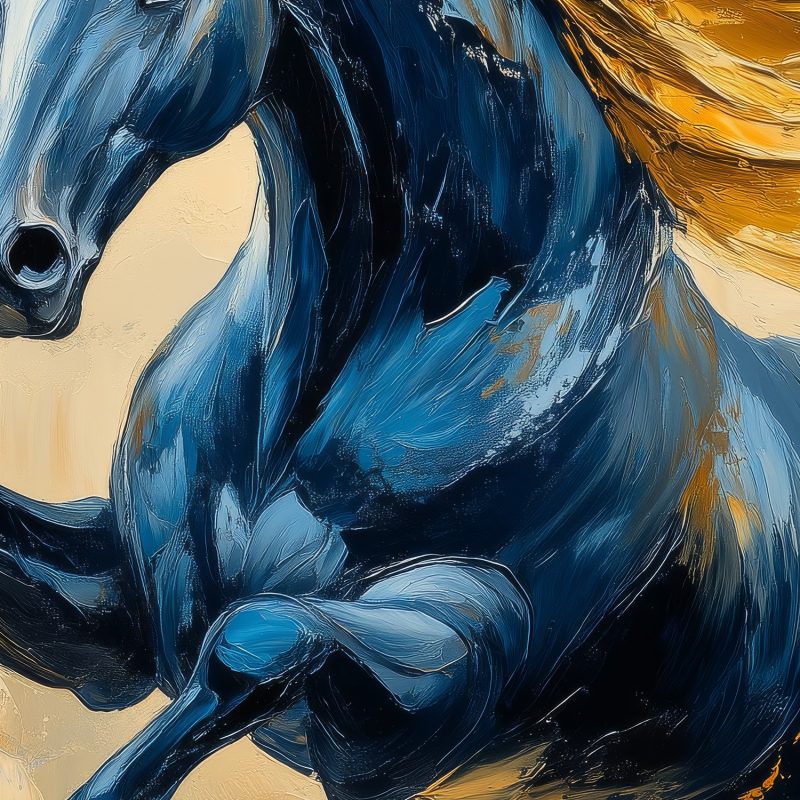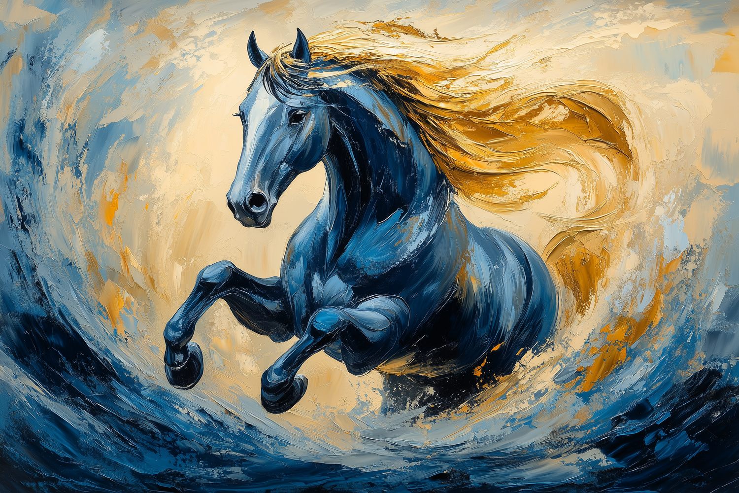 Vlugge penseelstreken vangen een galopperend blauw paard, omringd door wervelende tinten geel en blauw. Dit krachtige tafereel straalt pure energie en vrijheid uit. De impressionistische stijl brengt beweging en drama in elke ruimte, perfect voor wie verlangt naar een statement vol dynamiek en wilden schoonheid.