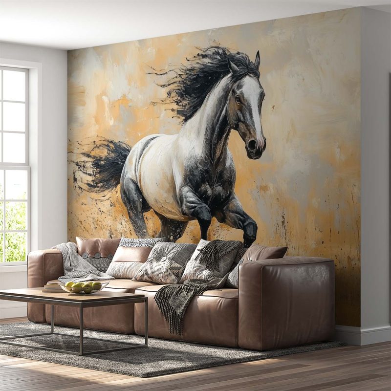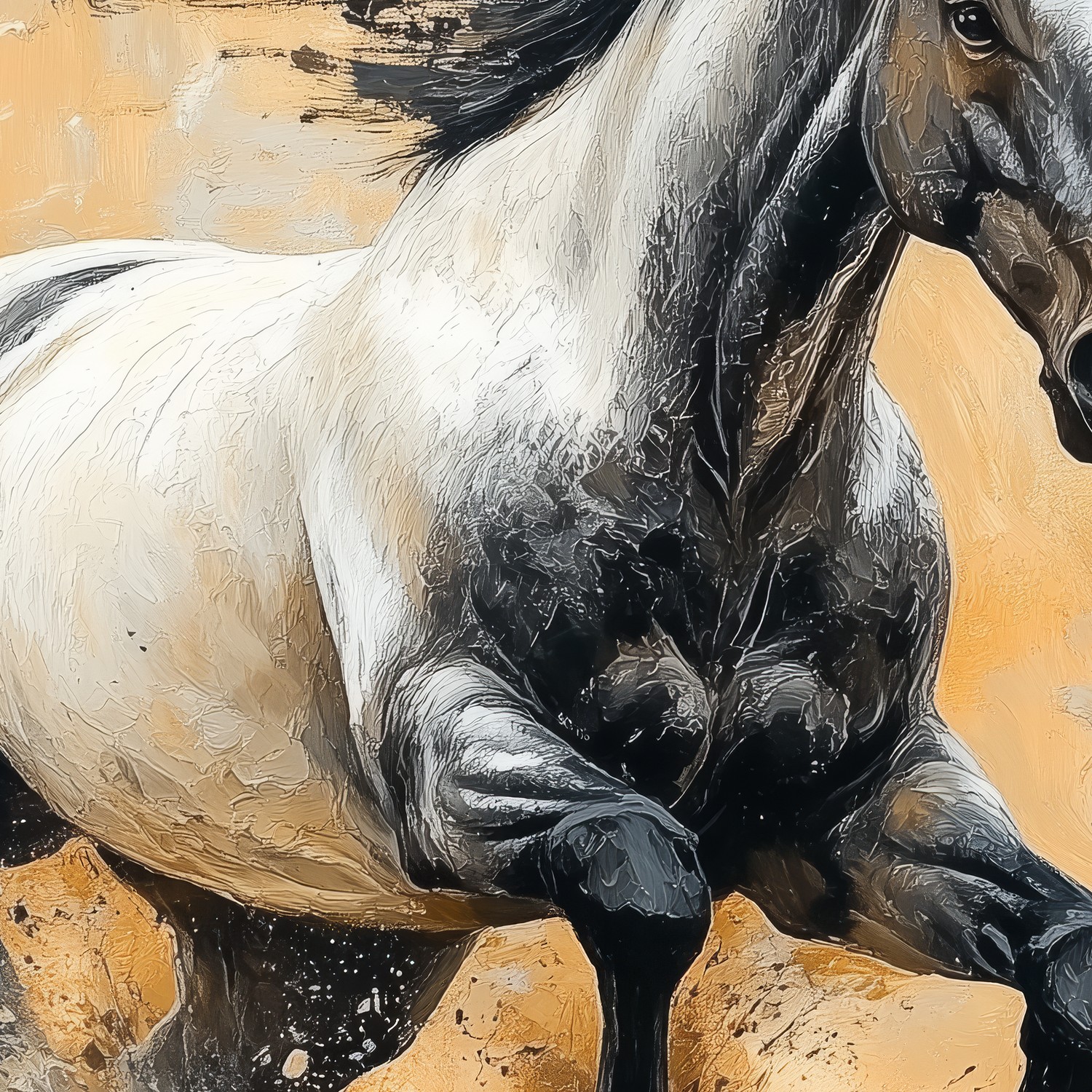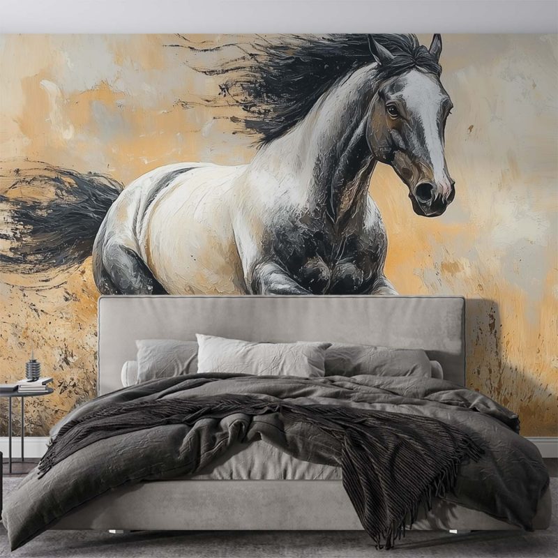 Vurige energie spat van dit zwart witte paard dat in volle galop door het landschap raast. Losse penseelstreken in warme oranje en bruine tinten vangen de dynamische beweging, terwijl de wazige achtergrond alle aandacht op het dier vestigt. Dit krachtige statement brengt vrijheid en beweging in je interieur, perfect voor een moderne ruimte die durf en emotie omarmt.