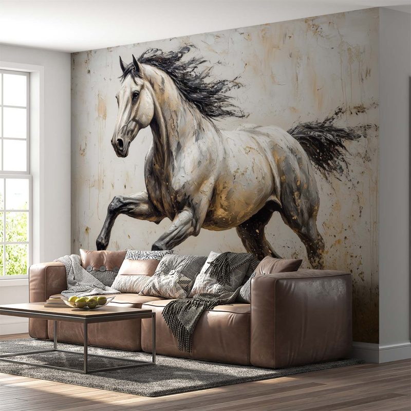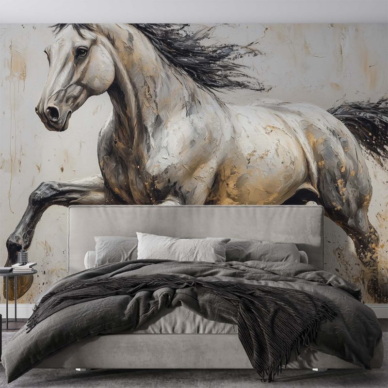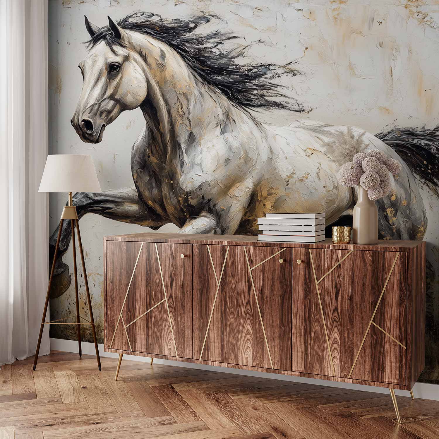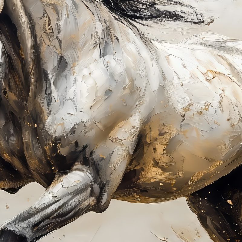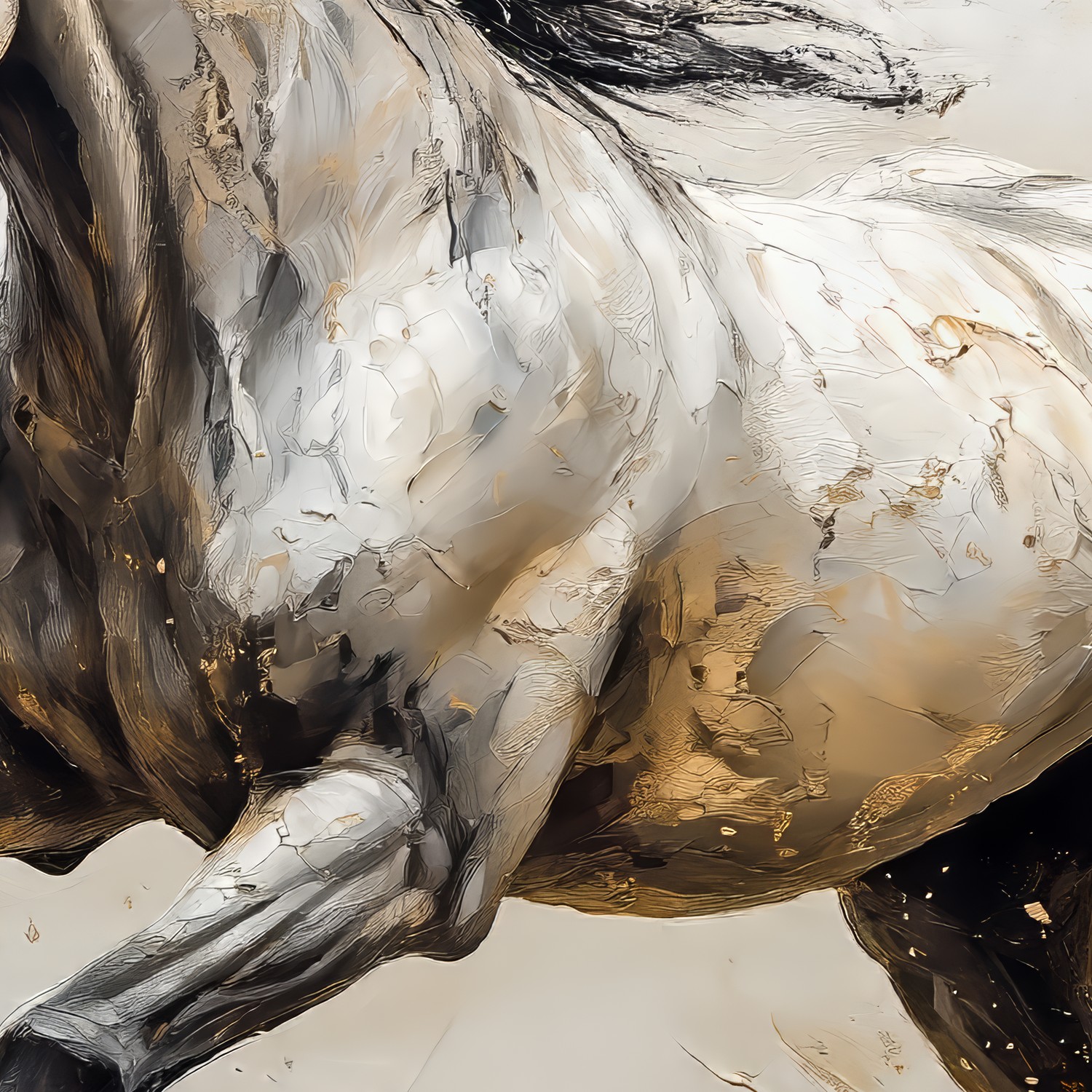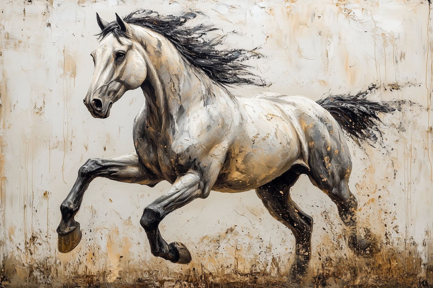 Vloeiende penseelstreken vangen de wilde energie van een galopperend paard. Zijn witte lijf baant zich een weg door de ruimte, omgeven door een zwarte manen die dansen in de wind. Gouden accenten versterken de diepte en kracht van dit majestueuze dier. Breng dynamiek en een gevoel van vrijheid in je interieur met dit levendige statement, perfect om energie en elegantie toe te voegen aan elke muur.