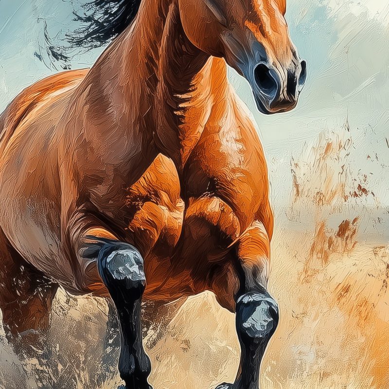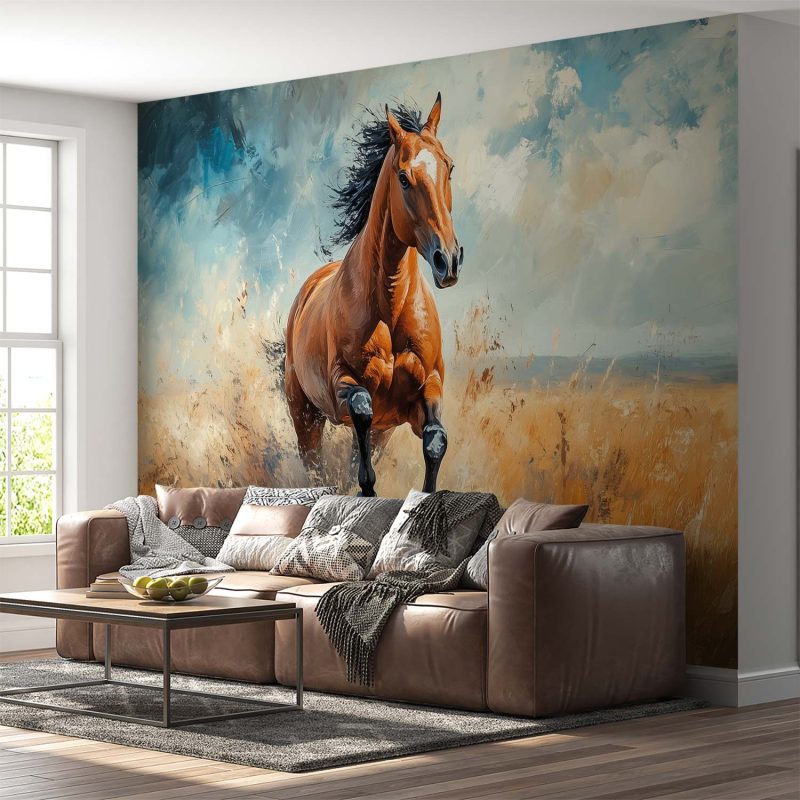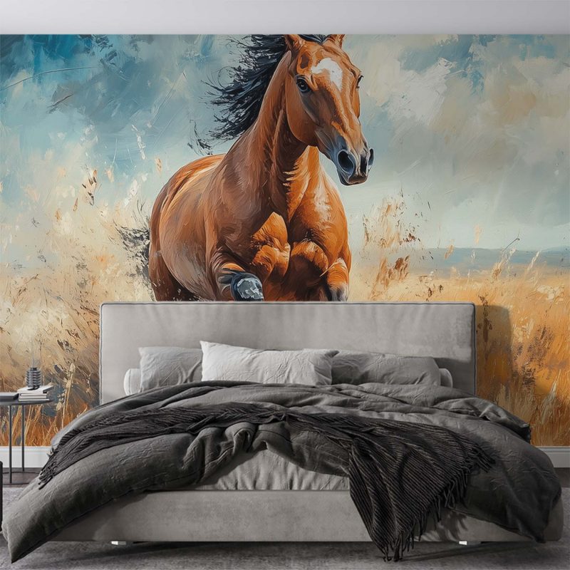 Vloeiende penseelstreken vangen de krachtige galop van een bruin paard door gouden gras. Zijn manen wapperen in de wind, omringd door een zee van warme aardetinten. Deze impressionistische scène ademt vrijheid en energie. Perfect voor een levendig accent in je interieur, waar het dynamiek en natuurlijke elegantie brengt zonder de ruimte te overheersen.