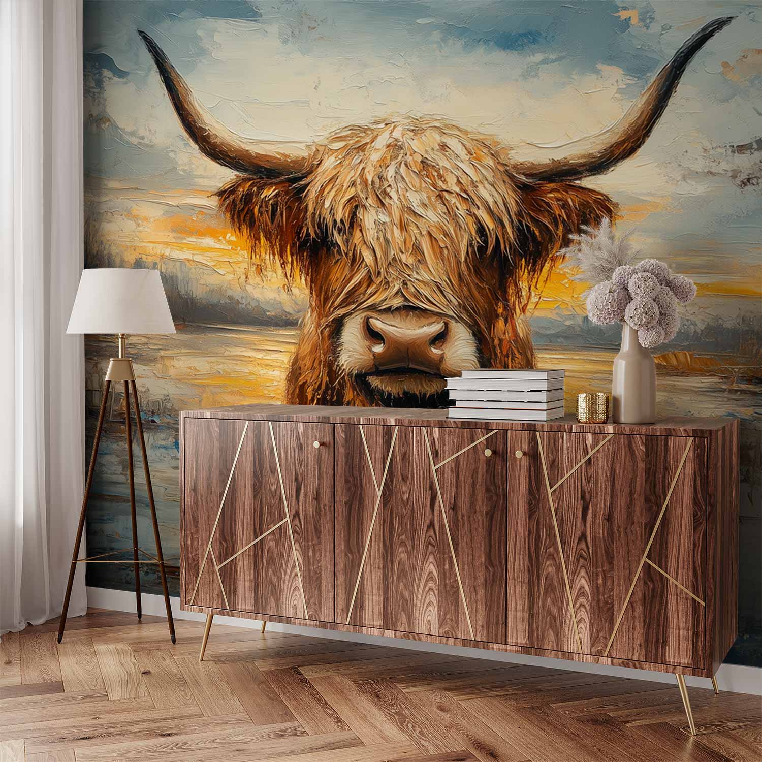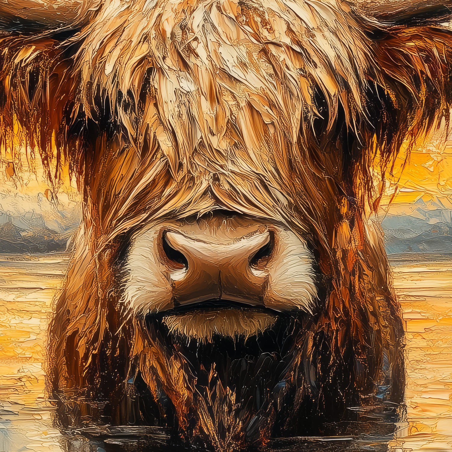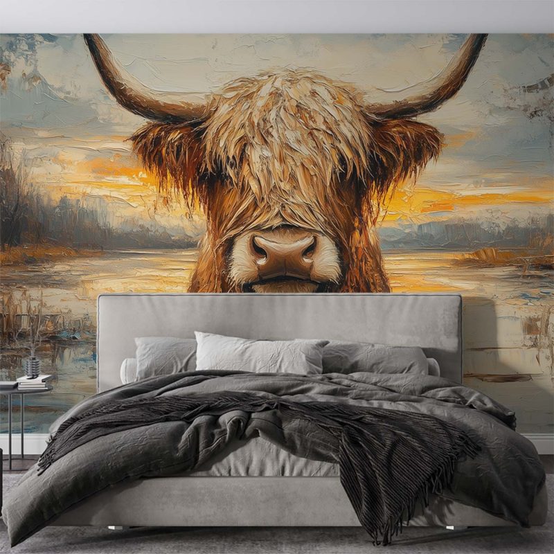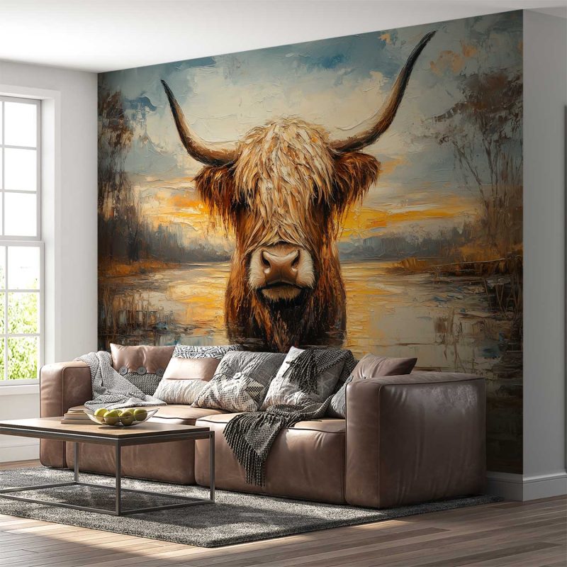 Tranquille blauwe wateren omarmen een imposante stier met weelderige vacht en majestueuze horens. Zijn aardse tinten harmoniëren met het impressionistische landschap, waar vloeiende penseelstreken een serene sfeer vangen. Dit levendige tafereel brengt rust en natuurlijke elegantie in je interieur, als een poëtisch accent dat zowel kracht als kalme schoonheid uitstraalt.