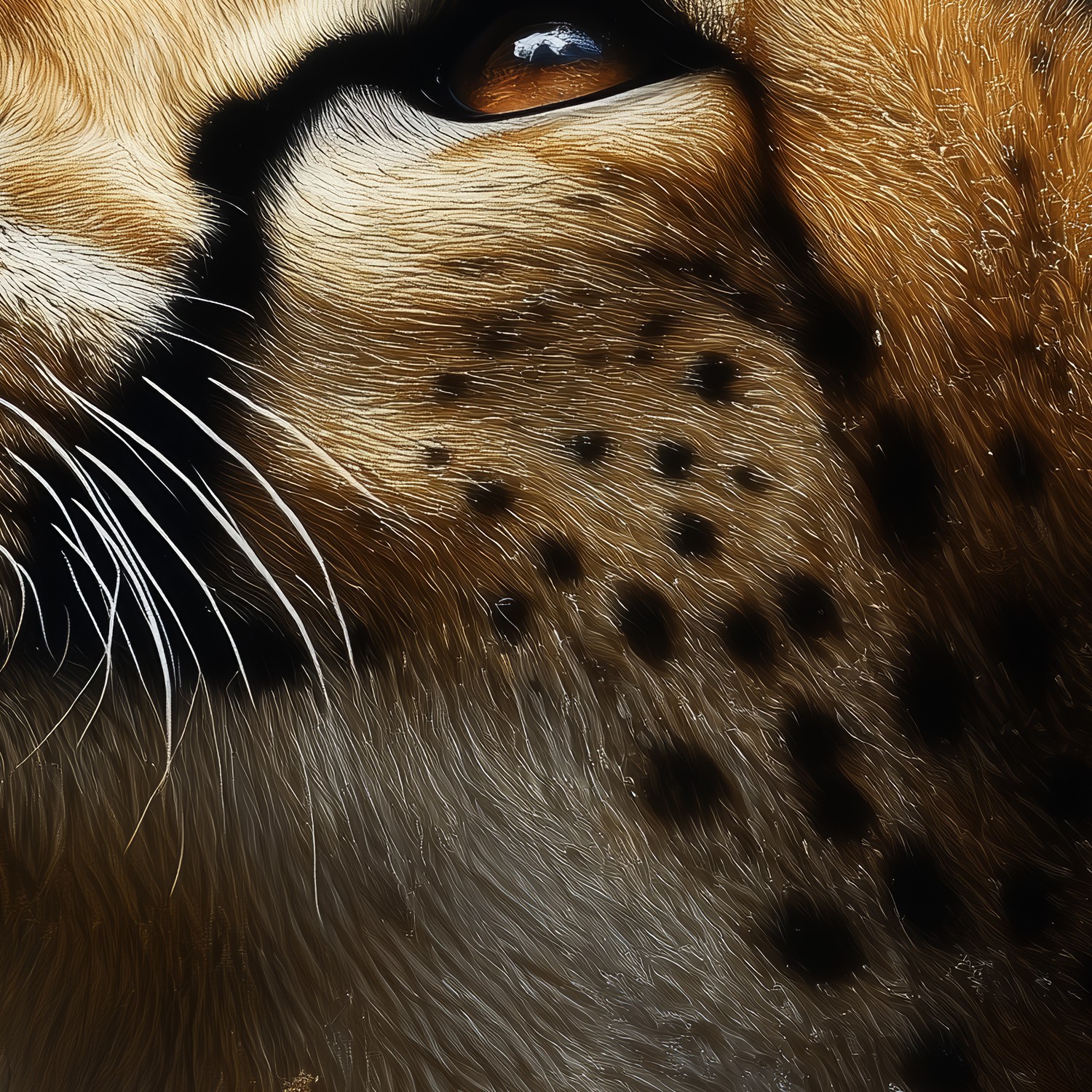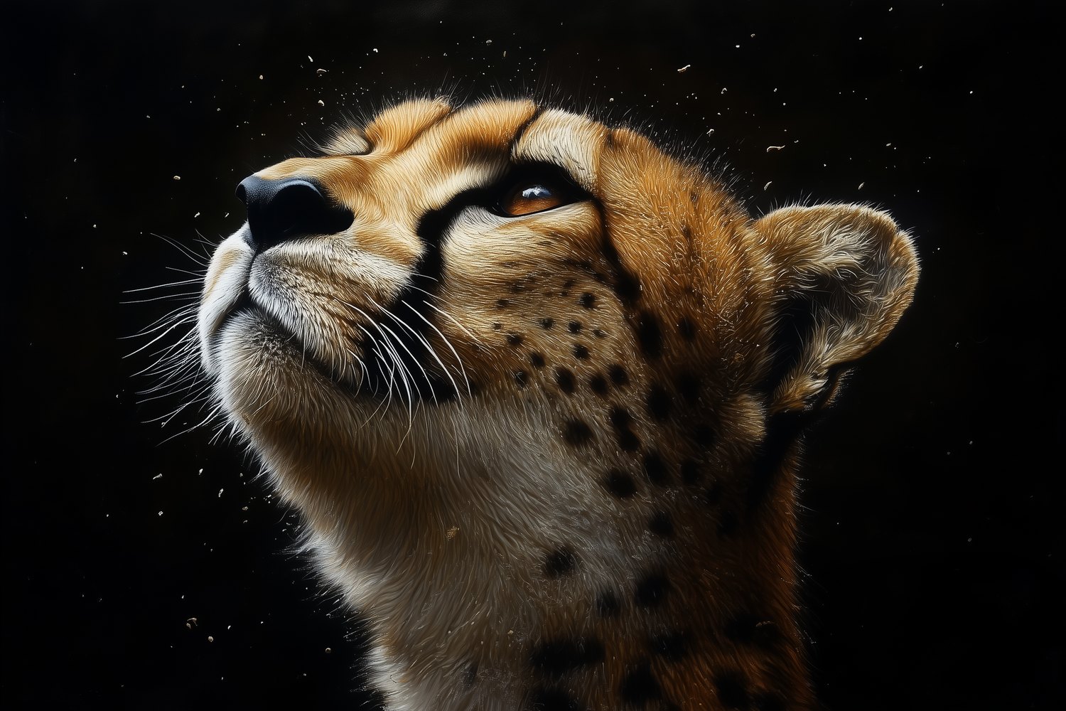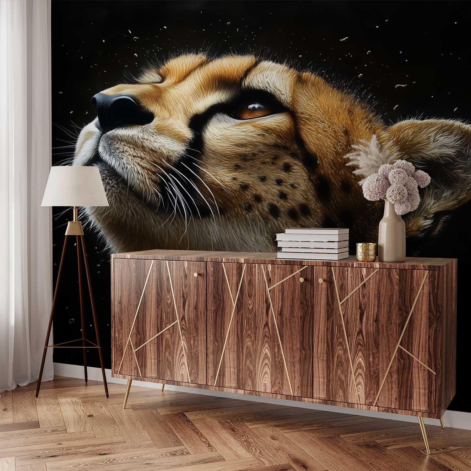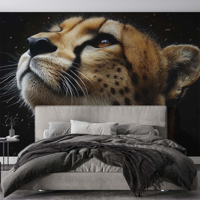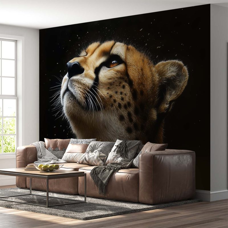 Krachtige blik vol verwondering, dit jachtluipaard komt tot leven in je interieur. Zijn vacht vol warme tinten en contrasterende vlekken dansen voor een donkere achtergrond. De expressieve kop straalt majesteitelijke energie uit en brengt een wild, elegant statement in je ruimte. Dit behang transformeert elke muur in een kunstwerk vol mysterie en natuurlijke schoonheid.