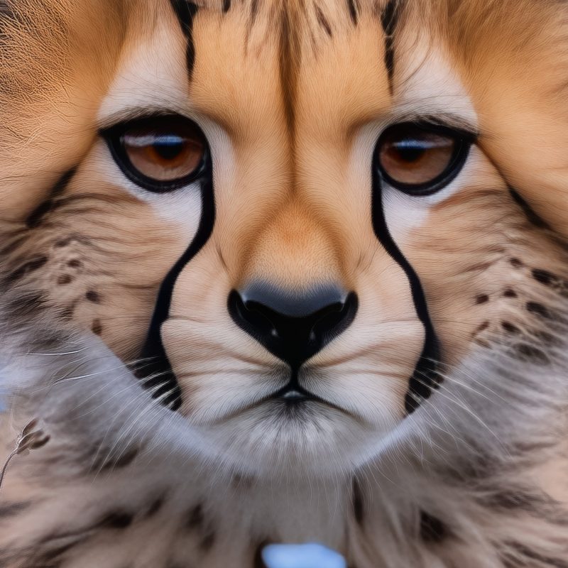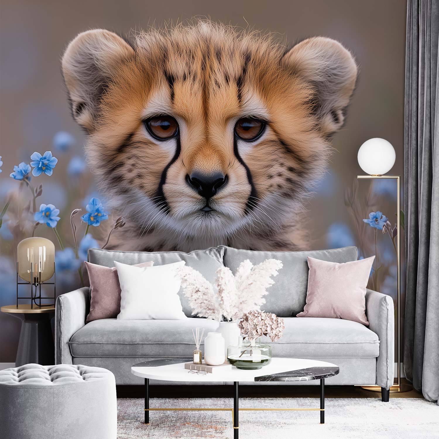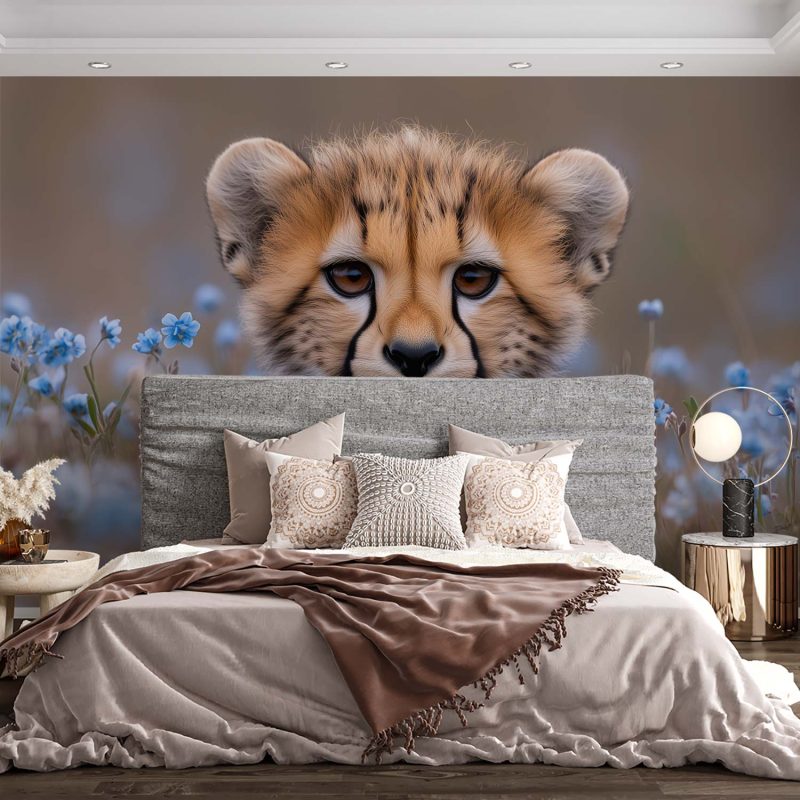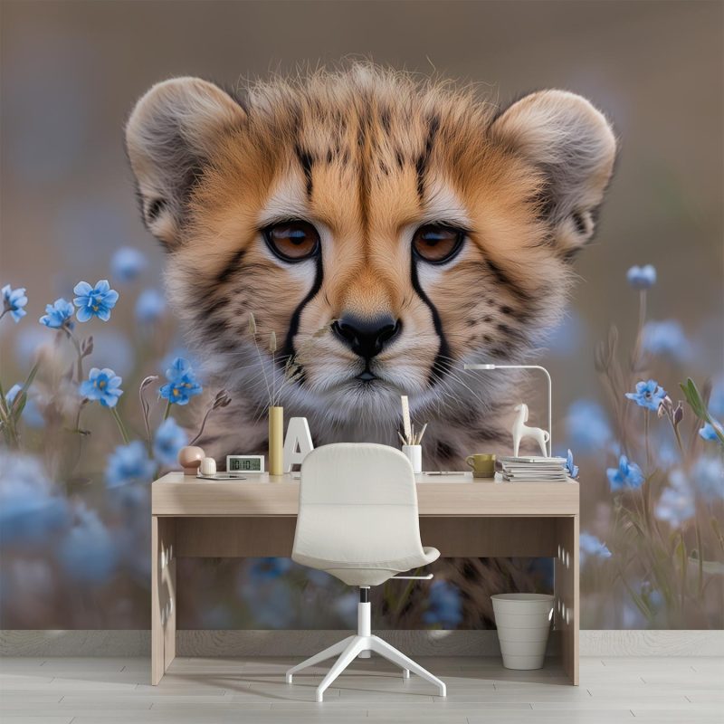 Verwonder je over dit jonge jachtluipaard dat nieuwsgierig tussen de blauwe bloemen verschijnt. Zijn zachte vacht contrasteert prachtig met de zee van blauwe bloesems. Dit levendige tafereel brengt de serene schoonheid van de natuur in huis en creëert een rustgevende sfeer. De harmonieuze compositie en warme tinten voegen natuurlijke elegantie toe aan elke ruimte.