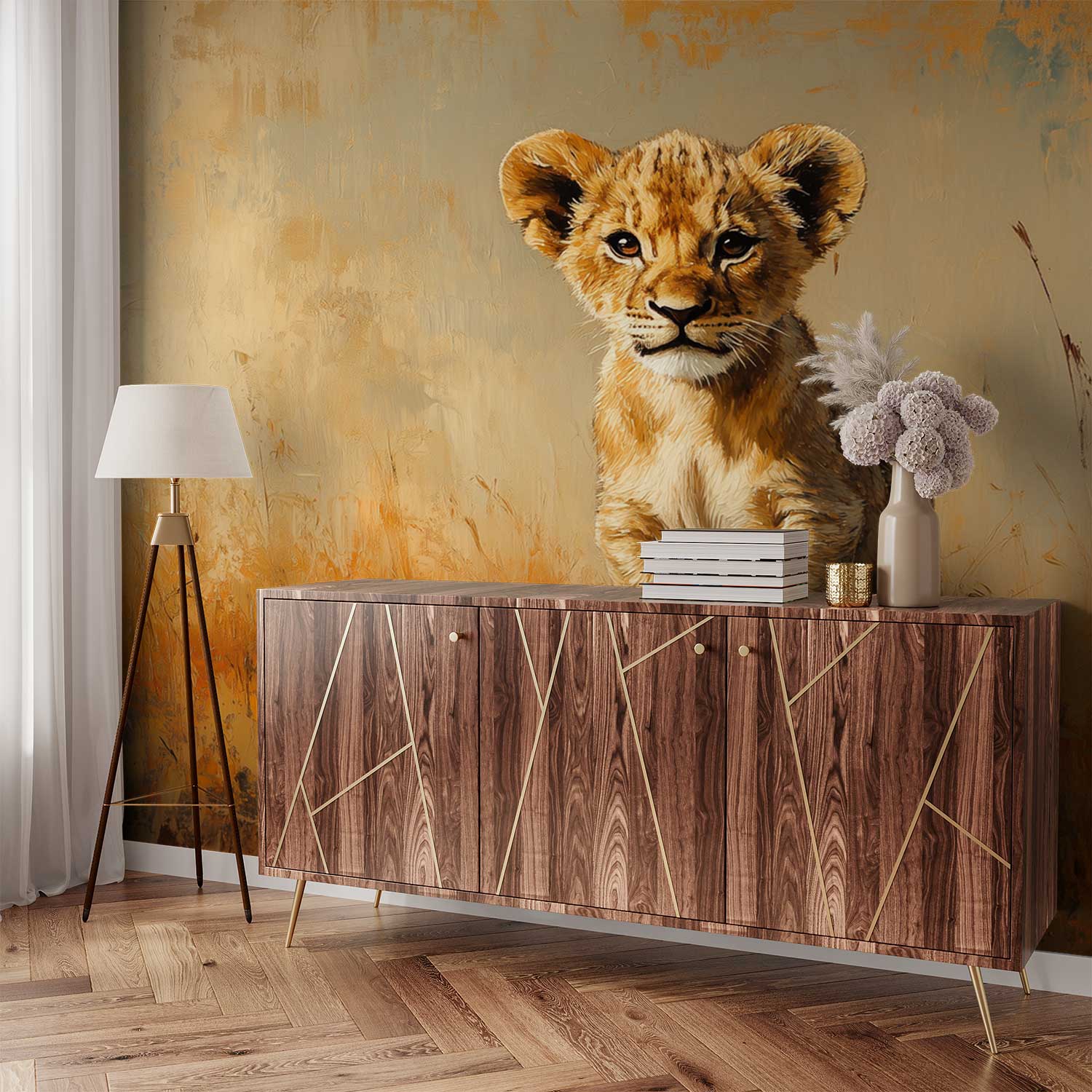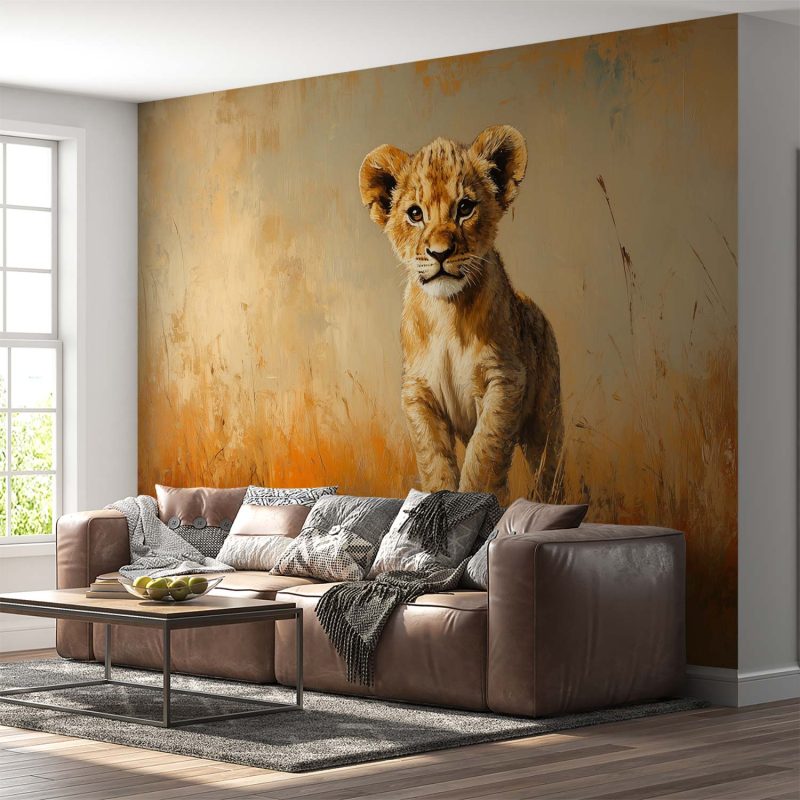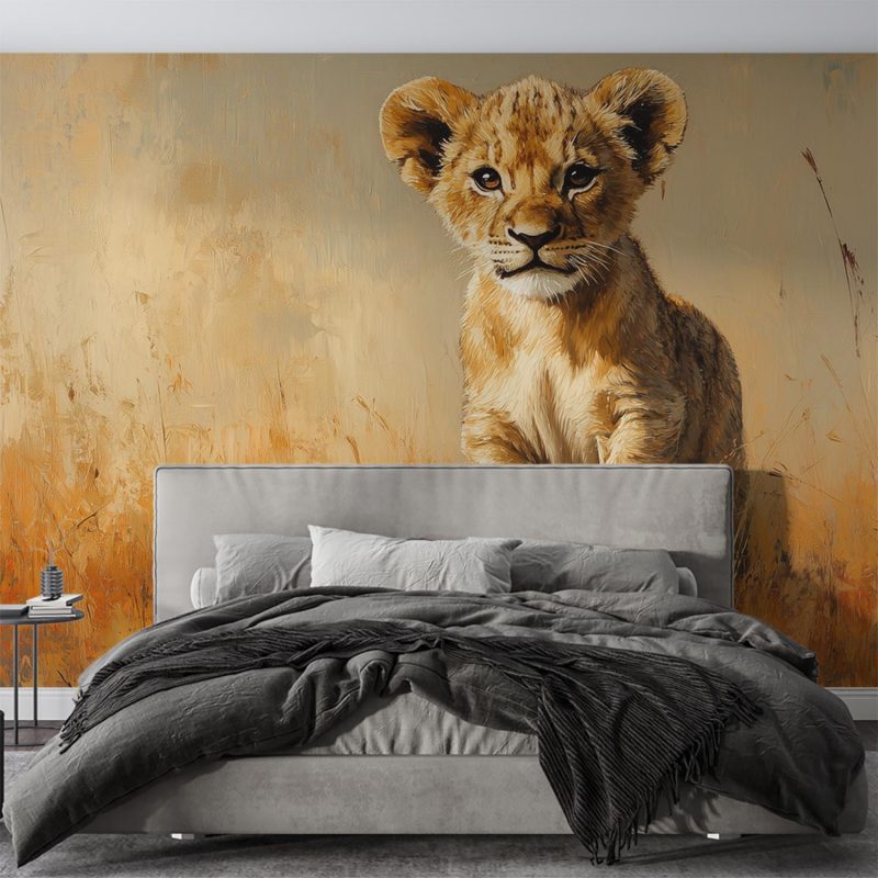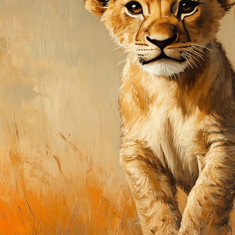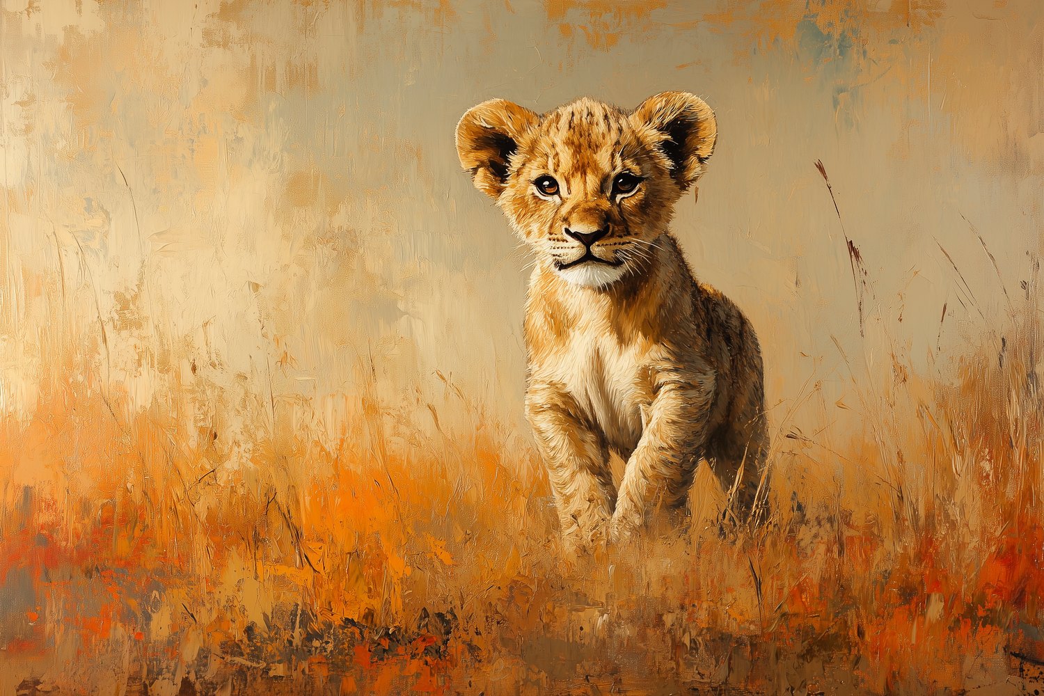 Warme oranje en bruine tinten vloeien zachtjes samen in dit impressionistische tafereel. Een leeuwenwelp rust te midden van dansend hoog gras, omhuld door een serene sfeer van natuurlijke harmonie. De levendige maar gedempte kleuren brengen rust en warmte in elke ruimte, perfect voor een interieur dat verlangt naar een vleugje wildernis en gemoedsrust.