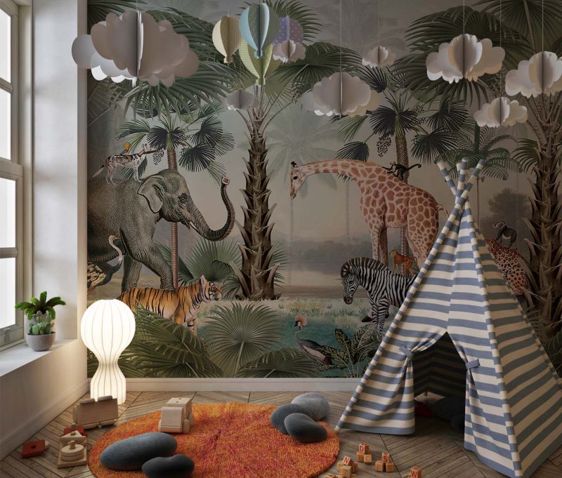 Dit kinderbehang tovert de kinderkamer om tot een levendige jungle vol avontuur! Het speelse behang barst van de dieren, van een statige zebra tot een kleurrijke toekan. Je kind zal zich vermaken met het ontdekken van alle dieren en hun verhalen, terwijl het de kamer een frisse, creatieve uitstraling geeft. Een vrolijke toevoeging aan elke kinderkamer!