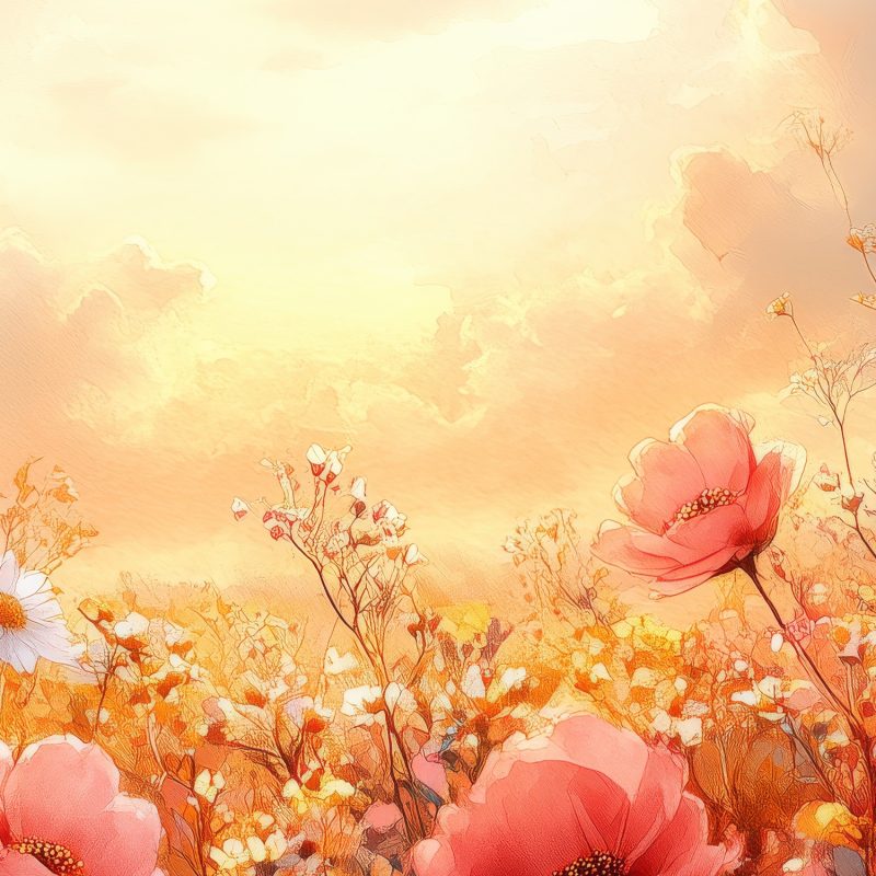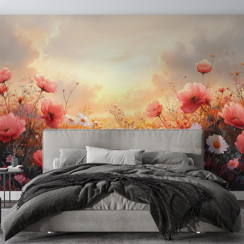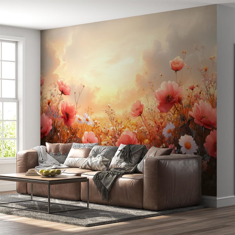 Kleurrijk bloemenveld onder wolkenlucht behang