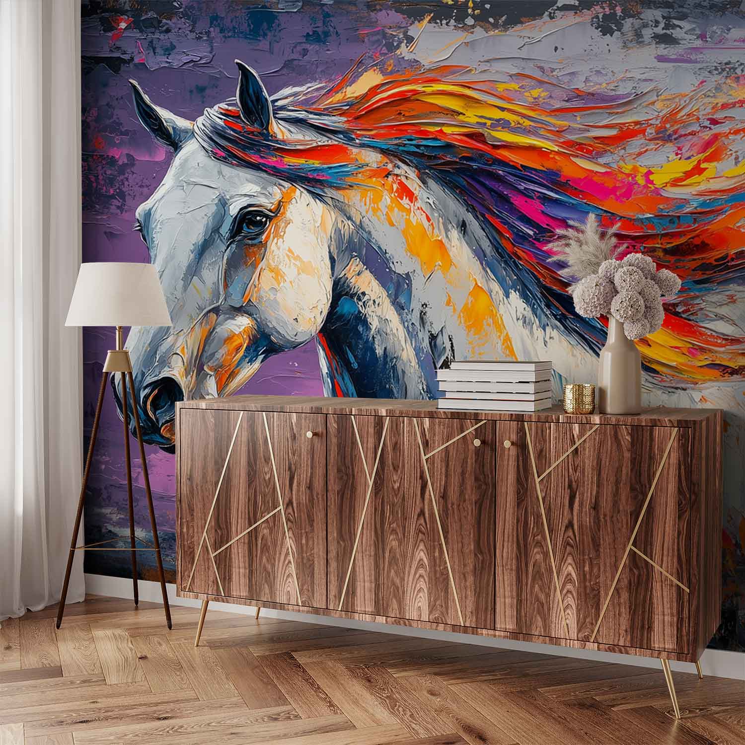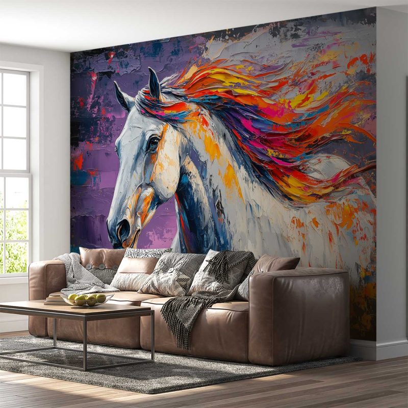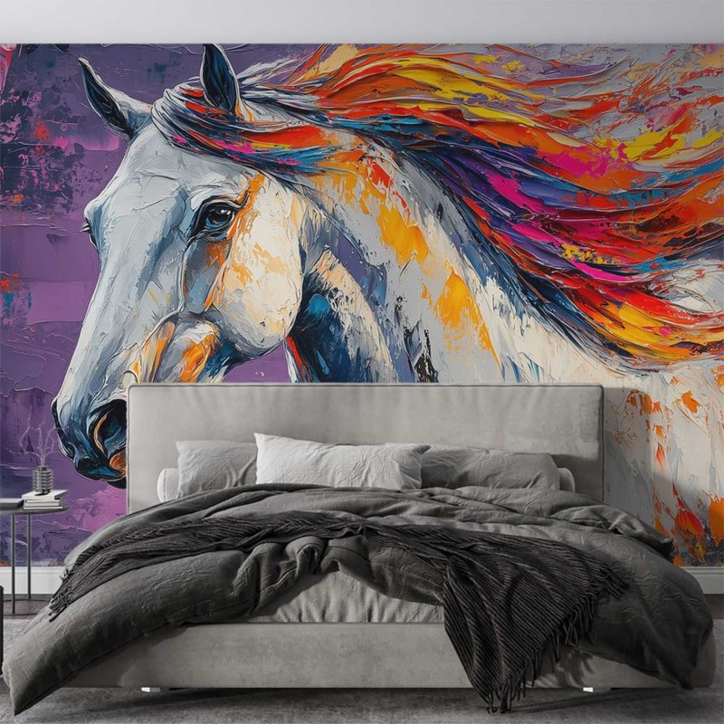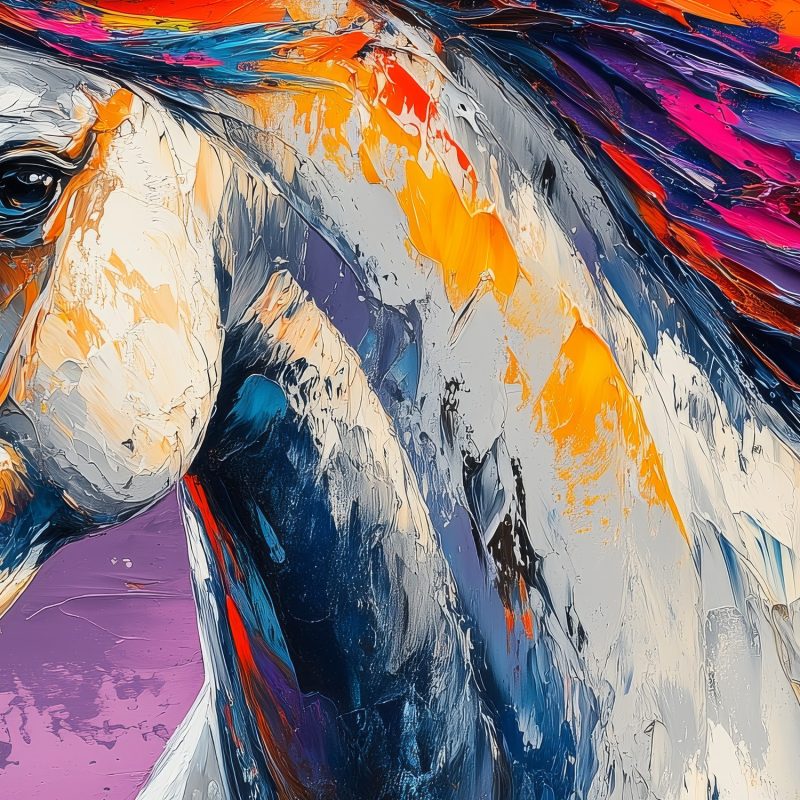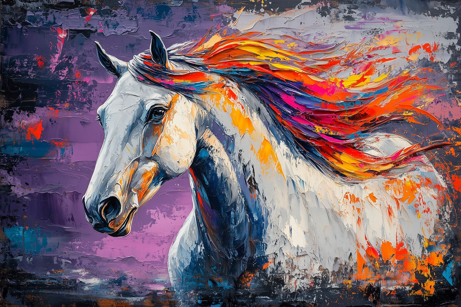 Vurige oranje en paarse tinten dansen door de wilde manen van dit majestueuze paard. Levendige penseelstreken vangen pure energie en vrijheid, terwijl het dier dynamisch naar links draait. De donkere achtergrond versterkt de magische uitstraling. Perfect voor een statement muur die elke ruimte transformeert met artistieke passie en natuurlijke schoonheid.