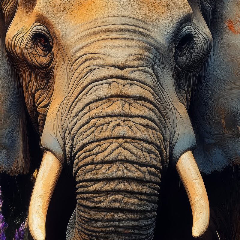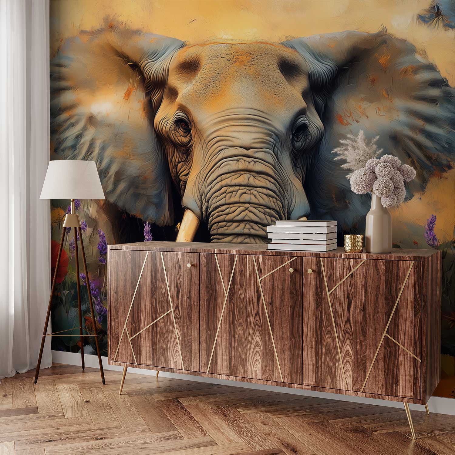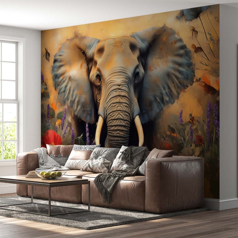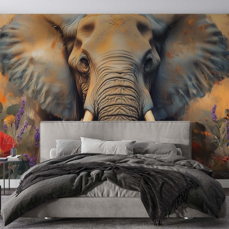 Oranje, gele en paarse tinten dansen rond een majestueuze olifant in een zee van bloemen. Deze levendige scène straalt sereniteit uit en brengt de harmonie van de natuur in huis. Het krachtige beeld fungeert als een rustgevend middelpunt, perfect voor een accentmuur die elke ruimte transformeert tot een oase van kleur en rust.