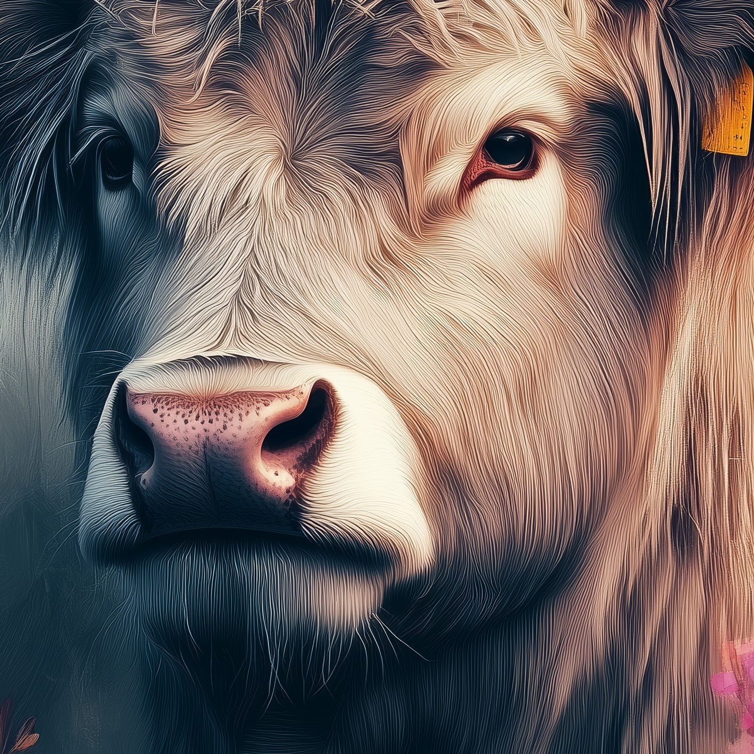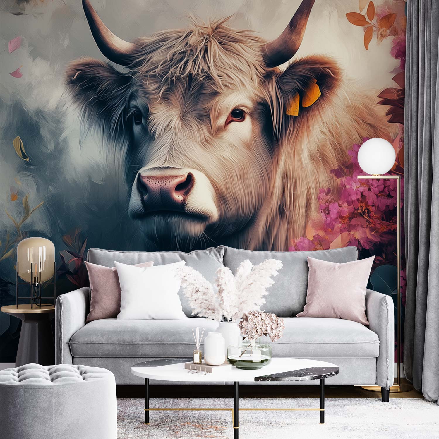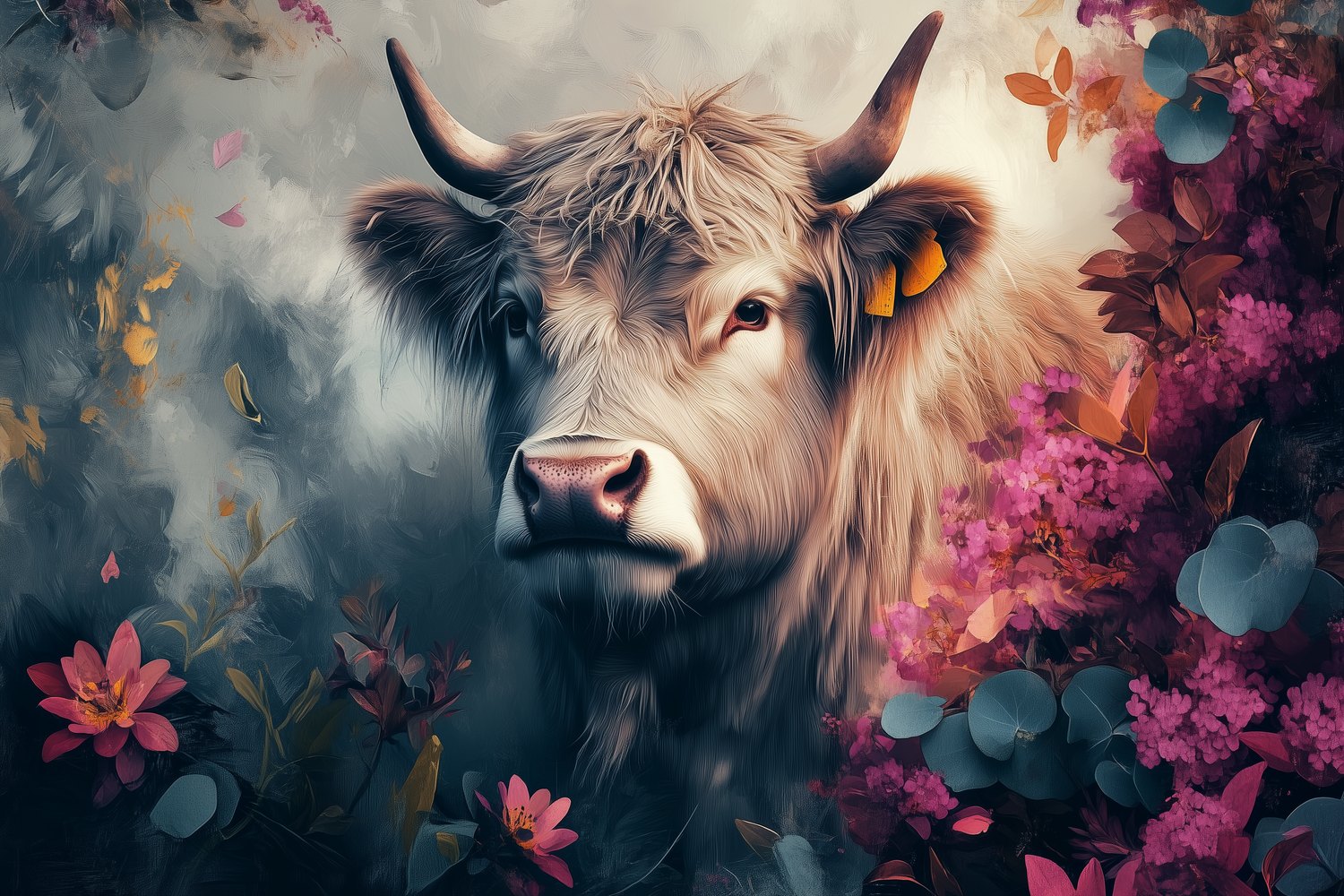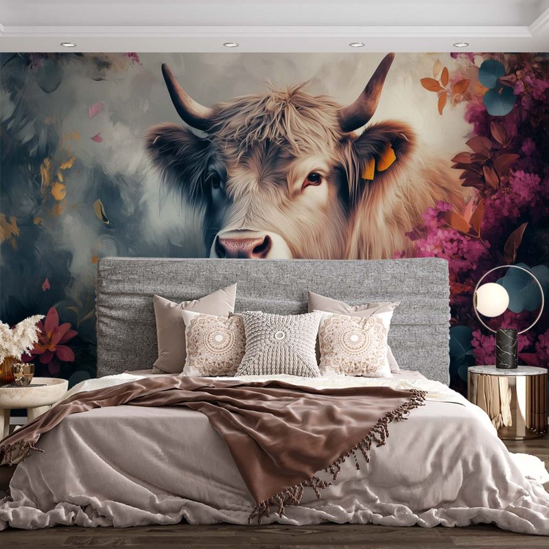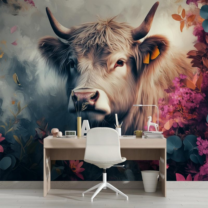 Zachte neusgaten ademen rust uit tussen een zee van dansende bloemen. Roze, paarse en oranje tinten wervelen rond de koe met zijn trotse horens. Dit levendige tafereel brengt harmonieuze wildheid en kalme vreugde in je ruimte. De artistieke diepte en speelse charme transformeren elke muur tot een serene natuurlijke oase vol warmte en karakter.
