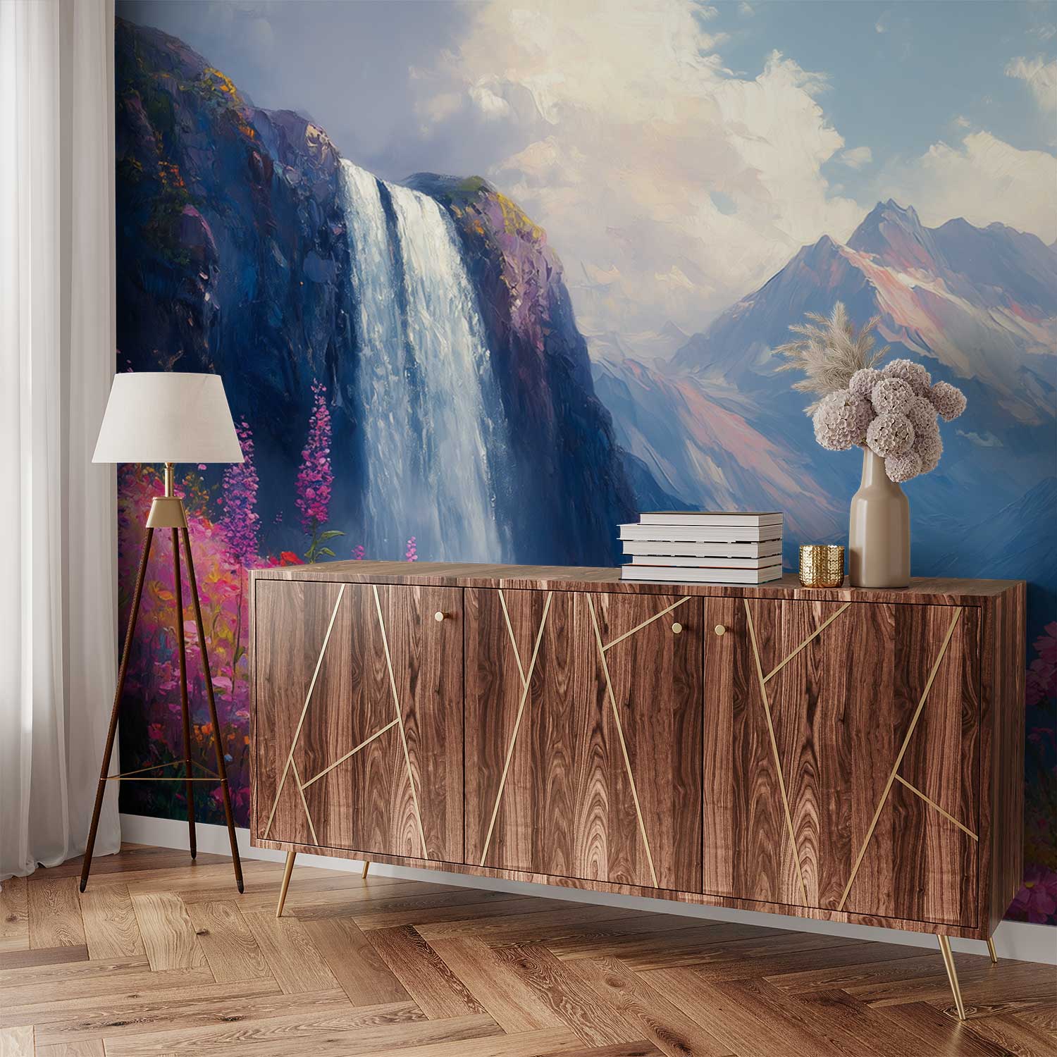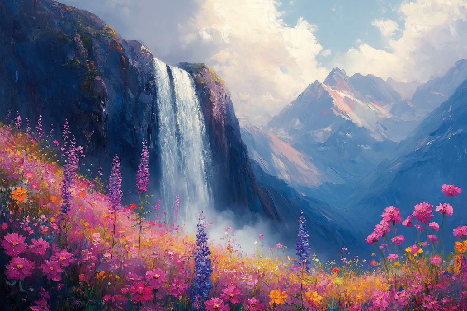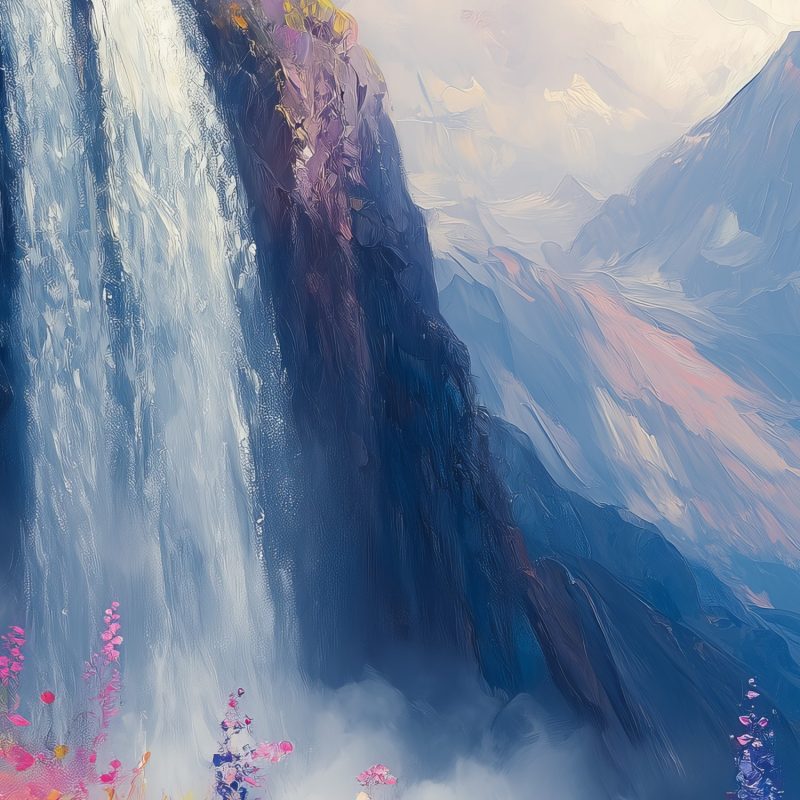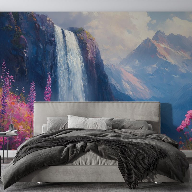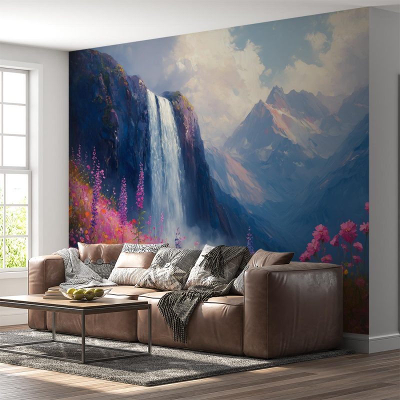 Stralende waterval stort neer tussen kleurrijke bloemenvelden. Levendige blauwe, roze en gele tinten creëren een vrolijke sfeer vol beweging. Dit natuurtafereel ademt pure harmonie en brengt sereniteit in je interieur. De perfecte balans tussen kracht en tederheid transformeert elke ruimte tot een oase van rust. Ideaal voor wie natuurlijke schoonheid en positieve energie in huis wil halen.