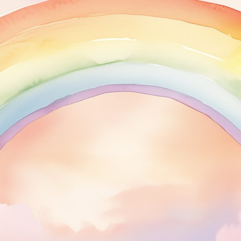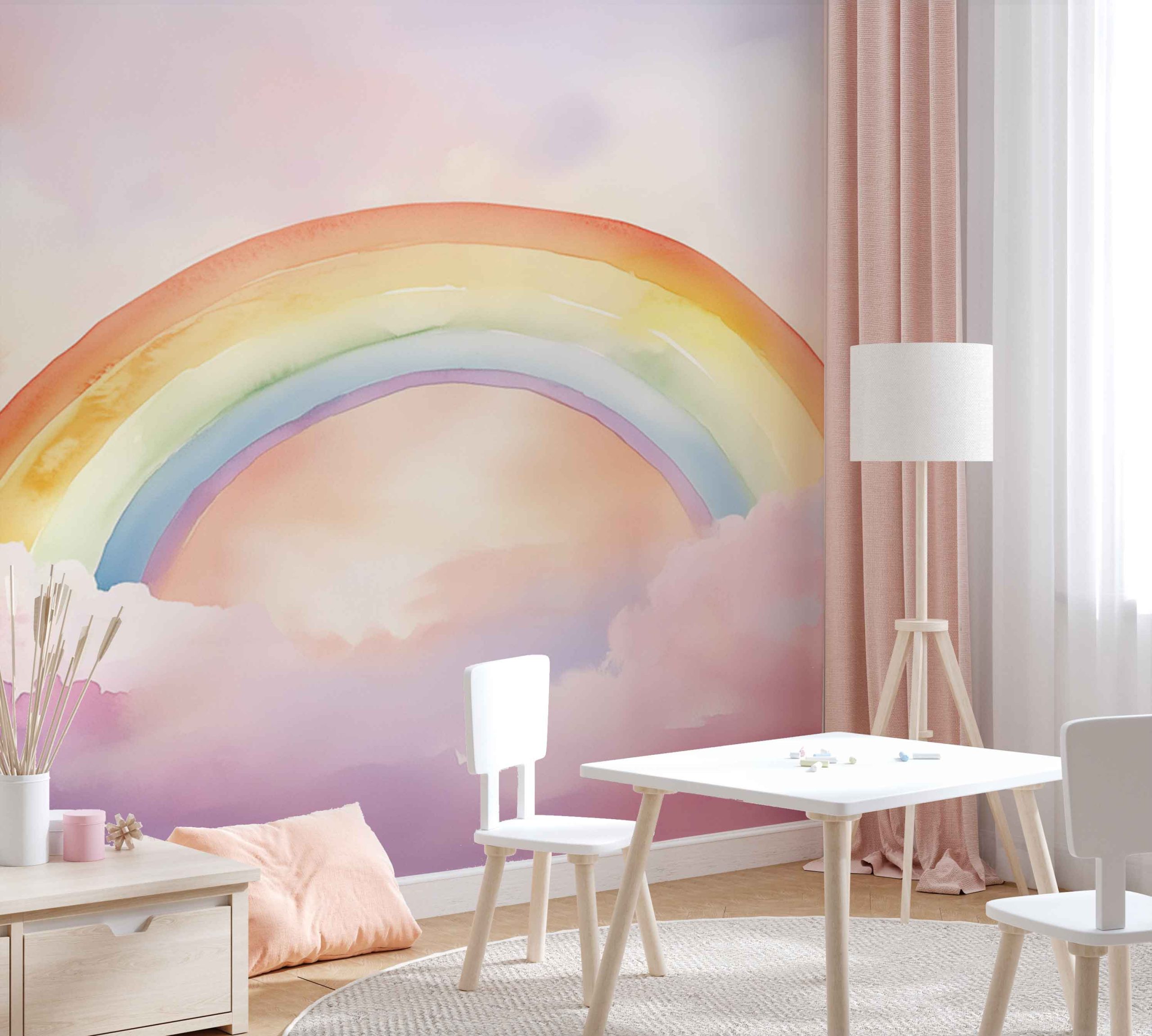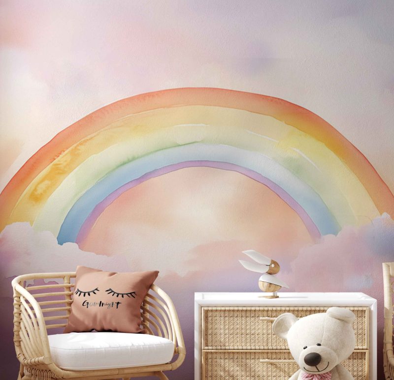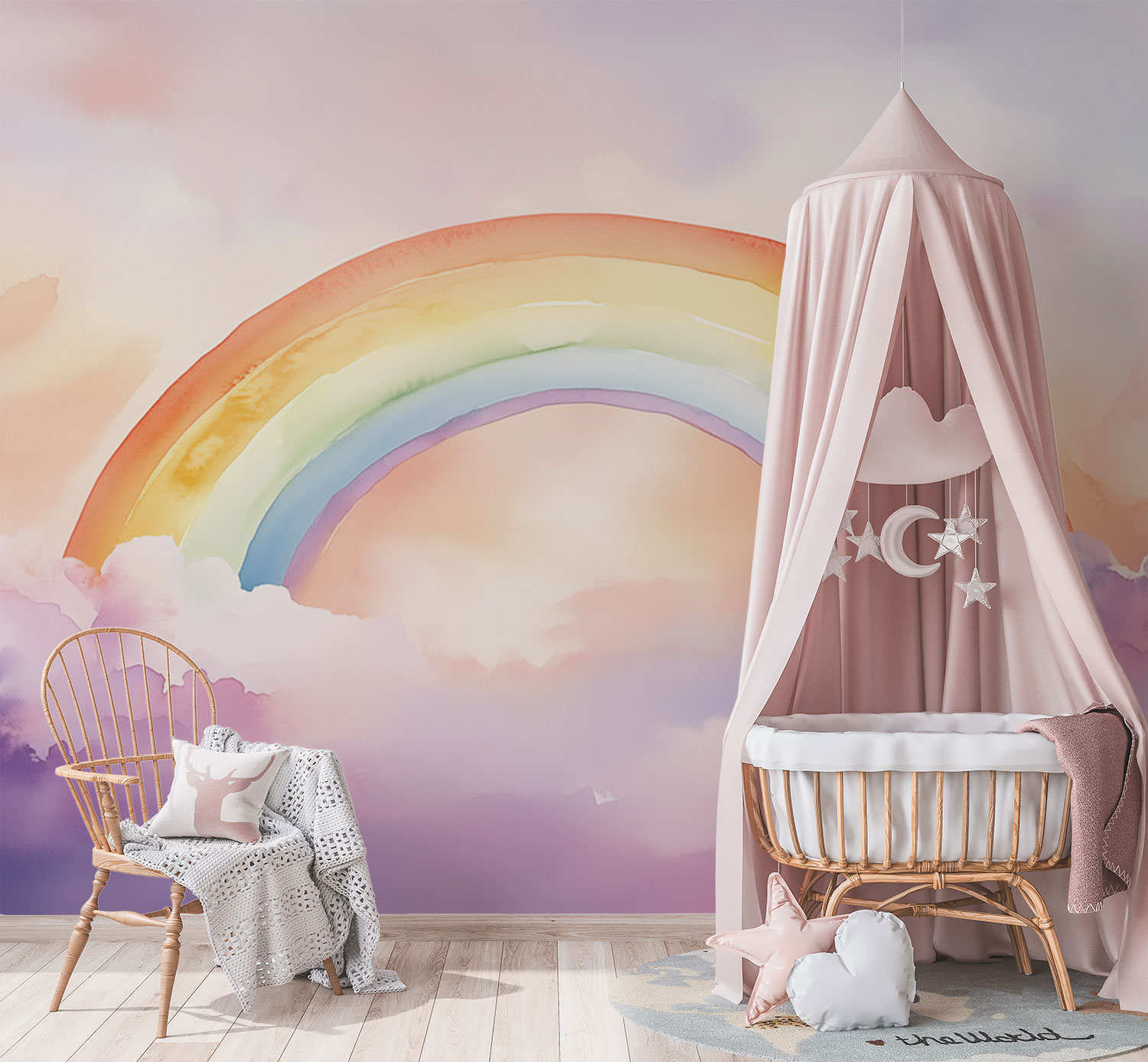 Regenboogkleuren dansen over een dromerige lucht vol zachte pastelwolken. Dit waterverftafereel brengt magie en beweging in de ruimte, waar de boog speels van linksboven naar rechtsonder zweeft. Ideaal voor een kinderkamer: de levendige tinten stimuleren de fantasie en creëren een vrolijke, kalmerende sfeer die zowel speels als rustgevend aanvoelt.