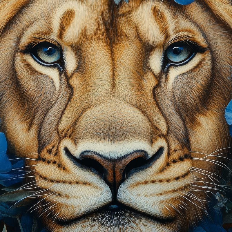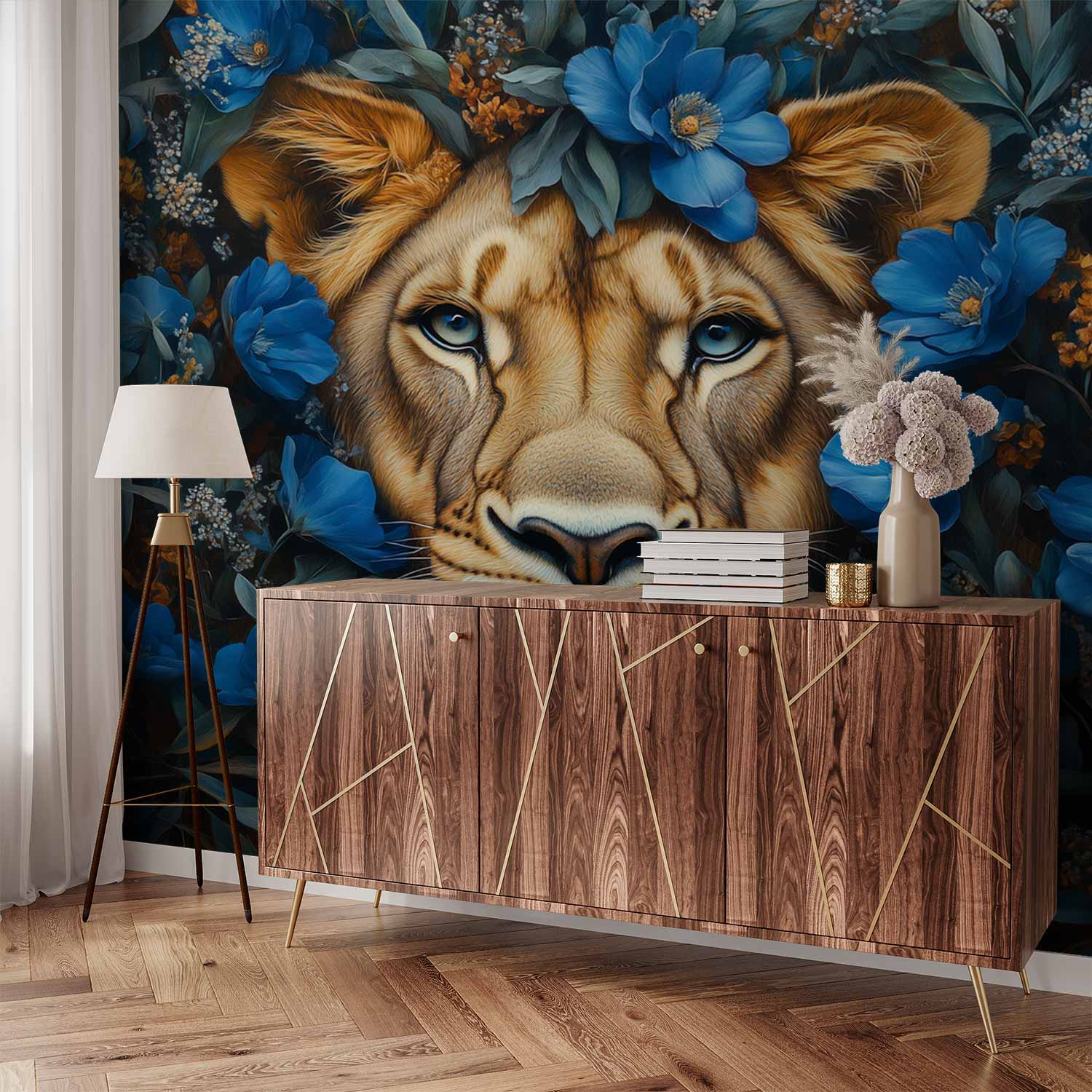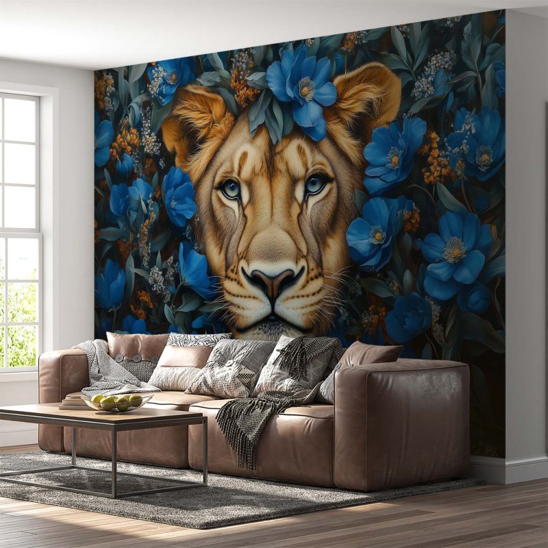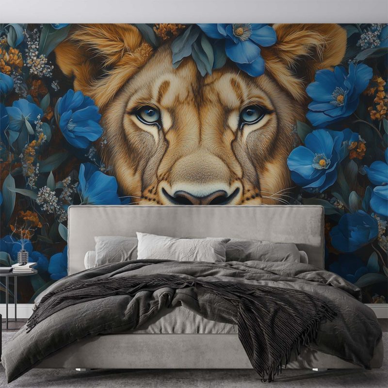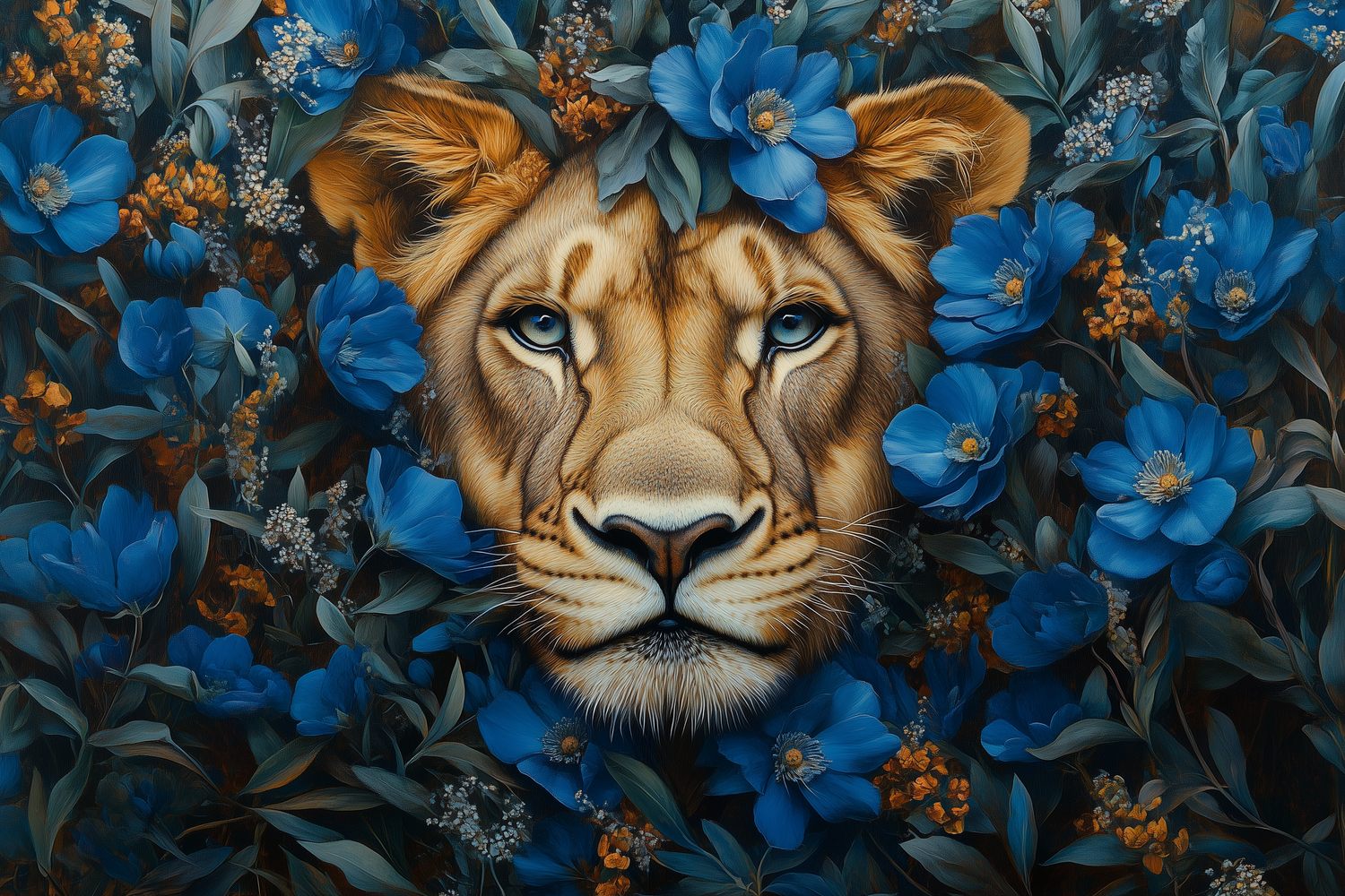Tranquille blauwe bloemen omarmen de majestueuze leeuwenkop. Zijn gouden vacht contrasteert prachtig met het diepe blauw, terwijl zijn kalme blik rust uitstraalt. Deze levendige scène brengt wildernis elegantie in je interieur, perfect als statement wand die zowel kracht als sereniteit uitstraalt.