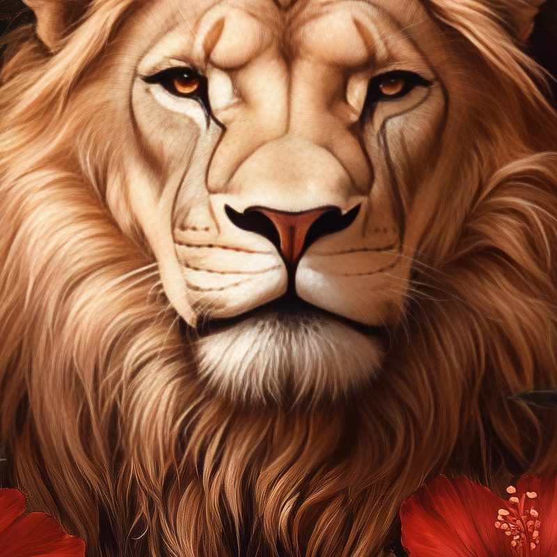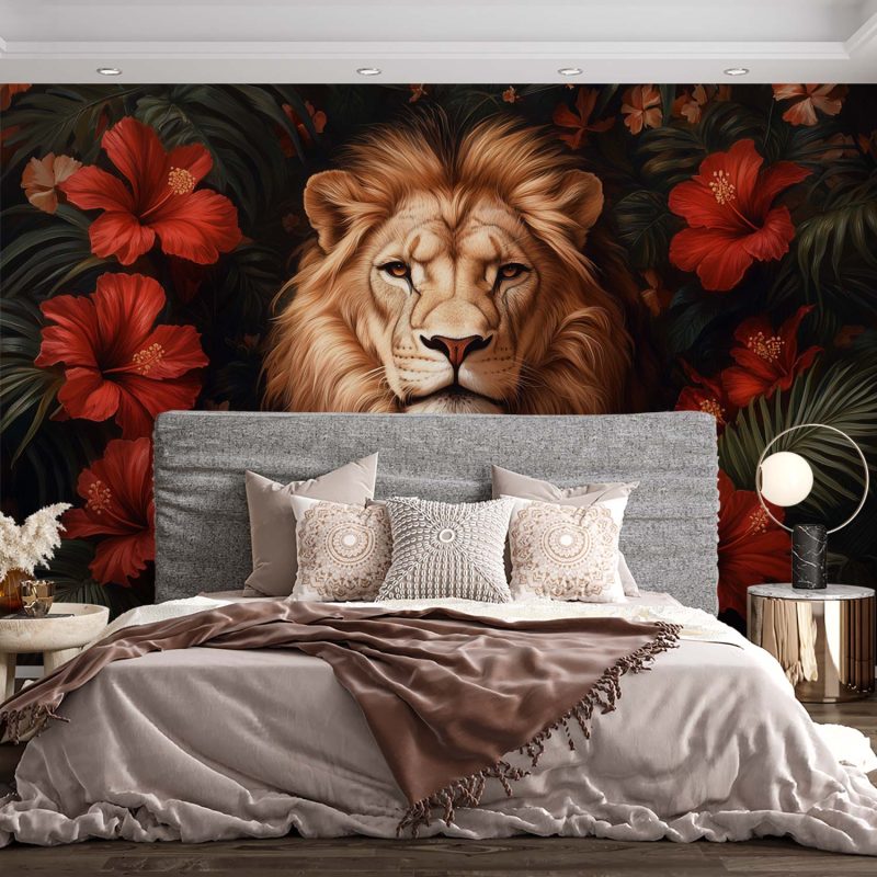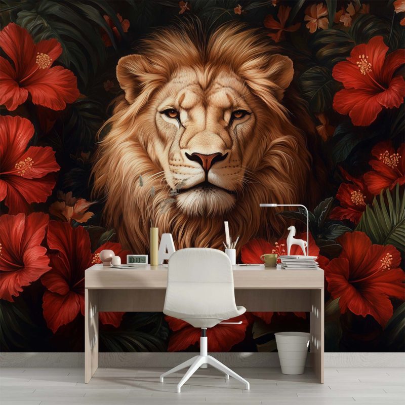 Gouden zonlicht glanst door de weelderige jungle. Een trotse leeuw met een stralende manen rust tussen knalrode hibiscusbloemen die dansen in het groen. Warme aardetinten omarmen deze serene scène vol harmonie. Brengt de levendige energie van de tropen naar je muur en creëert een rustgevende, exotische sfeer in elke ruimte.