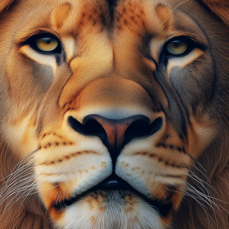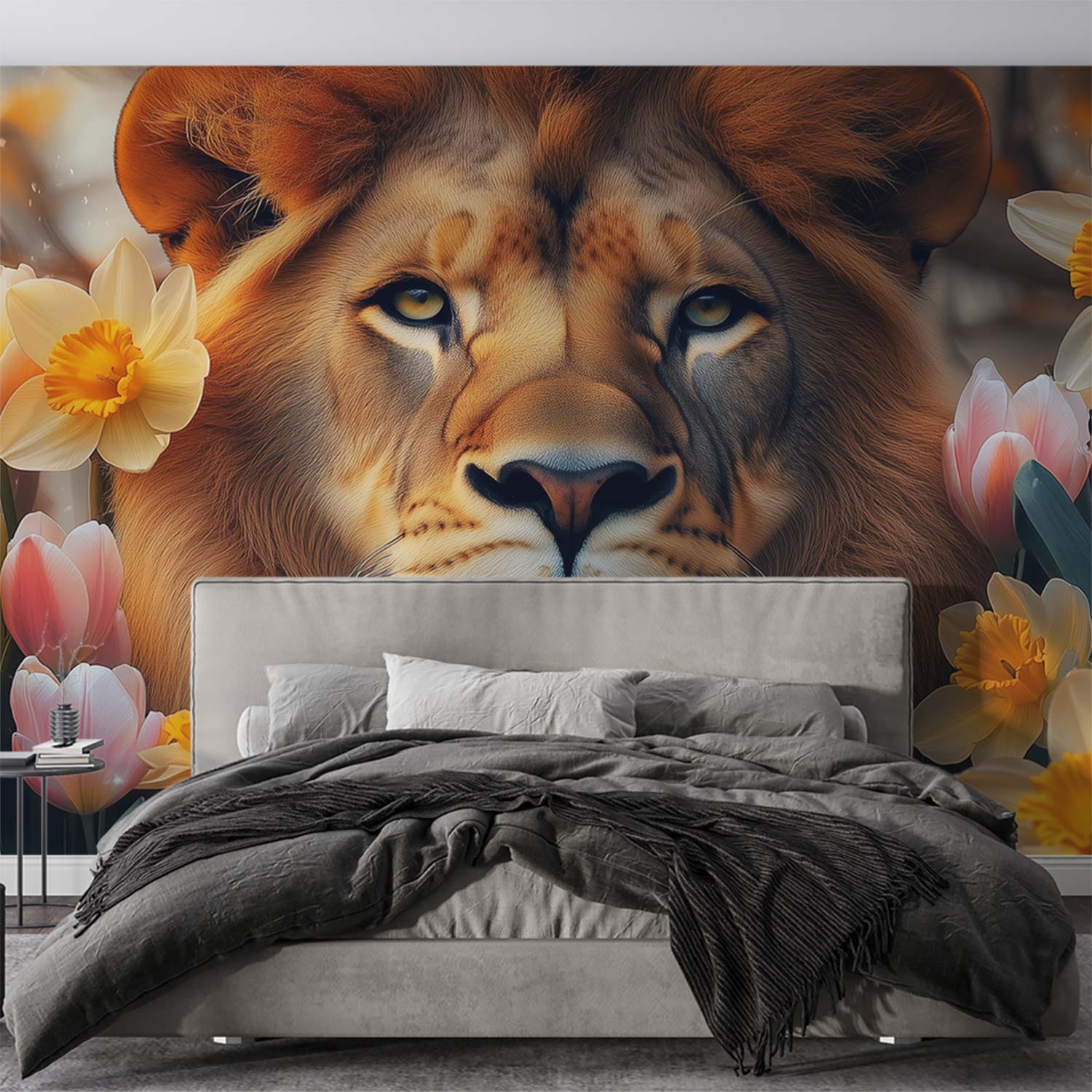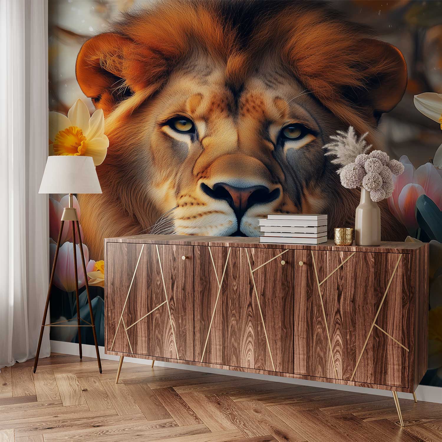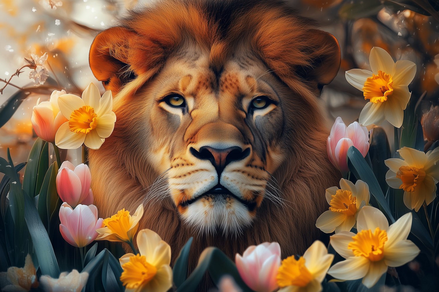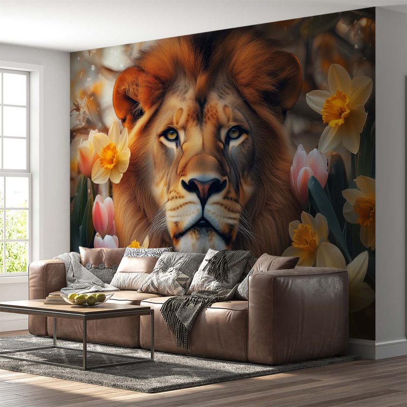 Gouden stralen schitteren in de weelderige manen van deze trotse leeuw, omringd door een zee van zachtroze en zonnige tulpen. Zijn kalme blik nodigt je uit in dit harmonieuze tafereel vol warmte en rust. Brengt natuurlijke elegantie en serene energie in jouw ruimte, perfect voor een statement muur die zowel kracht als zachtheid uitstraalt.