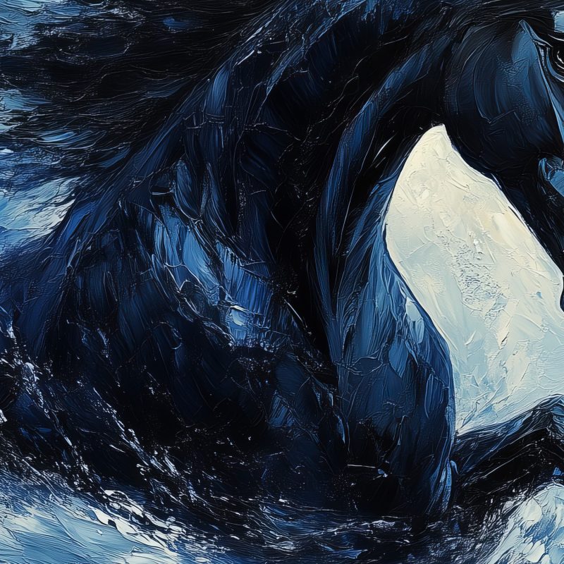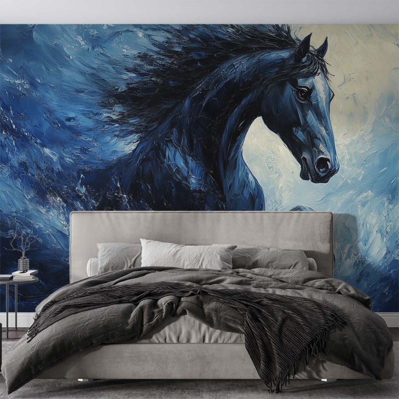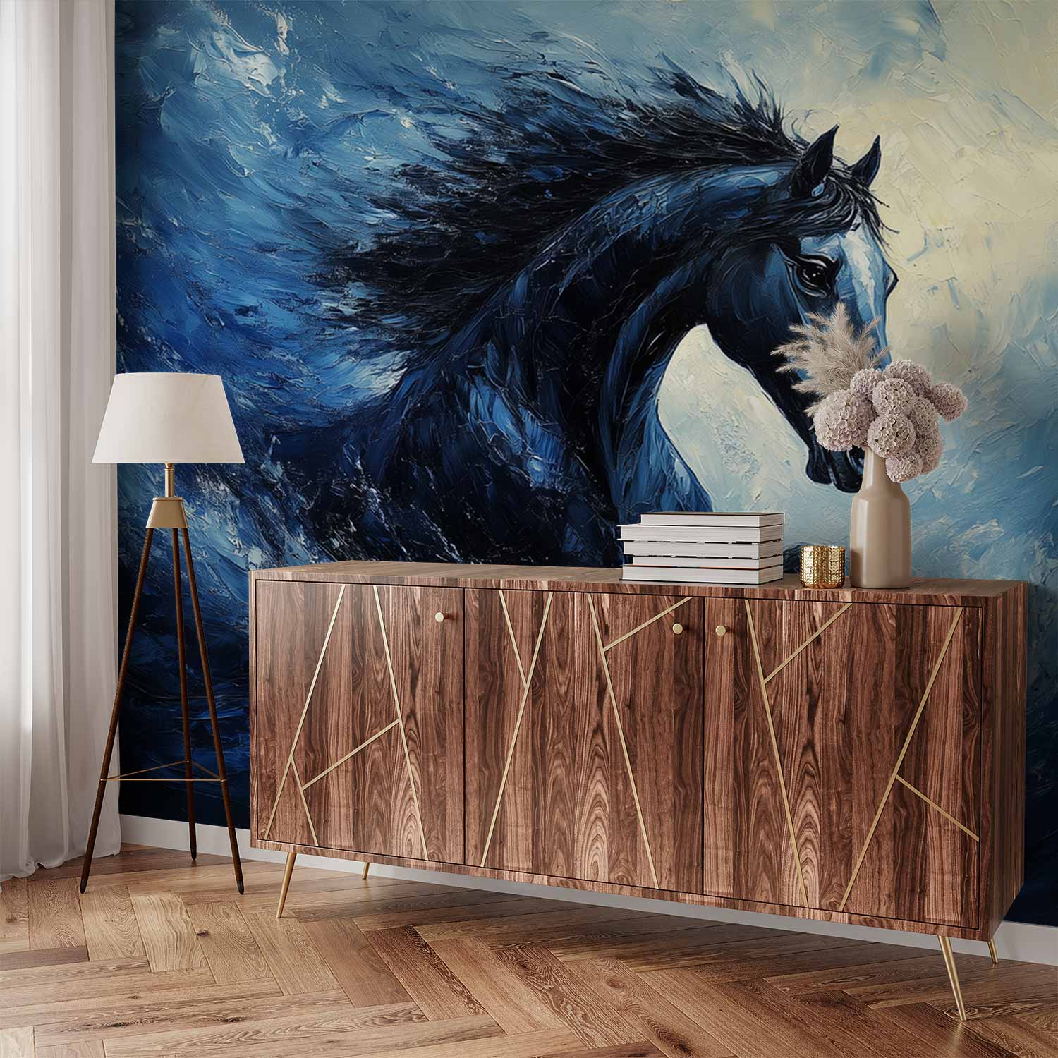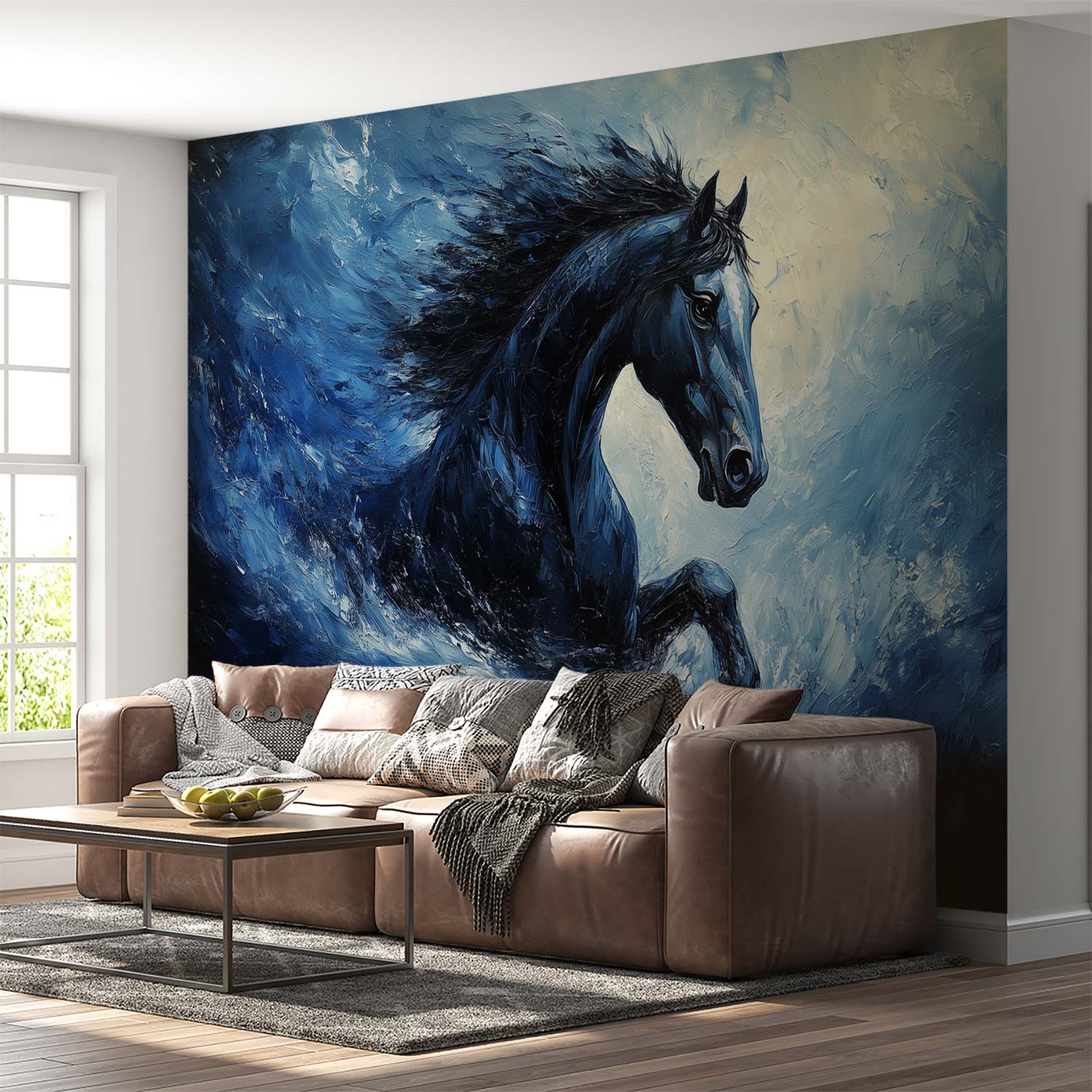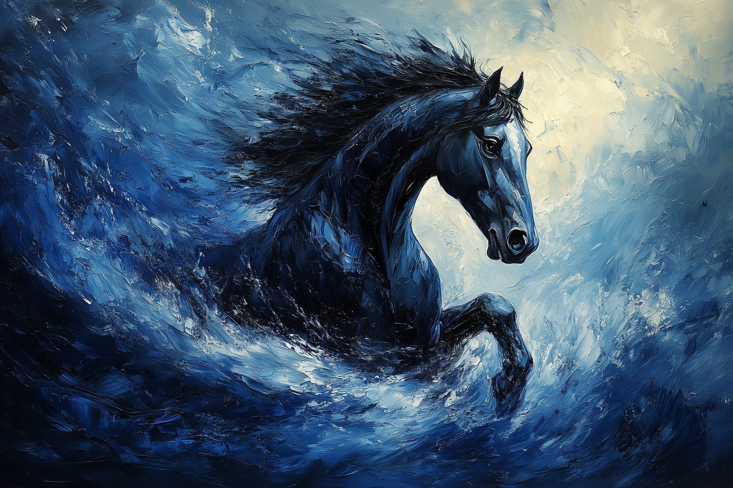 Gevoed door een innerlijke kracht galoppeert dit paard door de golven. Zijn vloeiende manen en gespierde lijf, levensecht weergegeven in diepblauw en zwart, stralen pure energie uit. Deze dynamische verschijning brengt een gevoel van vrijheid en beweging in je interieur, perfect voor wie verlangt naar een statement vol passie en diepte.