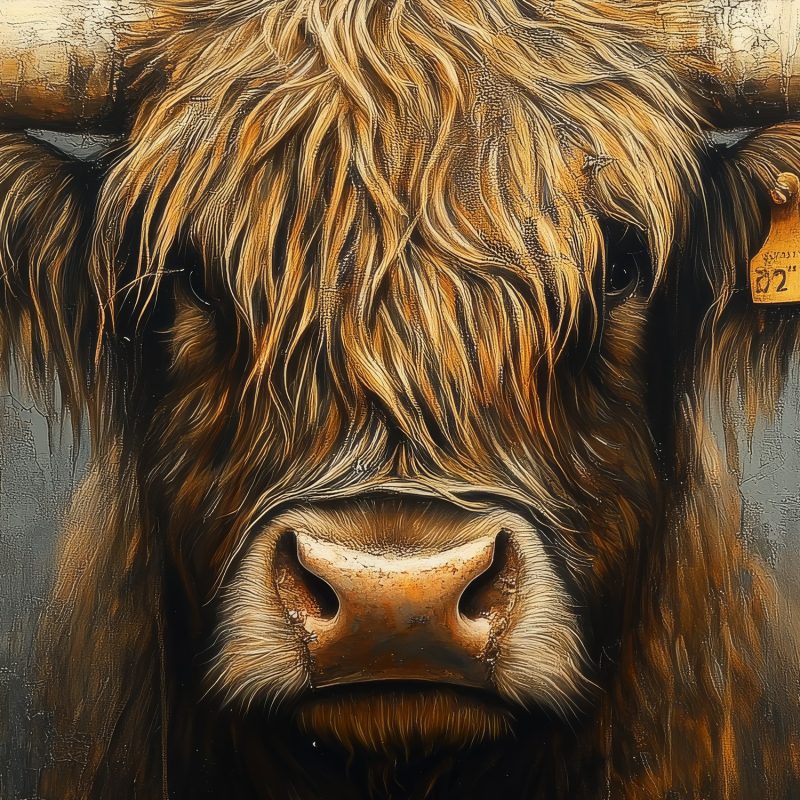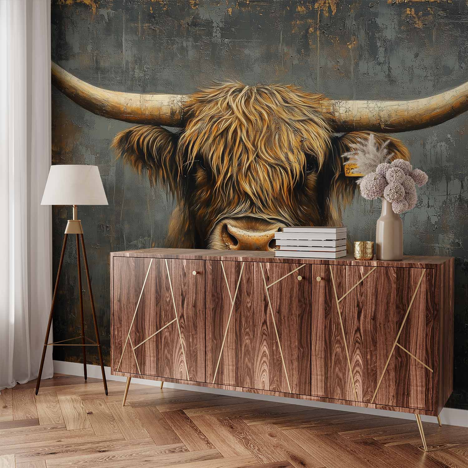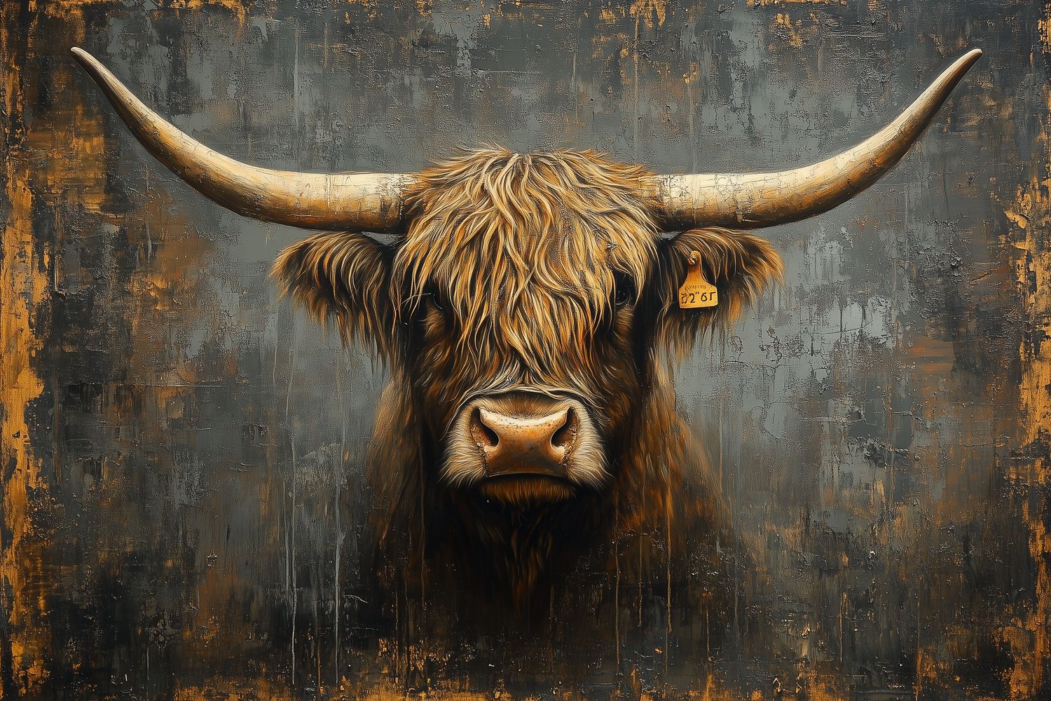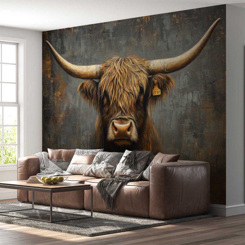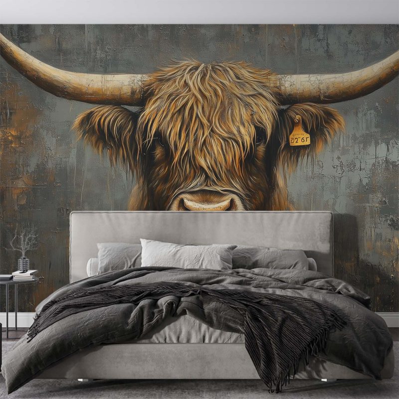Krachtige bruine en grijze tinten dansen over het doek. De imposante stier met majestueuze horens komt tot leven in rijke olieverfstreken. Zijn open mond en doordringende blik stralen pure energie uit. Dit statement behang brengt rauwe natuur en artistieke flair in je interieur. Perfect voor wie durft. De textuur en aardse kleuren voegen warmte en karakter toe aan elke ruimte.