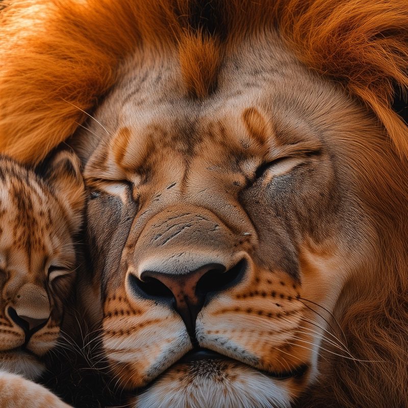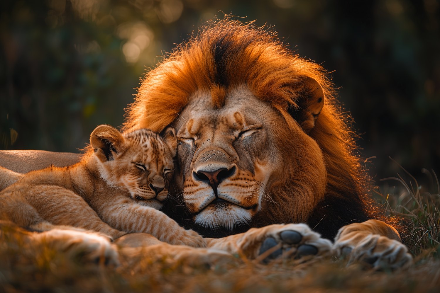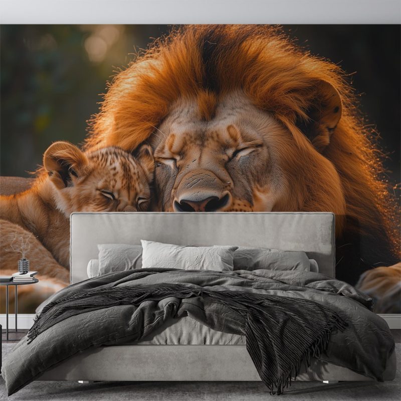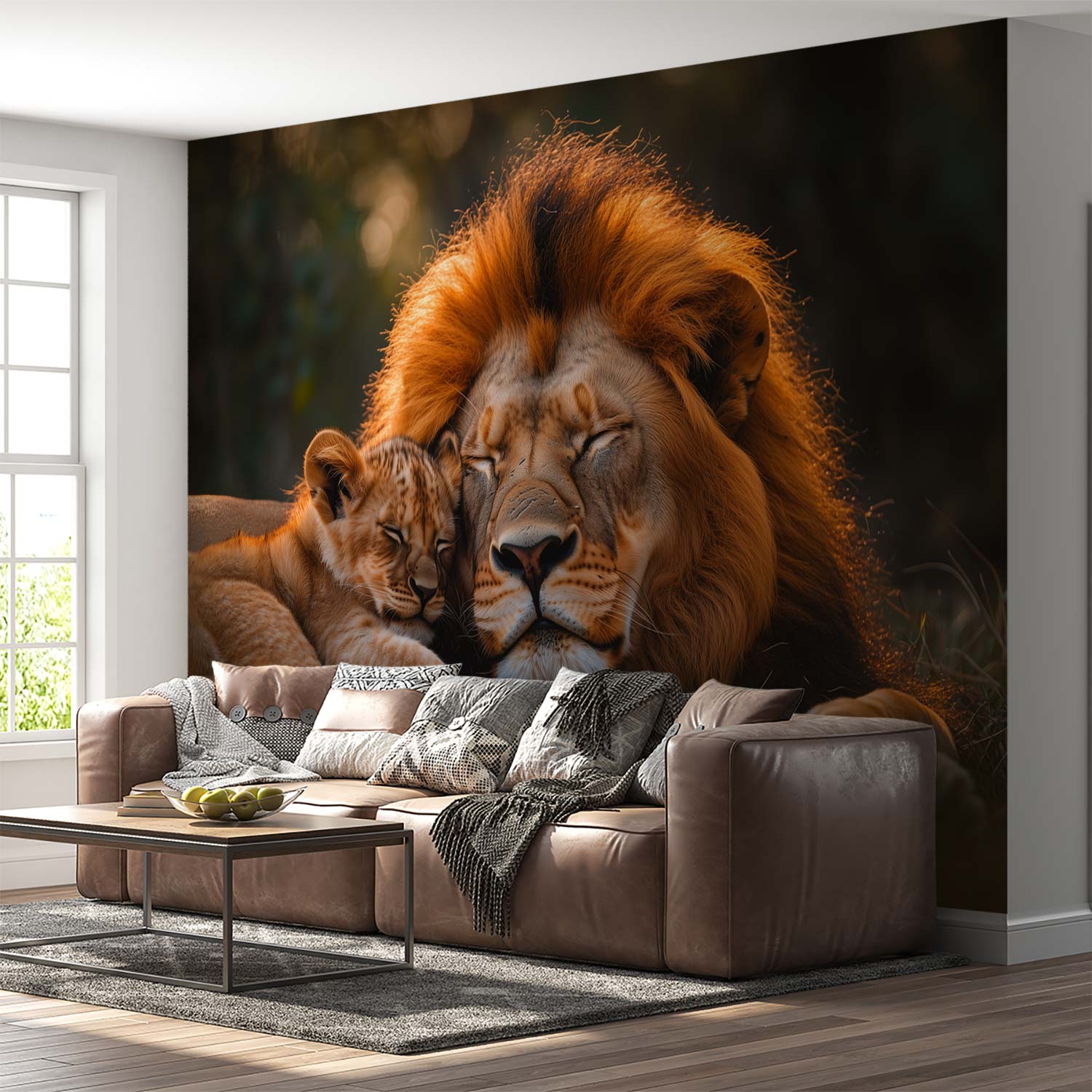 Warme oranje en bruine tinten omhullen dit tafereel van tedere bescherming. Een majestueuze leeuw rust met zijn welp in een serene omgeving, hun innige band voelbaar in elke vezel. Dit behang brengt de rust en warmte van de natuur naar binnen, perfect voor een ruimte waar geborgenheid en natuurlijke schoonheid samenkomen.