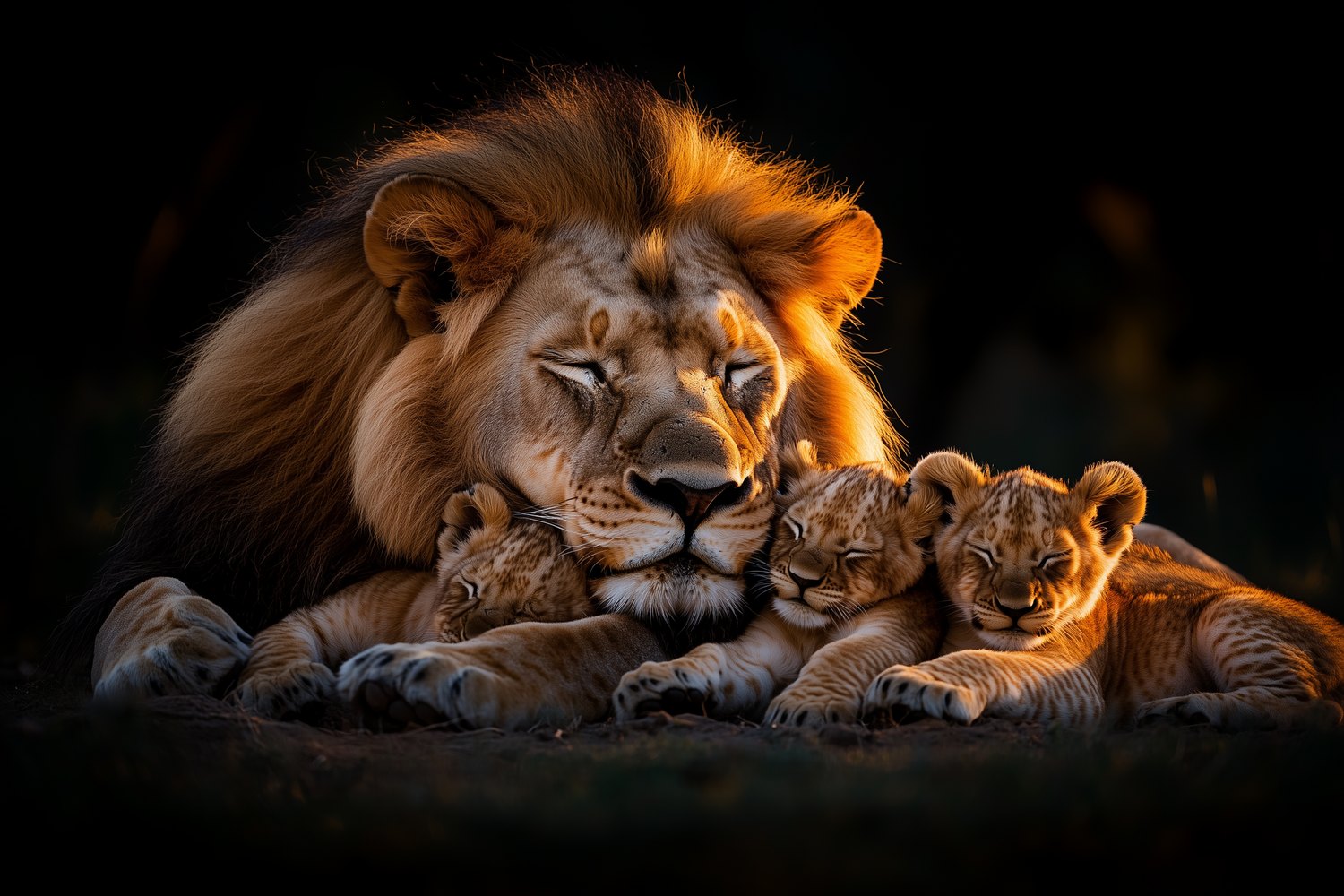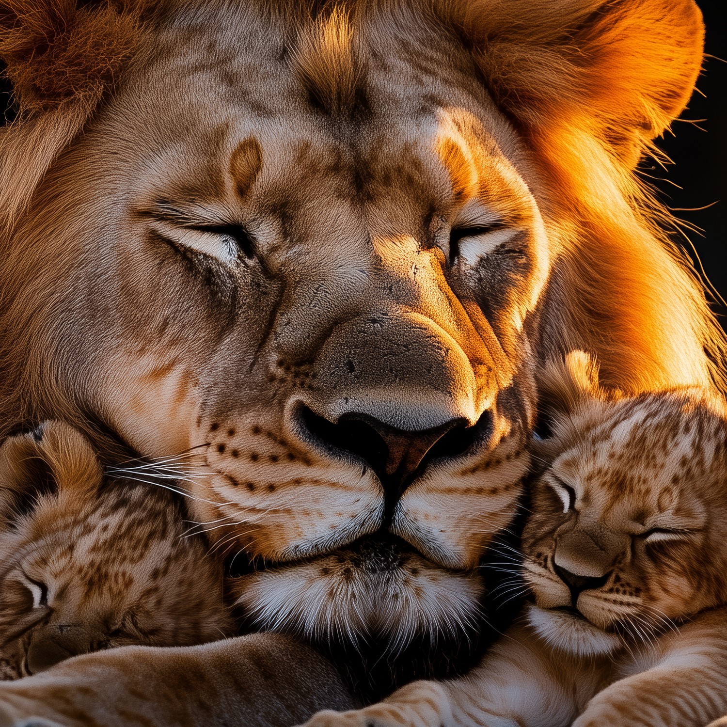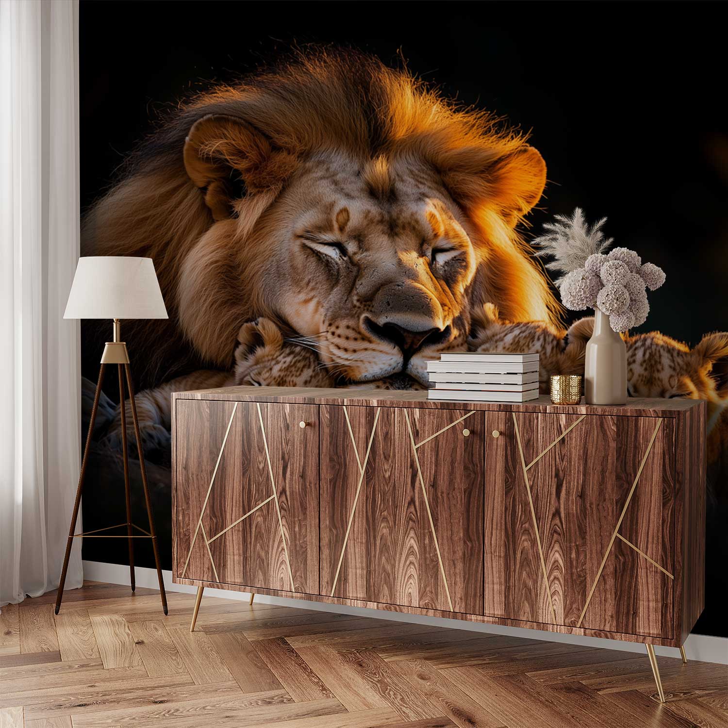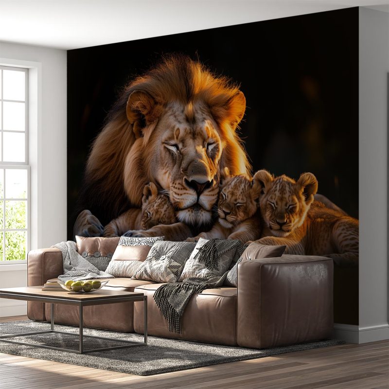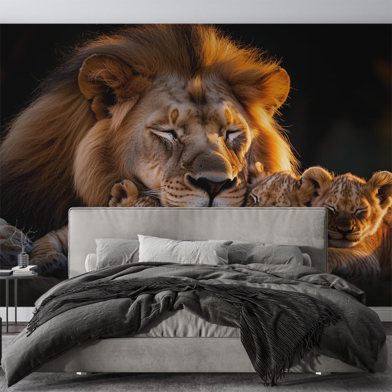 Gouden zonnestralen omarmen dit tafereel van rust. Een leeuw doezelt met zijn welpjes in warm oranje en diepbruin. Zacht gefluister van de savanne vult de ruimte. Dit behang brengt een gevoel van geborgenheid en warmte in je interieur. Het creëert een rustpunt vol natuurlijke harmonie.