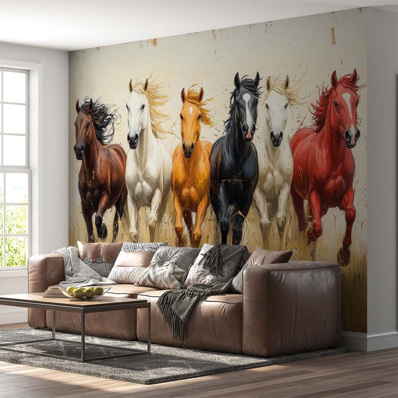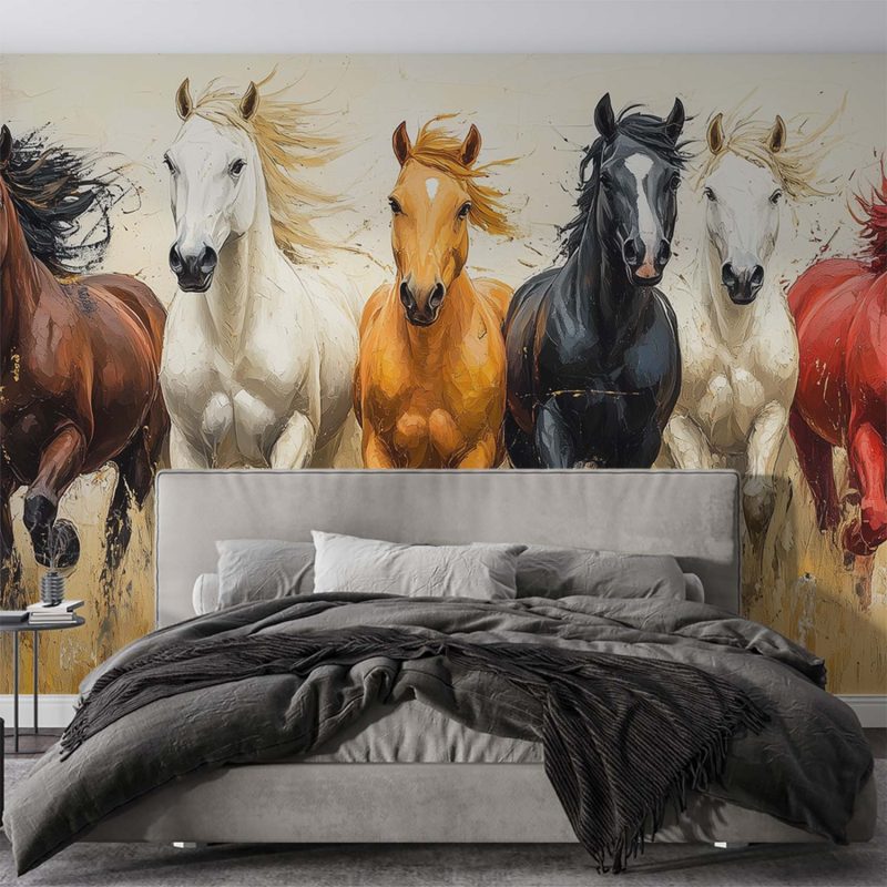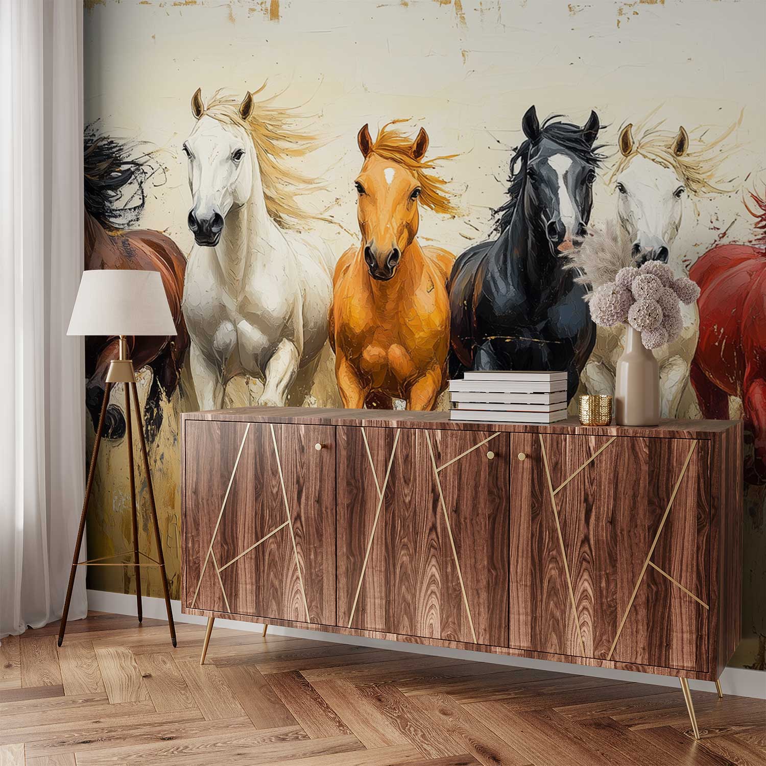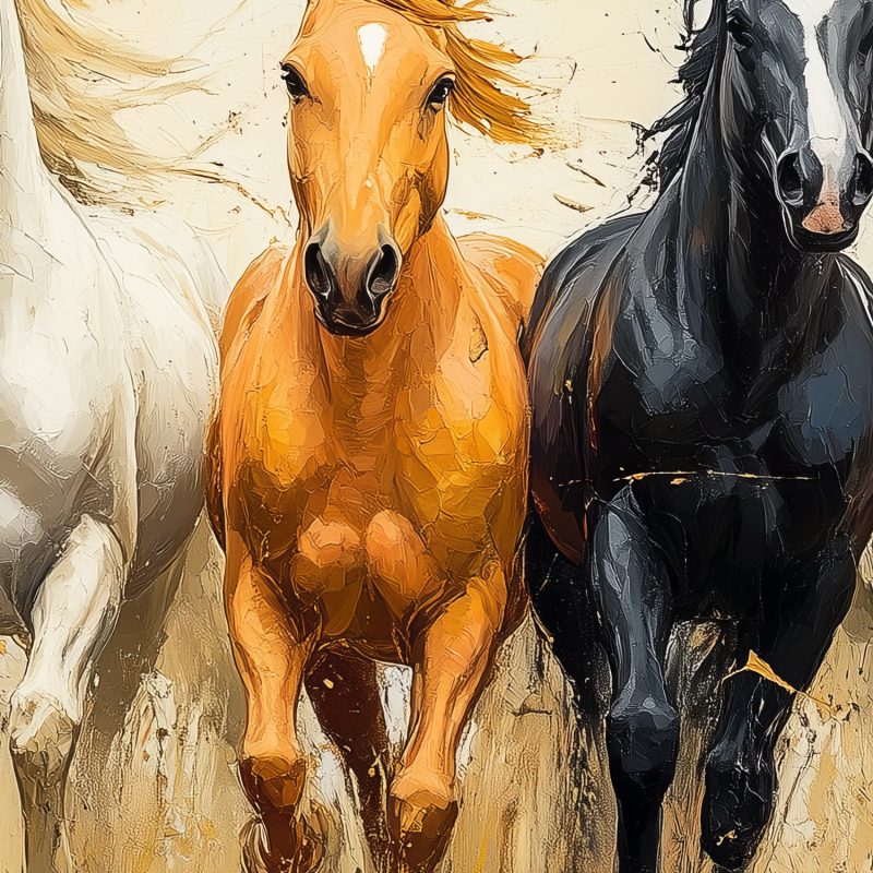 Vurige paarden galopperen vol energie over een zachtgele vlakte. Levendige penseelstreken in rijke tinten bruin, wit, zwart en rood vangen hun dynamische beweging. Dit krachtige tafereel brengt pure vitaliteit in je ruimte en creëert een boeiend middelpunt vol natuurlijke elegantie. Perfect voor wie verlangt naar een interieur met karakter en onverwachte diepte.
