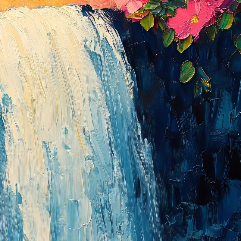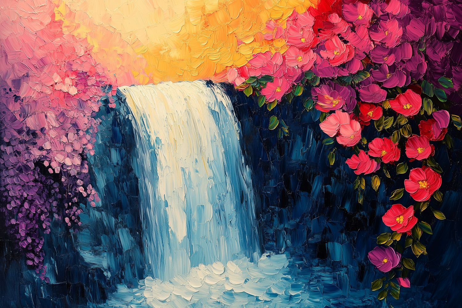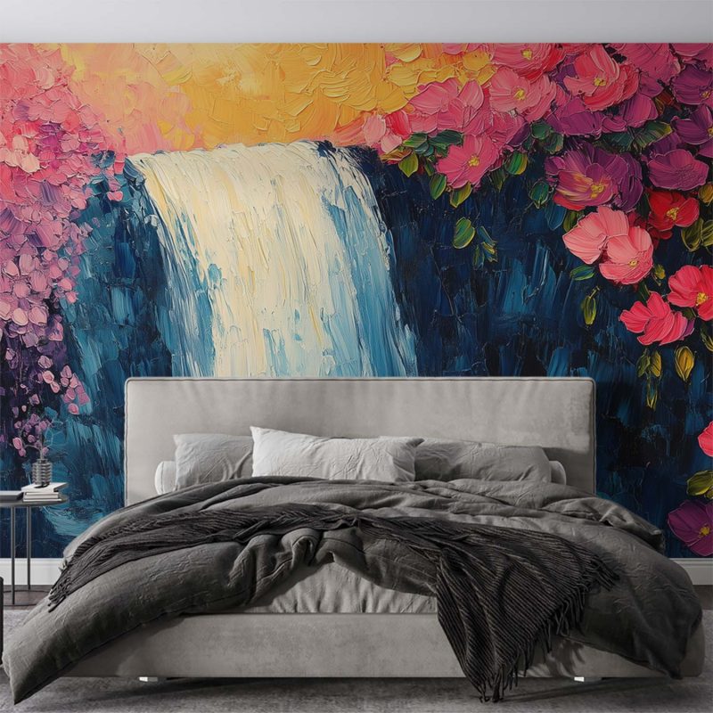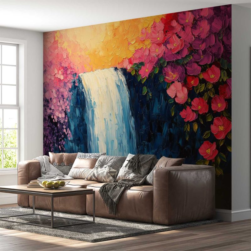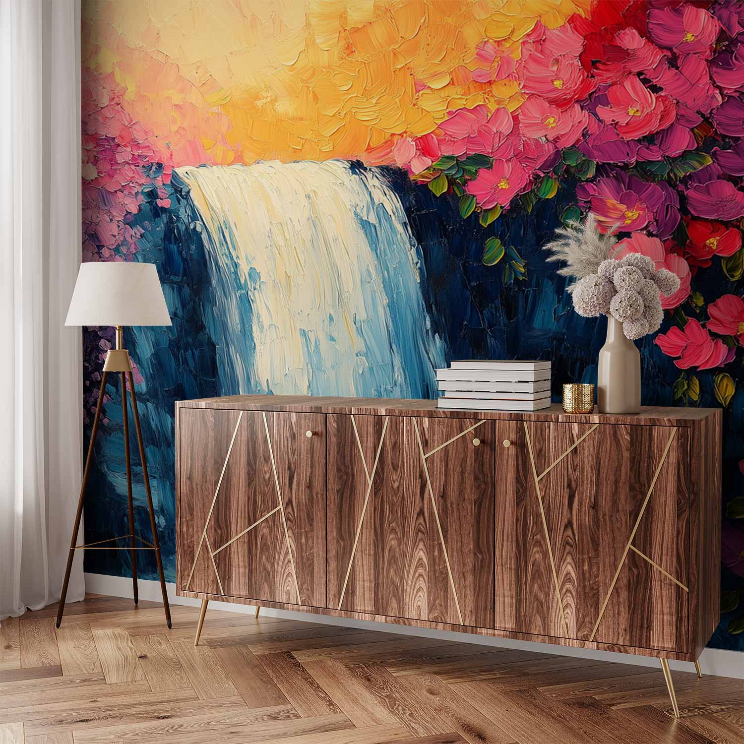 Stralende kleuren dansen over dit levendige watervalbehang. Frisse blauwe tinten stromen krachtig tussen zacht roze en rode bloesems. Expressieve penseelstreken creëren een speelse textuur die de ruimte tot leven wekt. Dit kunstwerk brengt de sereniteit van de natuur naar je interieur, waar het een vrolijk en dynamisch accent vormt dat zowel energie als rust uitstraalt.