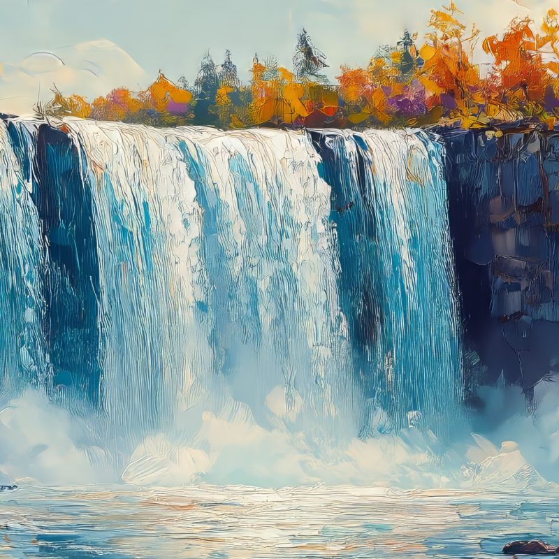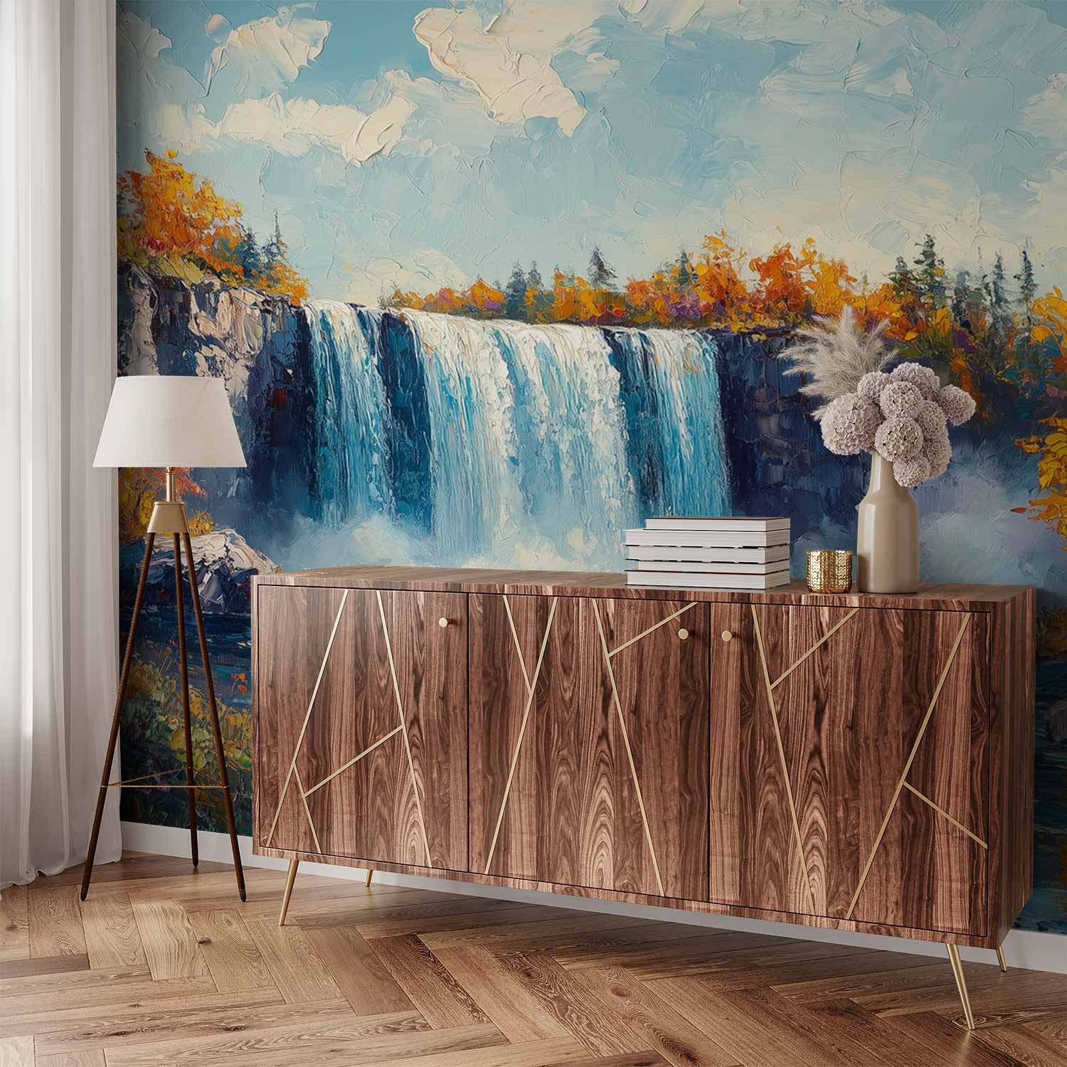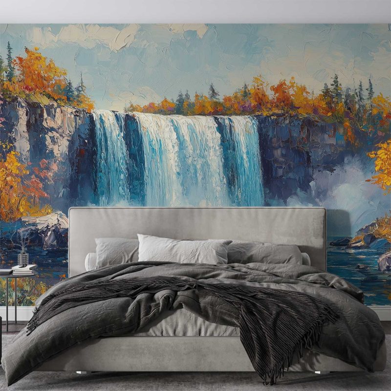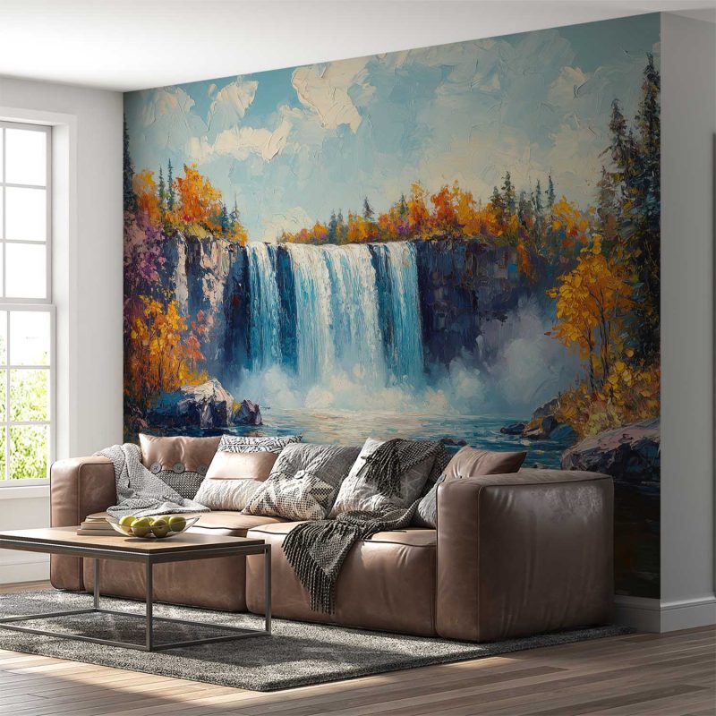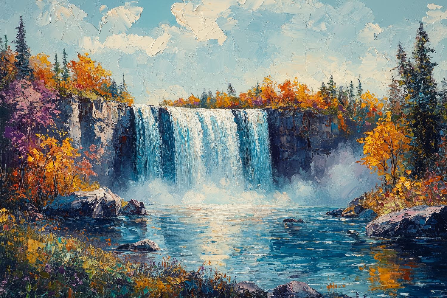 Stralende kleuren dansen over het doek, waar een waterval bruisend door een weelderig bos stort. Levendige tinten blauw, groen en oranje vangen de energie van de natuur in een impressionistische stijl. Deze muurdecoratie brengt de serene kracht van de wildernis naar binnen, perfect voor een ruimte die verfrissing en dynamiek kan gebruiken.