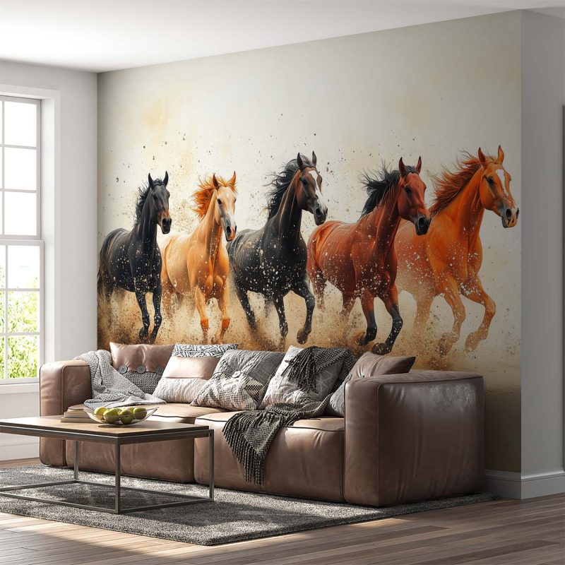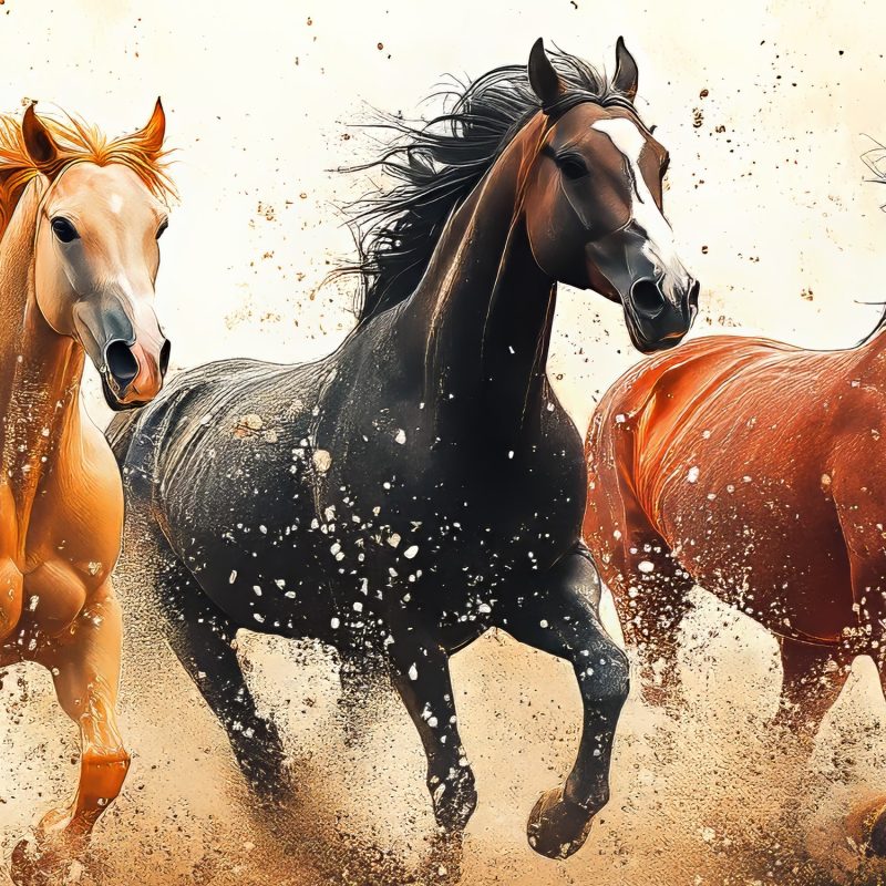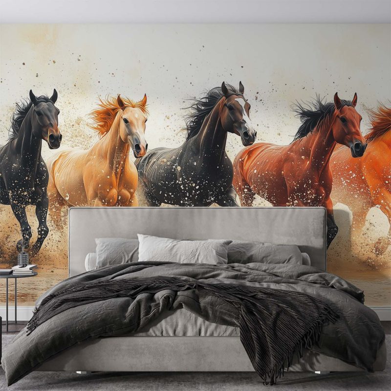 Vijf paarden stormen in volle vaart over het zand, hun manen wapperen wild in de wind. Een levendig palet van zwart, bruin en oranje vult de ruimte met dynamische energie. Dit krachtige tafereel brengt beweging en warmte in je interieur, perfect voor wie houdt van natuur, avontuur en een vleugje vrijheid in huis.