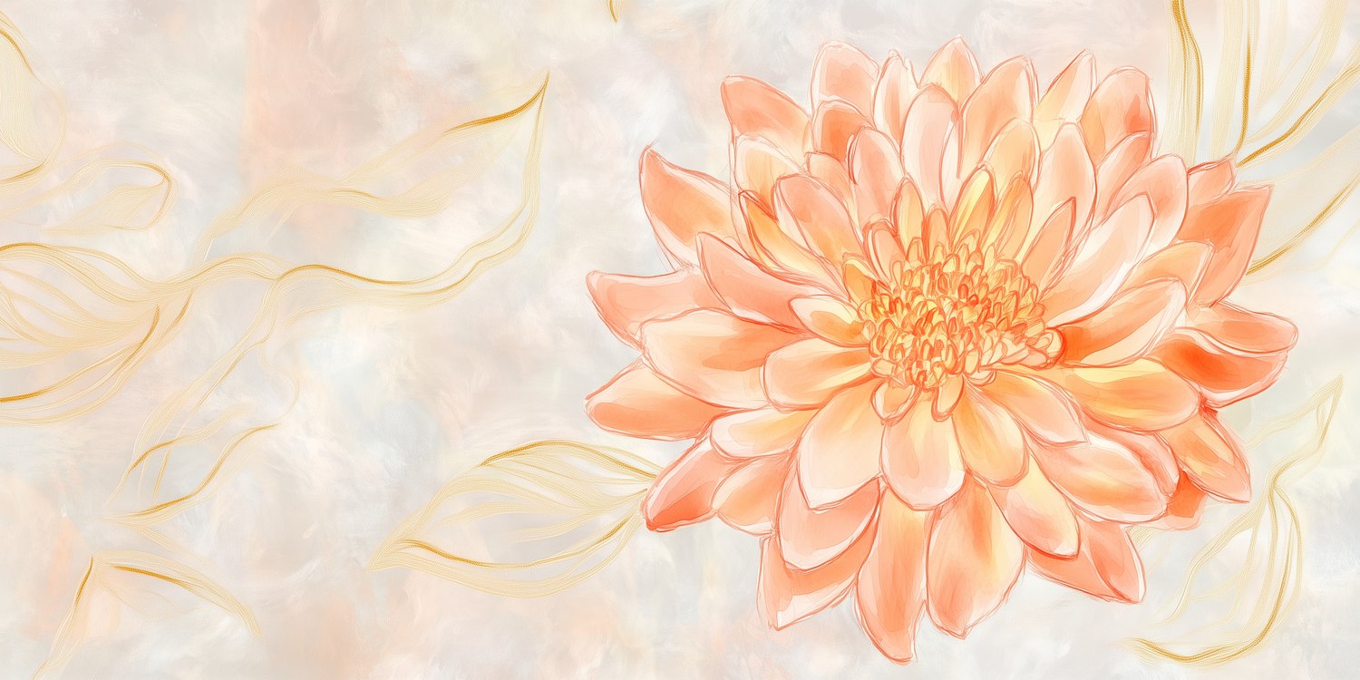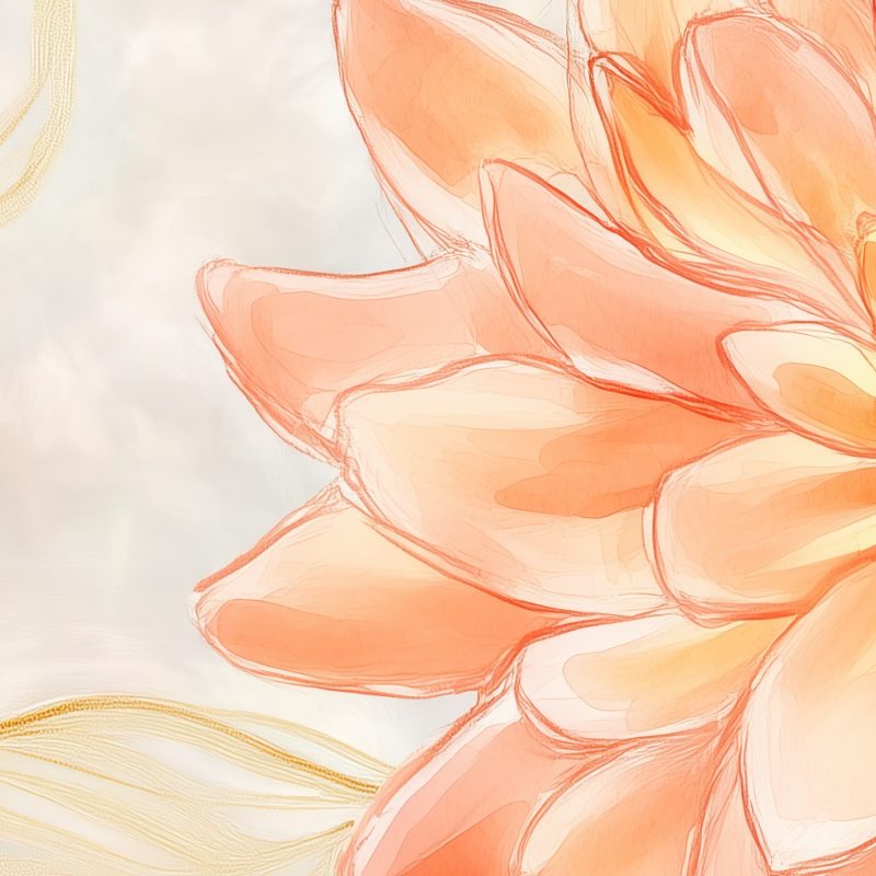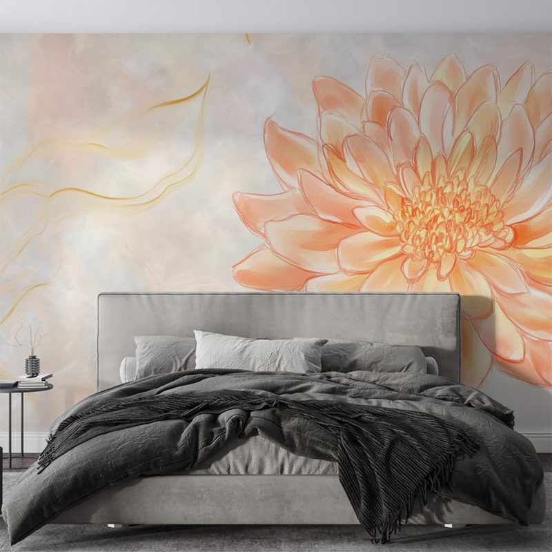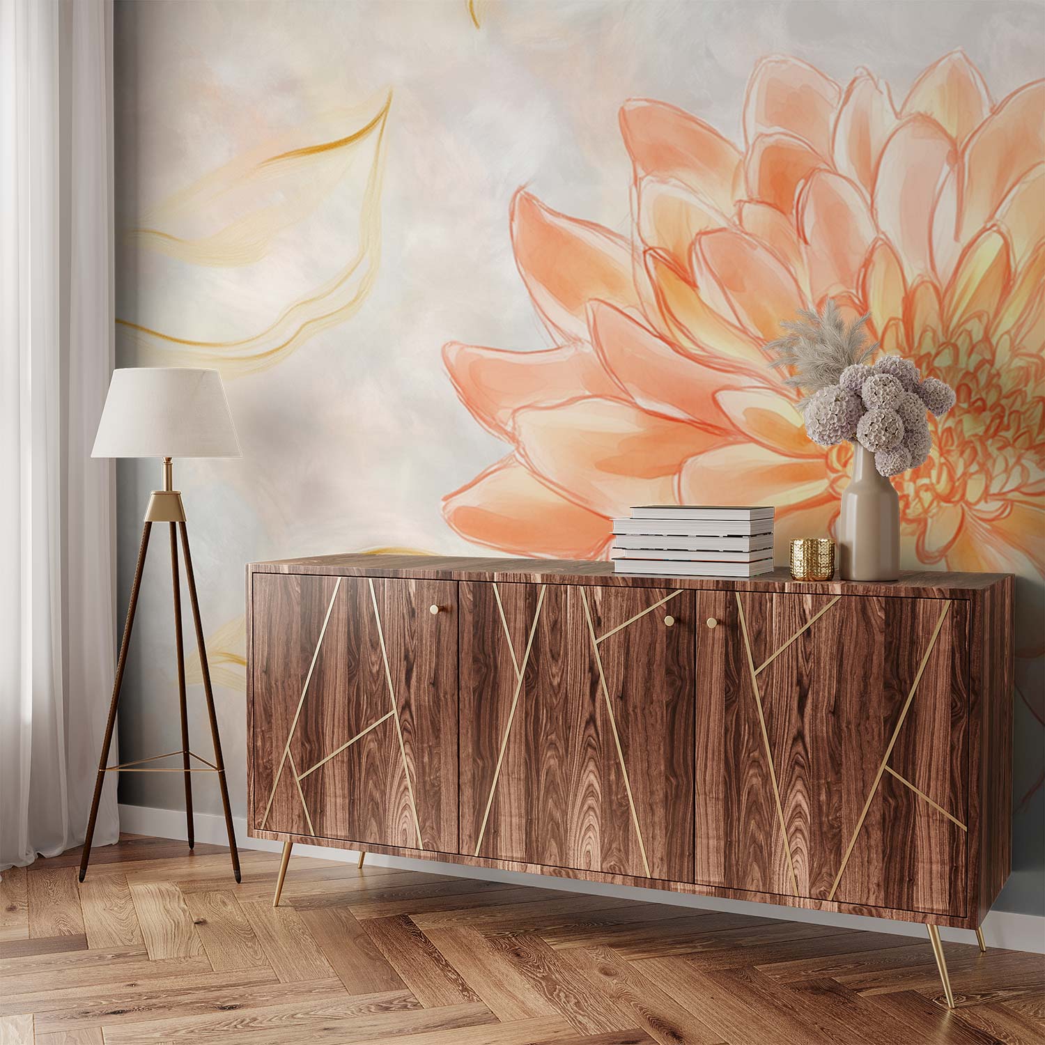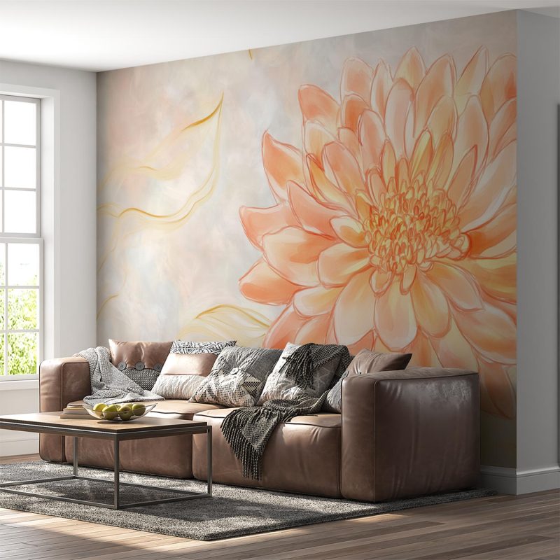 Warm oranje danst levendig over een zachtroze achtergrond, waar een weelderige bloem haar vele bloemblaadjes ontvouwt. Deze stralende verschijning brengt de vrolijke energie van de natuur direct je ruimte in. Perfect voor een interieur dat snakt naar een vleugje zon en positieve sfeer.