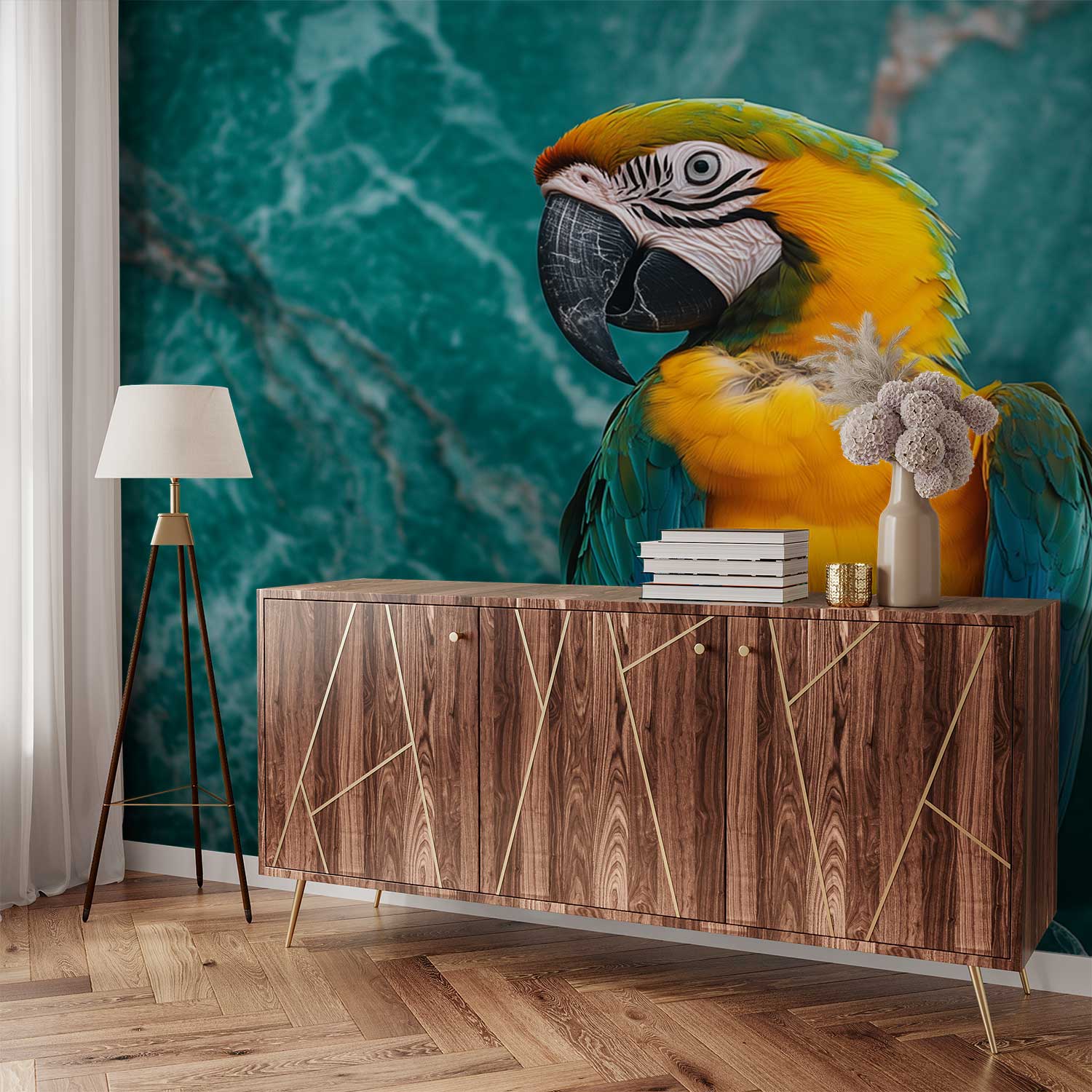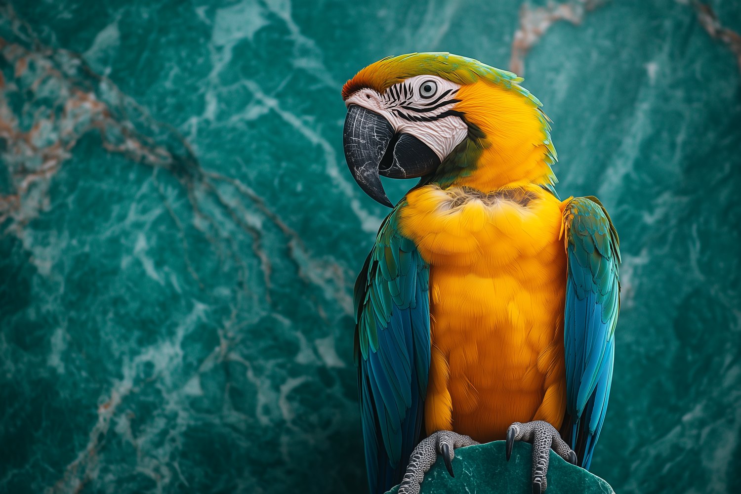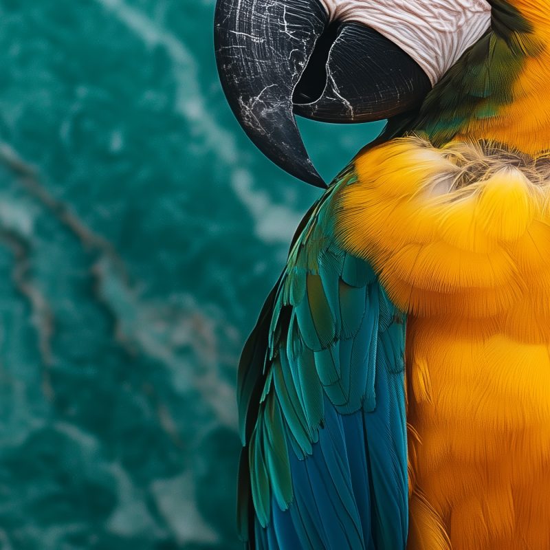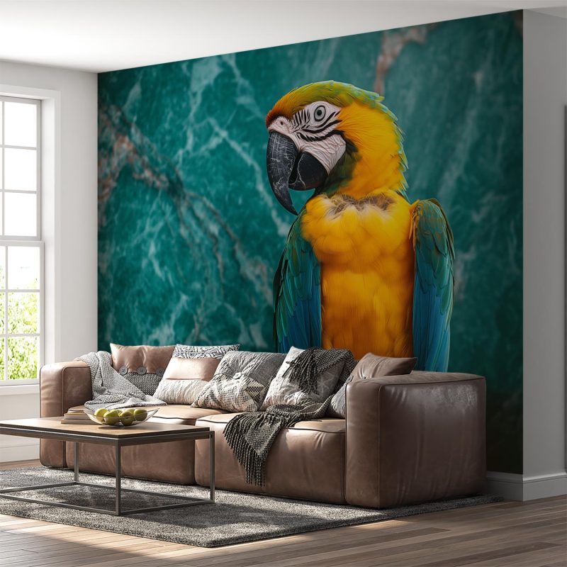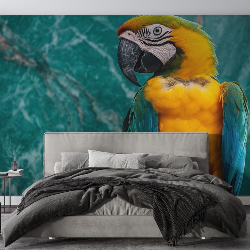 Vurige gele en blauwe veren flitsen tegen een groen marmeren achtergrond. Deze levendige papegaai, vastgelegd in een dynamische pose, straalt pure vreugde uit. Zijn zwarte snavel en poten accentueren het kleurenfestijn. Brengt energie en elegantie in elke ruimte, perfect voor een interieur dat durft te schitteren met speelse zwier.