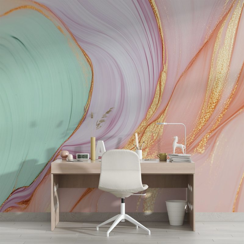 Dansende roze en groene wervelingen vloeien elegant samen, verrijkt met gouden accenten die de compositie levendigheid en diepte geven. Deze energieke mix van warme en frisse tinten brengt beweging en vreugde in elke ruimte. Perfect voor wie speelse elegantie zoekt, het behang transformeert muren tot een kunstwerk dat zowel dynamisch als verfijnd aanvoelt.