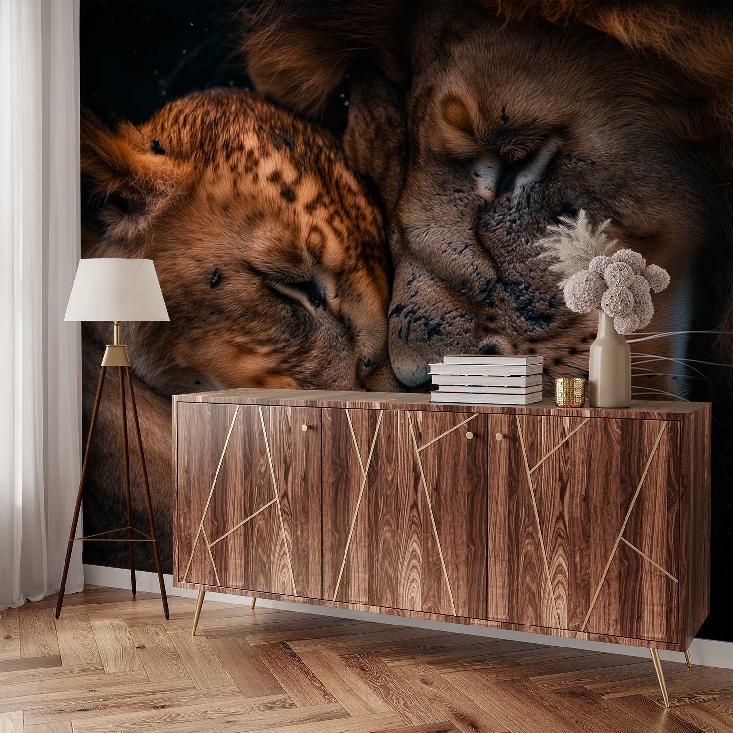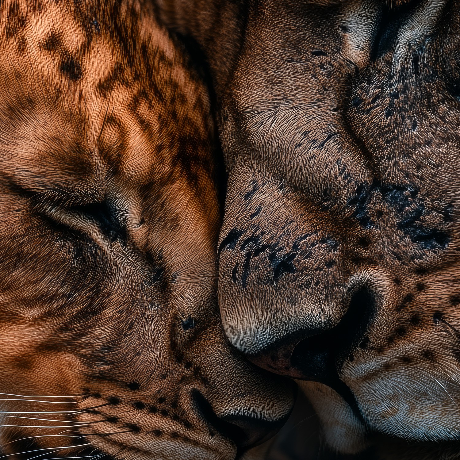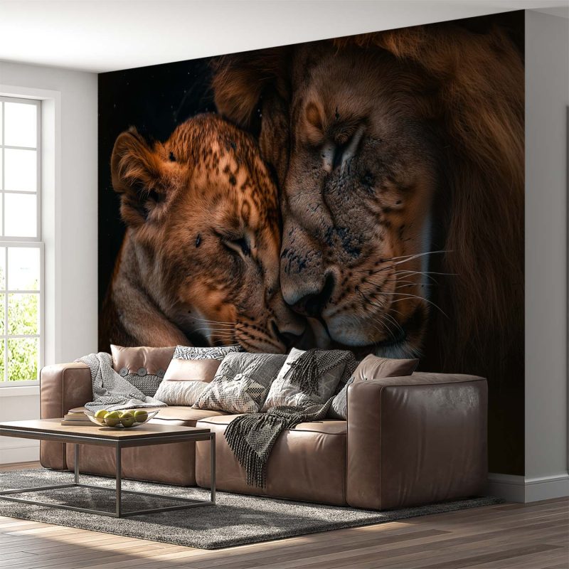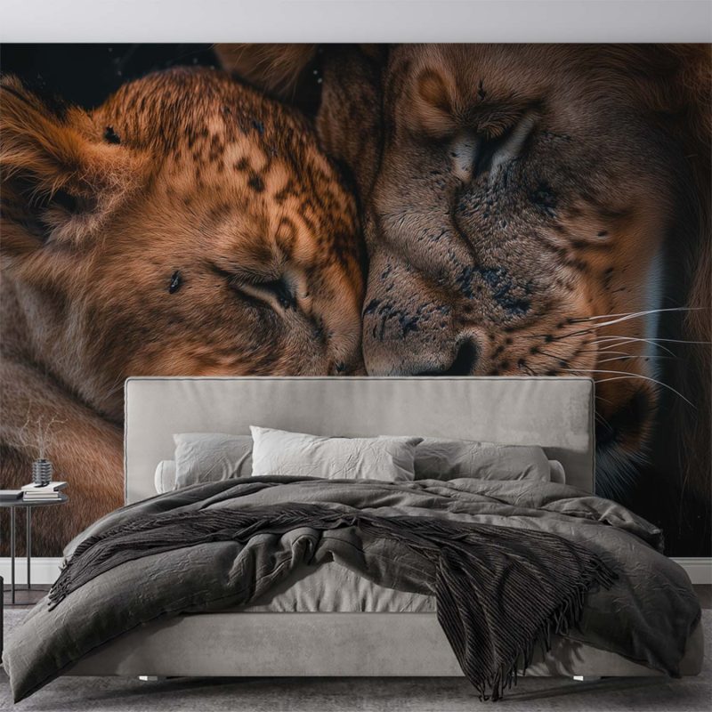 In warme bruintinten rusten twee leeuwen innig tegen elkaar, hun koppen zachtjes tegen elkaar gedrukt. De donkere achtergrond laat hun tedere band des te sterker spreken. Dit ontroerende moment brengt rust en een gevoel van bescherming in je interieur, perfect voor een serene sfeer in elke leefruimte.