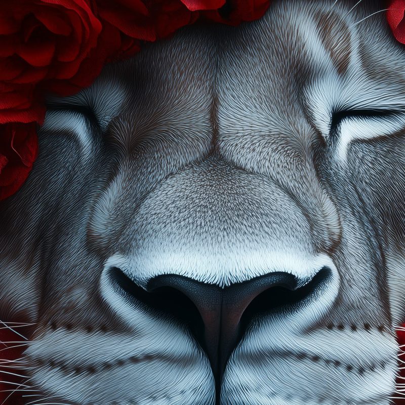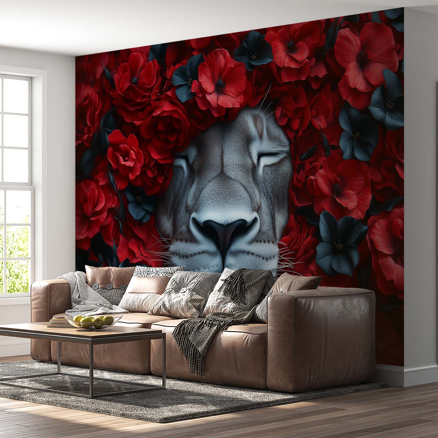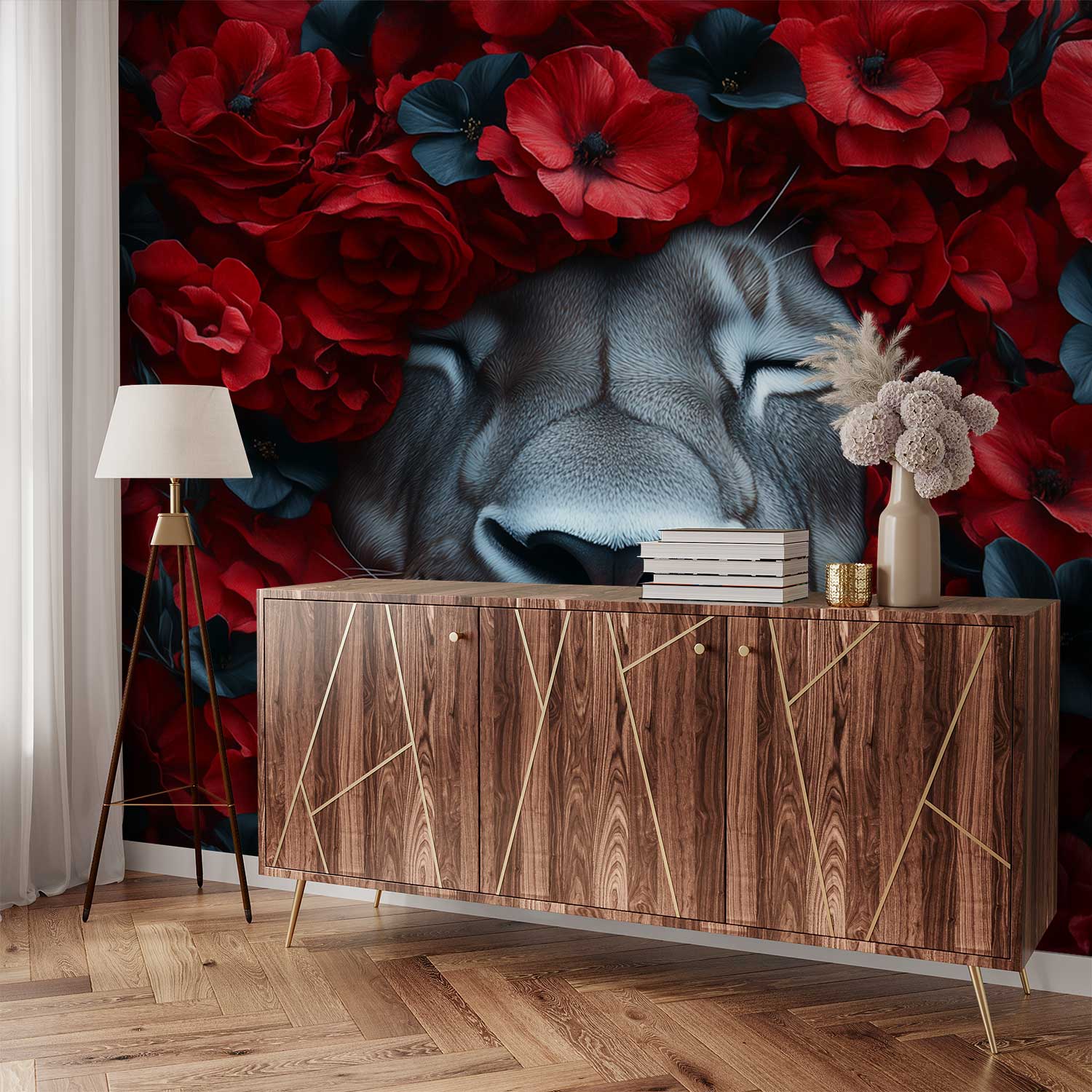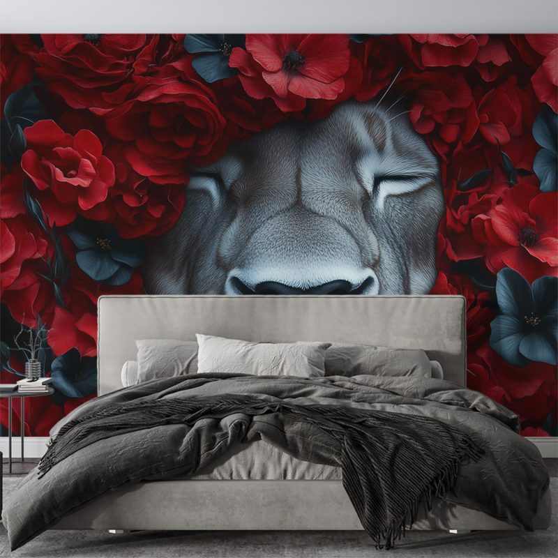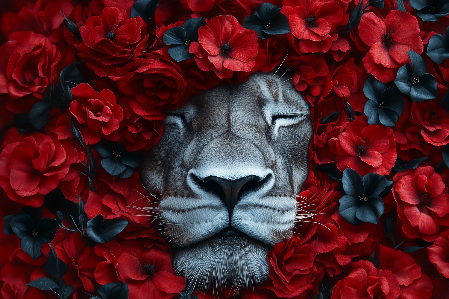 Verstillend sluimert de leeuw tussen een zee van robijnrode en diepzwarte bloesems. Zijn gesloten ogen stralen rust uit terwijl de levendige bloemenpracht een betoverend contrast vormt. Dit krachtige tafereel brengt mystieke natuur in huis en wordt een hypnotiserend middelpunt in elke ruimte. De rijke kleuren en harmonieuze compositie voegen diepte en karakter toe aan moderne interieurs.