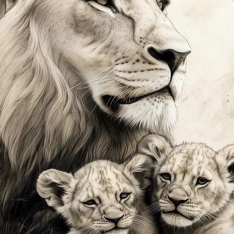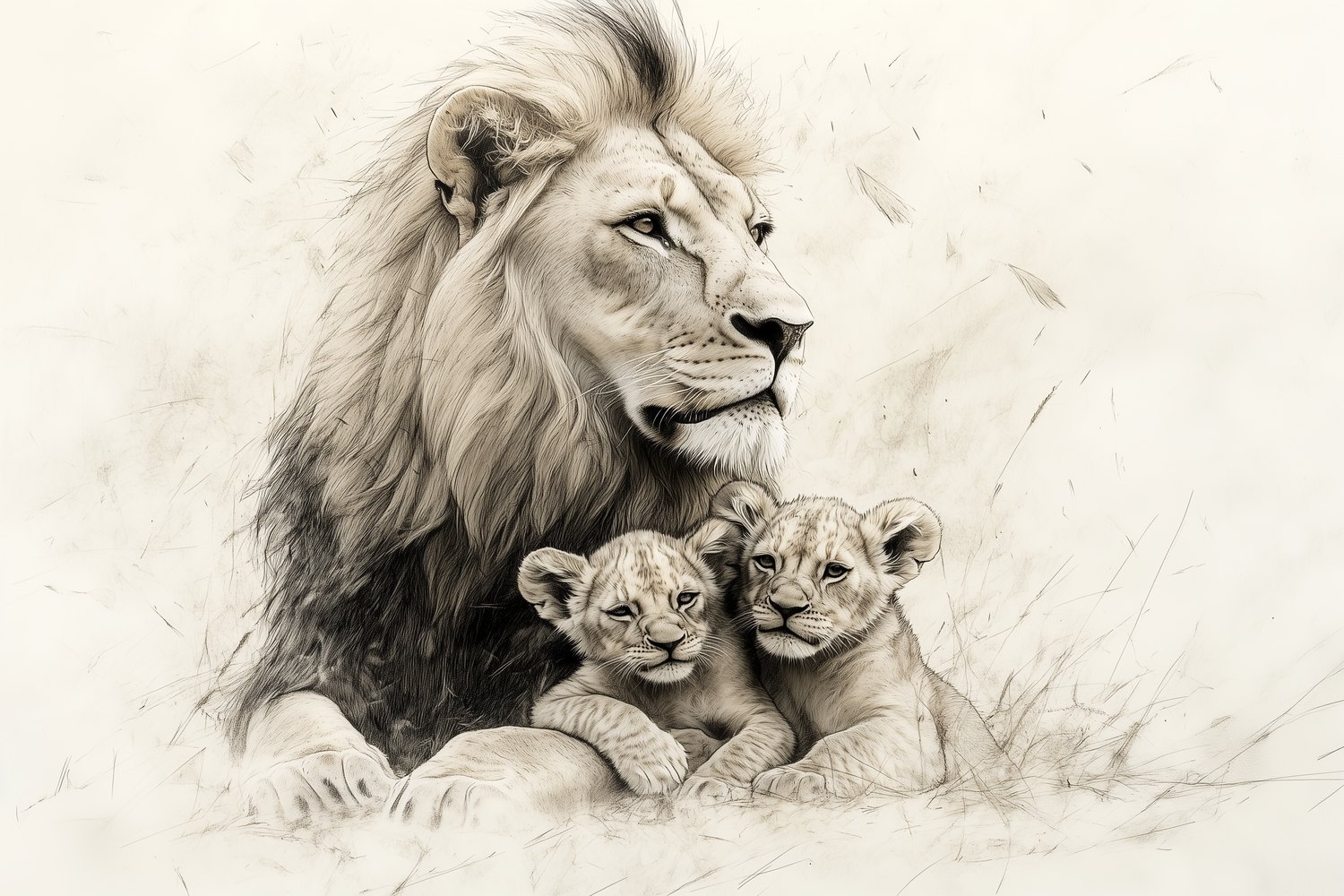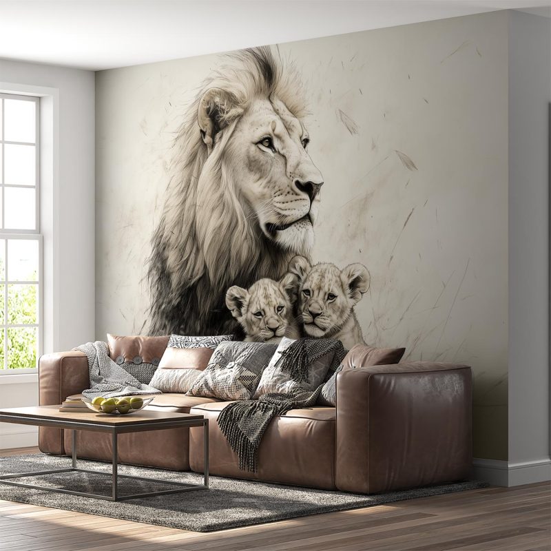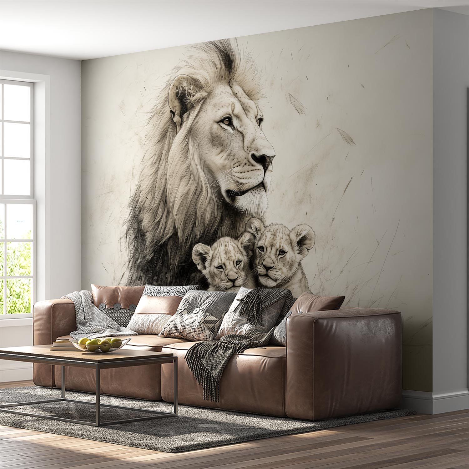 In zwart-wit ontwaakt een majestueuze leeuw, zijn manen gedetailleerd gekruld terwijl hij waakt over twee speelse welpen. De realistische schets straalt rust en bescherming uit, een tijdloos tafereel van tedere verbintenis. Dit behang brengt de serene kracht van de natuur in huis, ideaal voor een rustgevende en karaktervolle accentmuur.