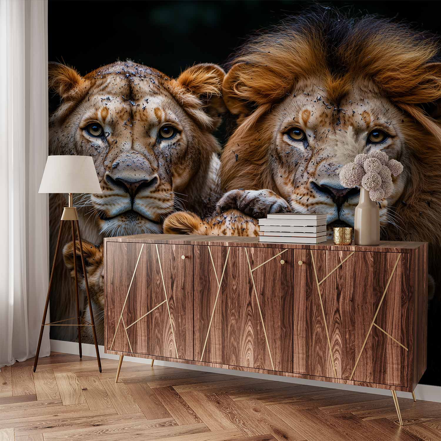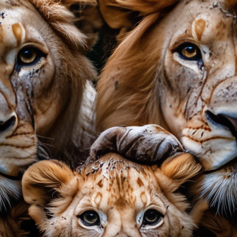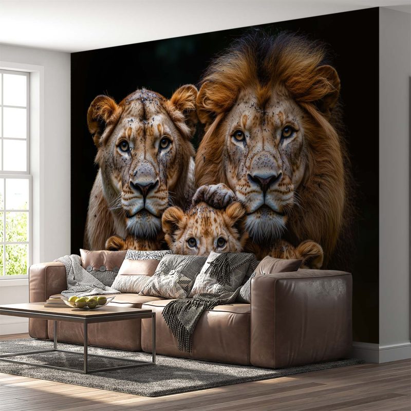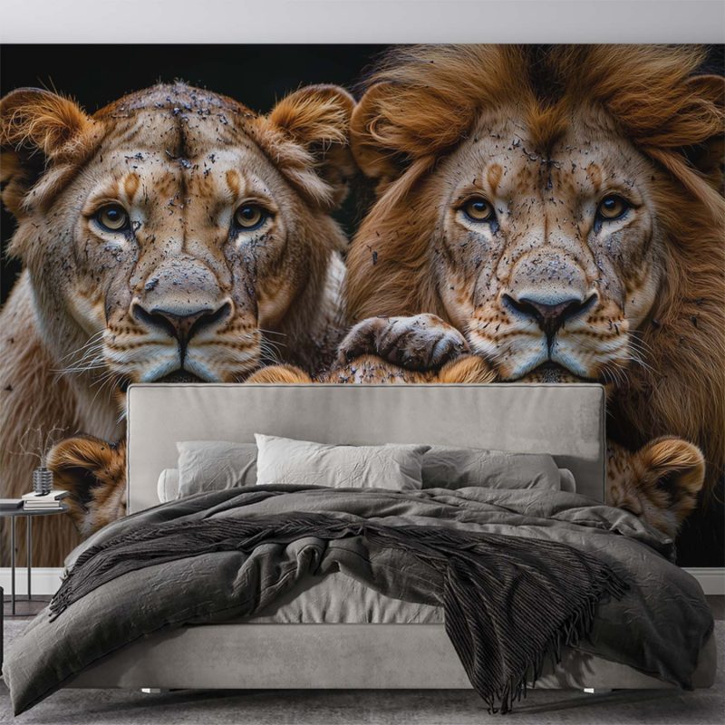 Gouden tinten vangen het warme licht terwijl de leeuwenfamilie innig samenschuilt. Sterke volwassenen beschermen hun speelse welpen in een harmonieuze compositie. Diepe bruinen en zwarte accenten creëren een dramatische diepte die deze koninklijke band benadrukt. Perfect voor een statement muur die zowel kracht als tederheid uitstraalt in je interieur, en een gevoel van bescherming en verbondenheid brengt.