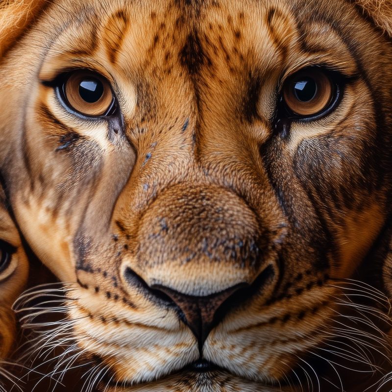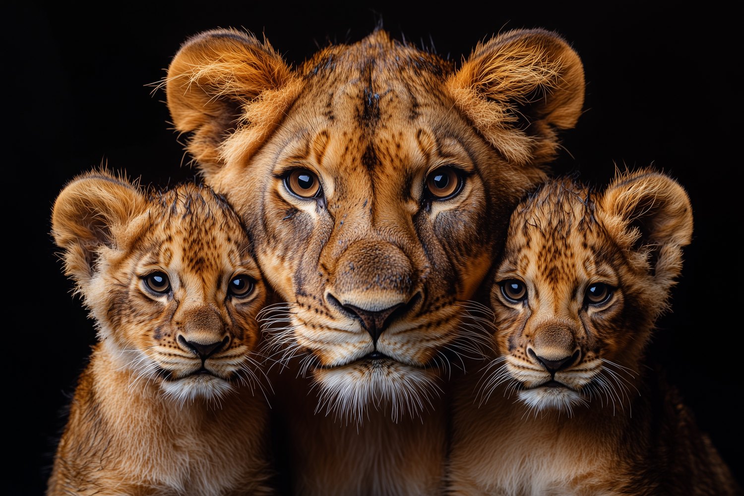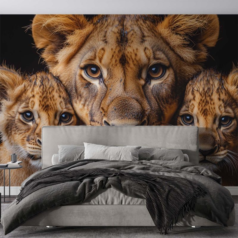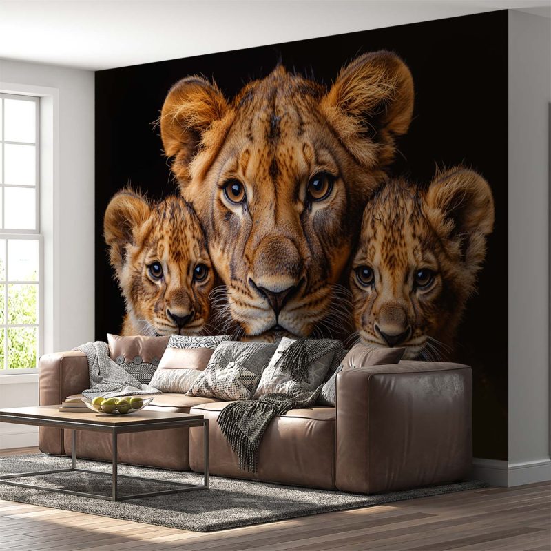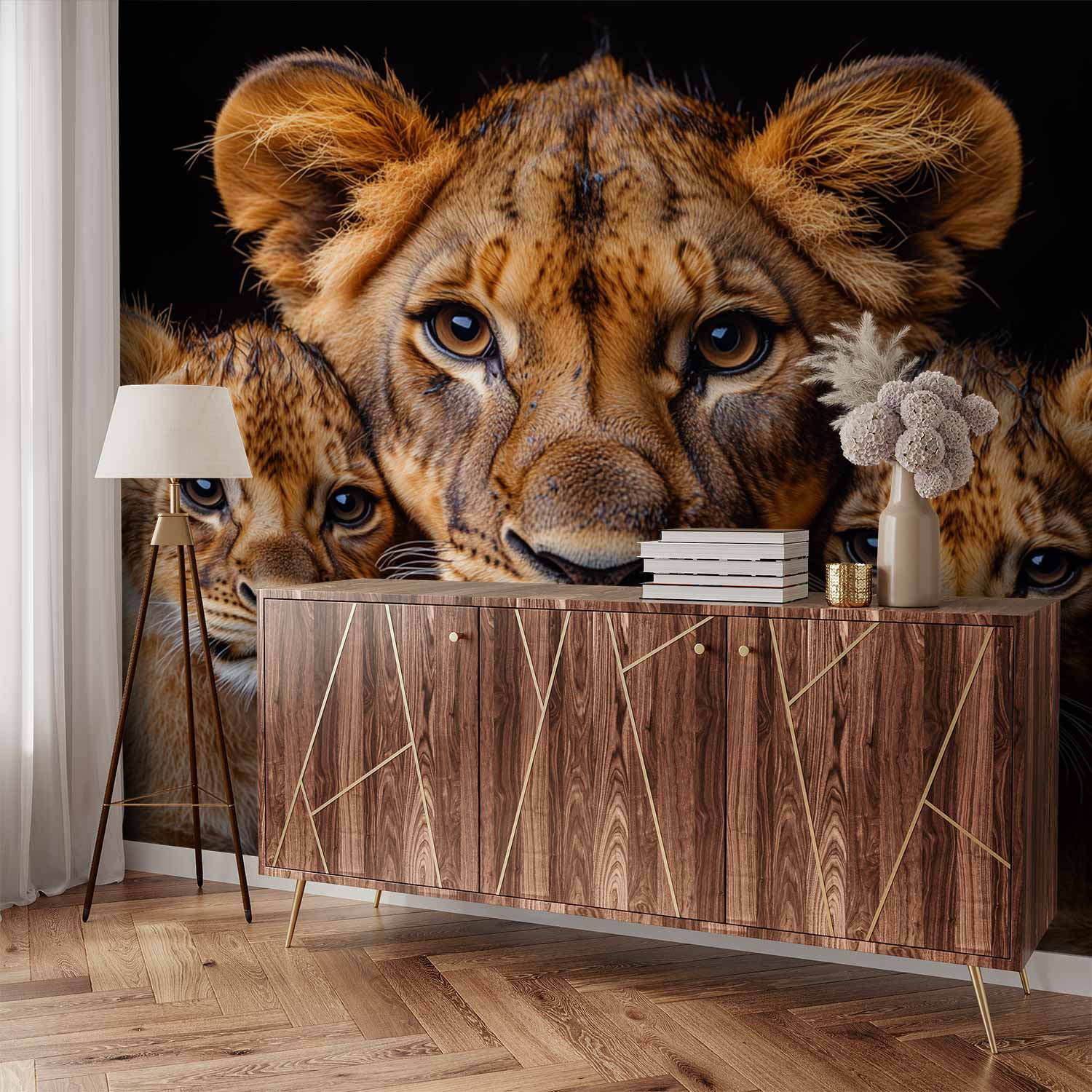 Warme bruintinten stralen een sfeer van tedere bescherming uit. De leeuwin en welpen vormen een innige drie-eenheid tegen een diepzwarte achtergrond. Hun samenzijn ademt pure familiebanden. Dit behang brengt een gevoel van warmte en verbondenheid in je interieur, perfect voor een knusse leefruimte waar genegenheid centraal staat.
