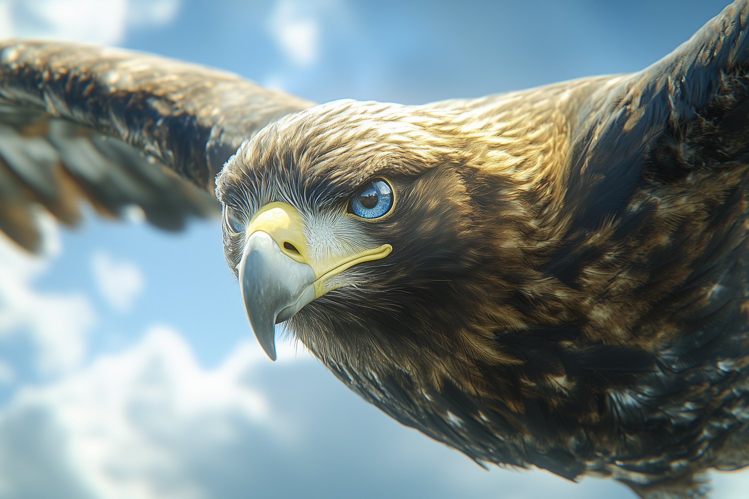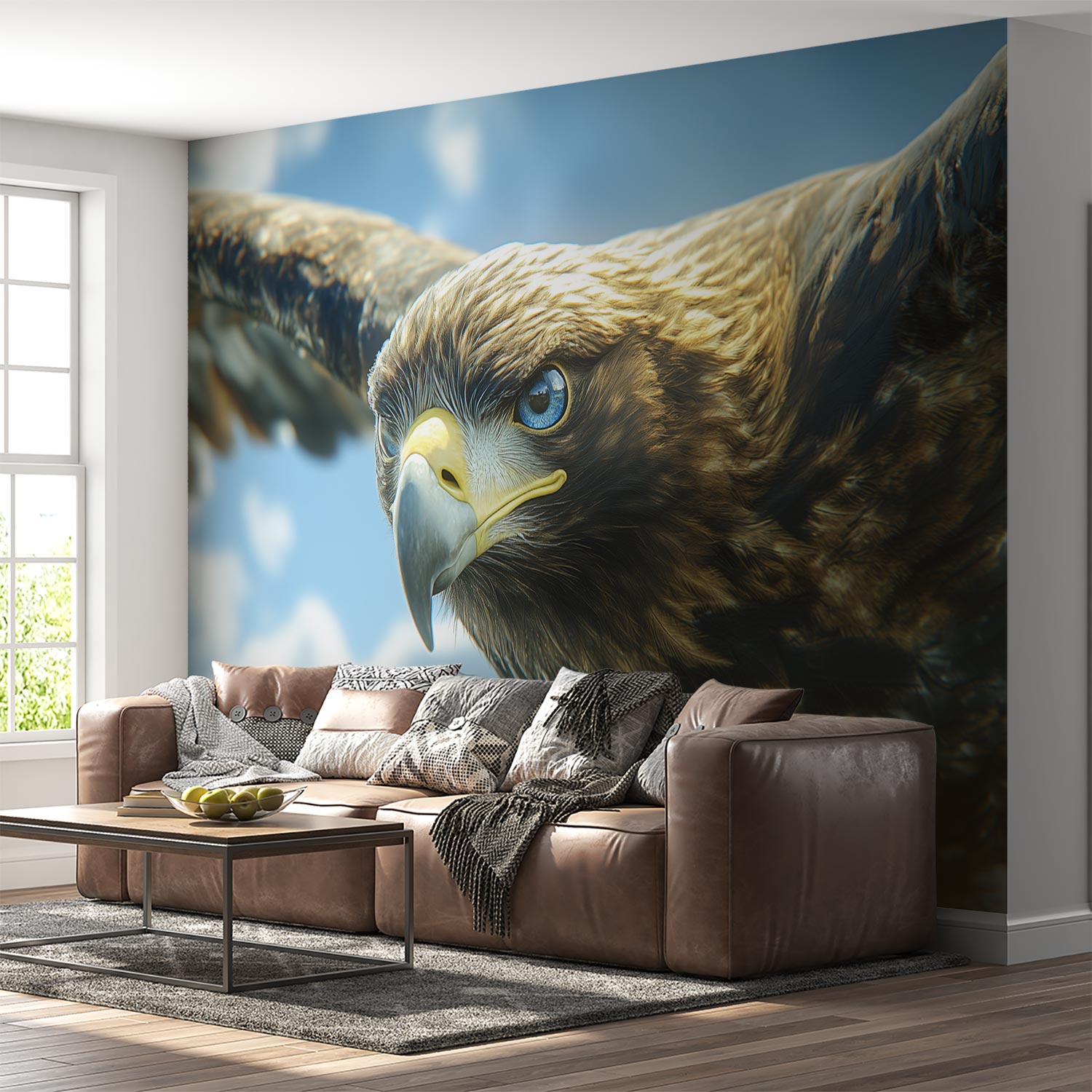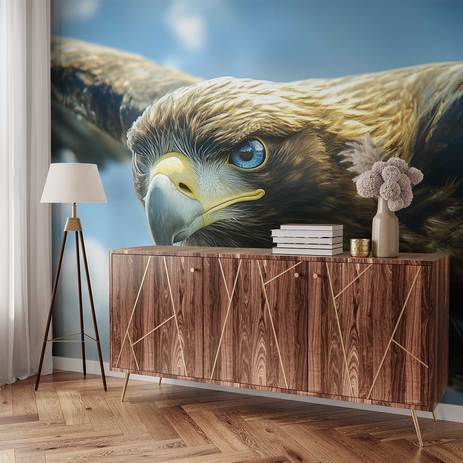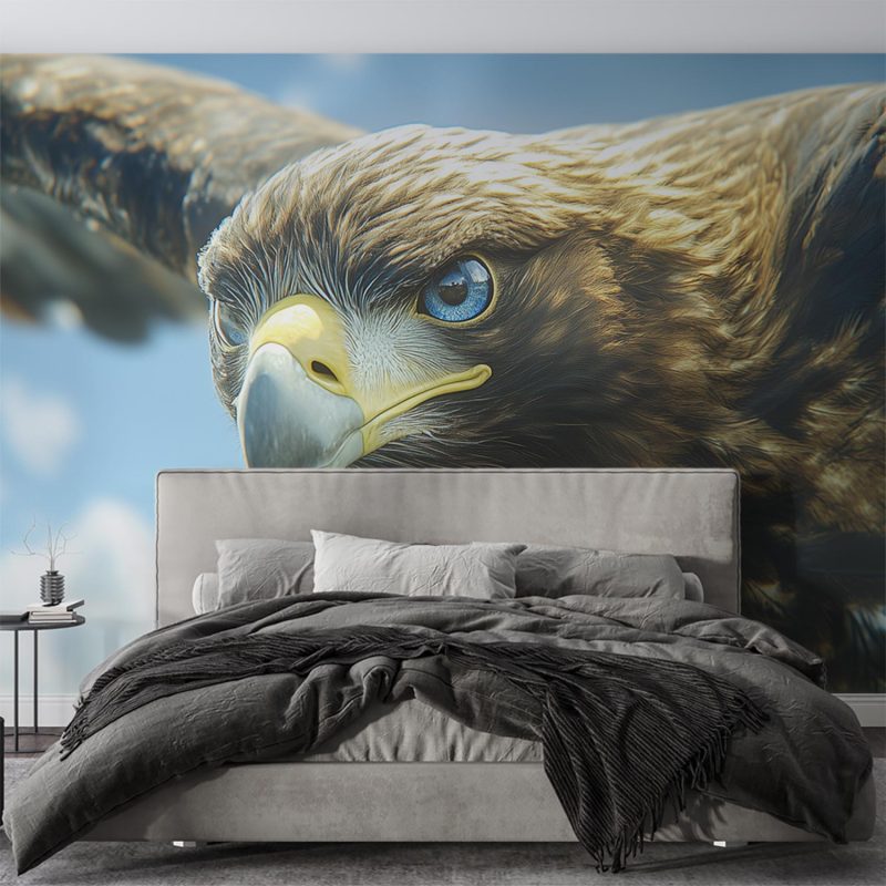 Bruine en zwarte tinten vangen de majestueuze vlucht van een adelaar die krachtig door een wolkendek zweeft. Zijn gespreide vleugels vullen de ruimte met een gevoel van vrijheid en gratie. Dit behang brengt een gevoel van onbegrensde ruimte in je interieur, ideaal voor een statement muur die zowel kracht als rust uitstraalt.