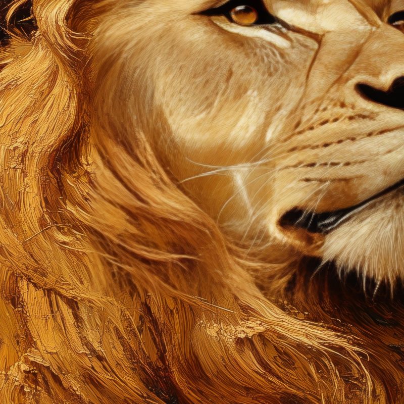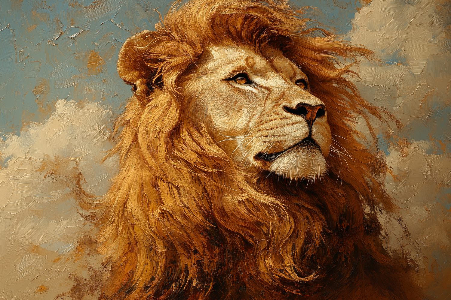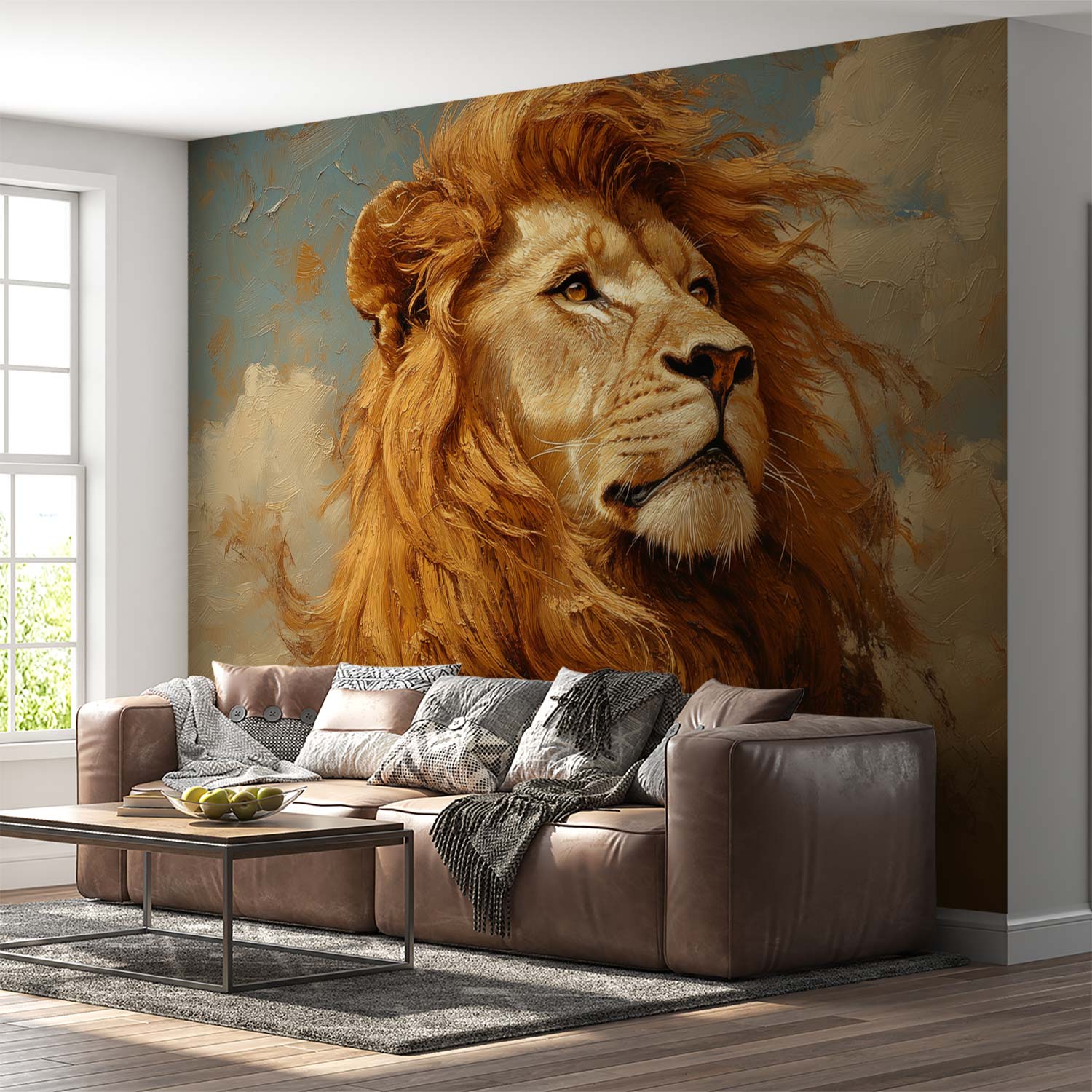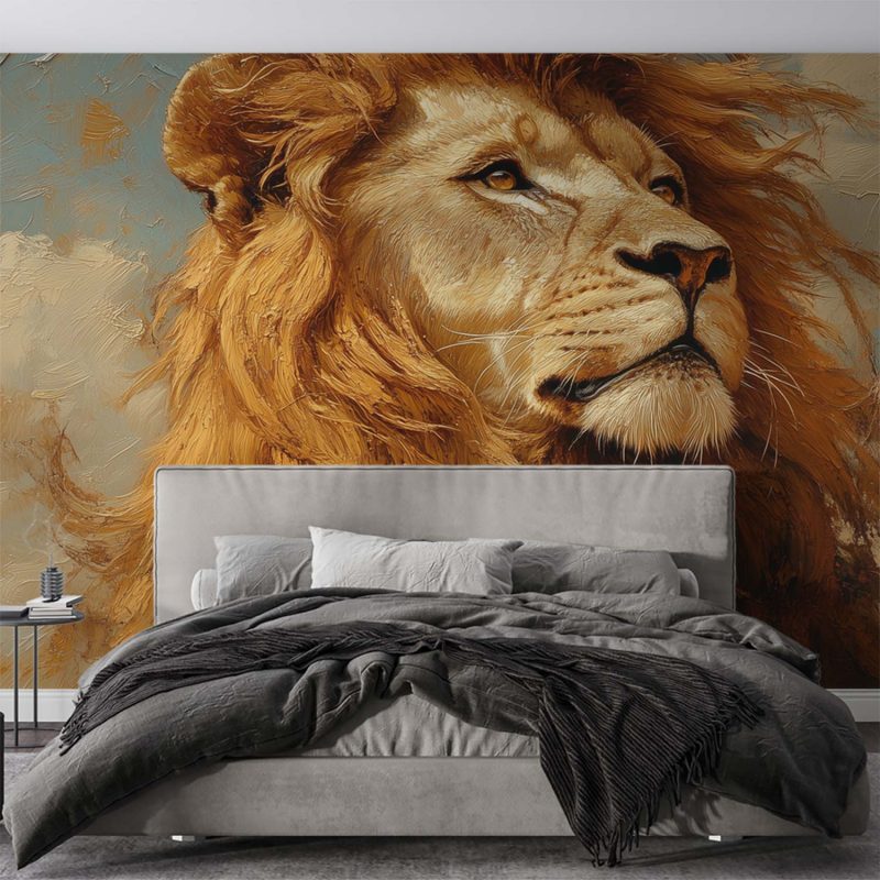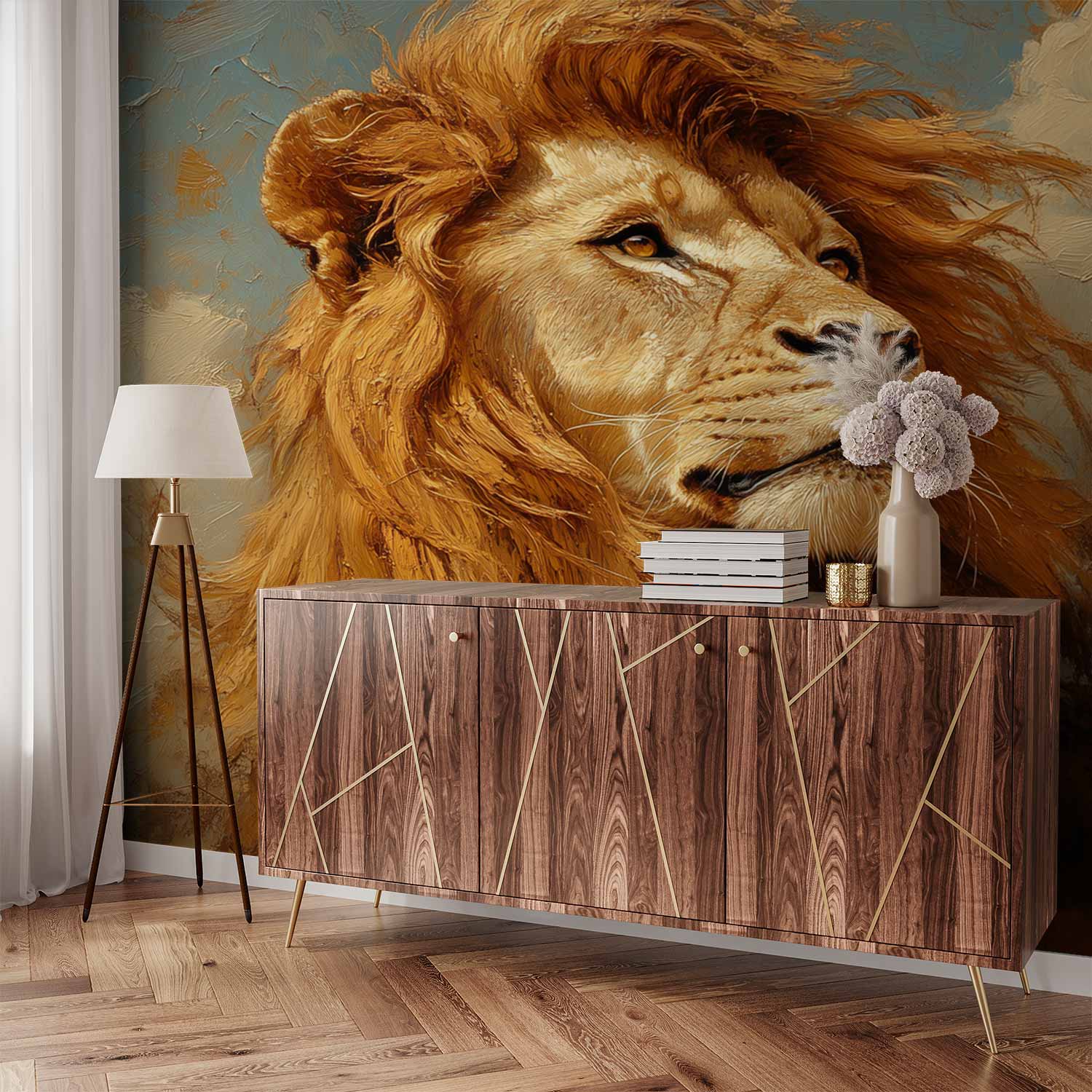 Gouden manen dansen in een impressionistische waas, terwijl een koninklijke leeuw met waakzame blik de ruimte vult. Zijn warme tinten contrasteren prachtig met het diepe blauw van de lucht, en creëren een levendig kunstwerk vol kracht en beweging. Dit behang brengt majesteitelijke energie in je interieur, en transformeert elke muur in een indrukwekkend statement vol natuurlijke elegantie.