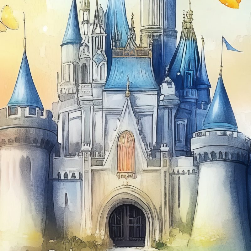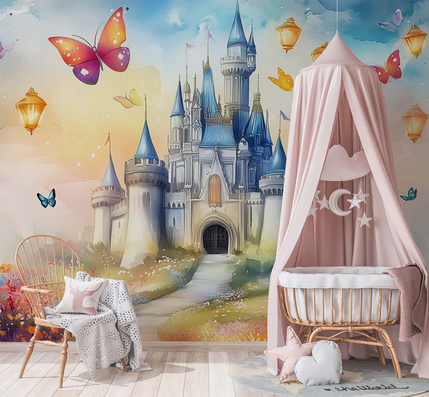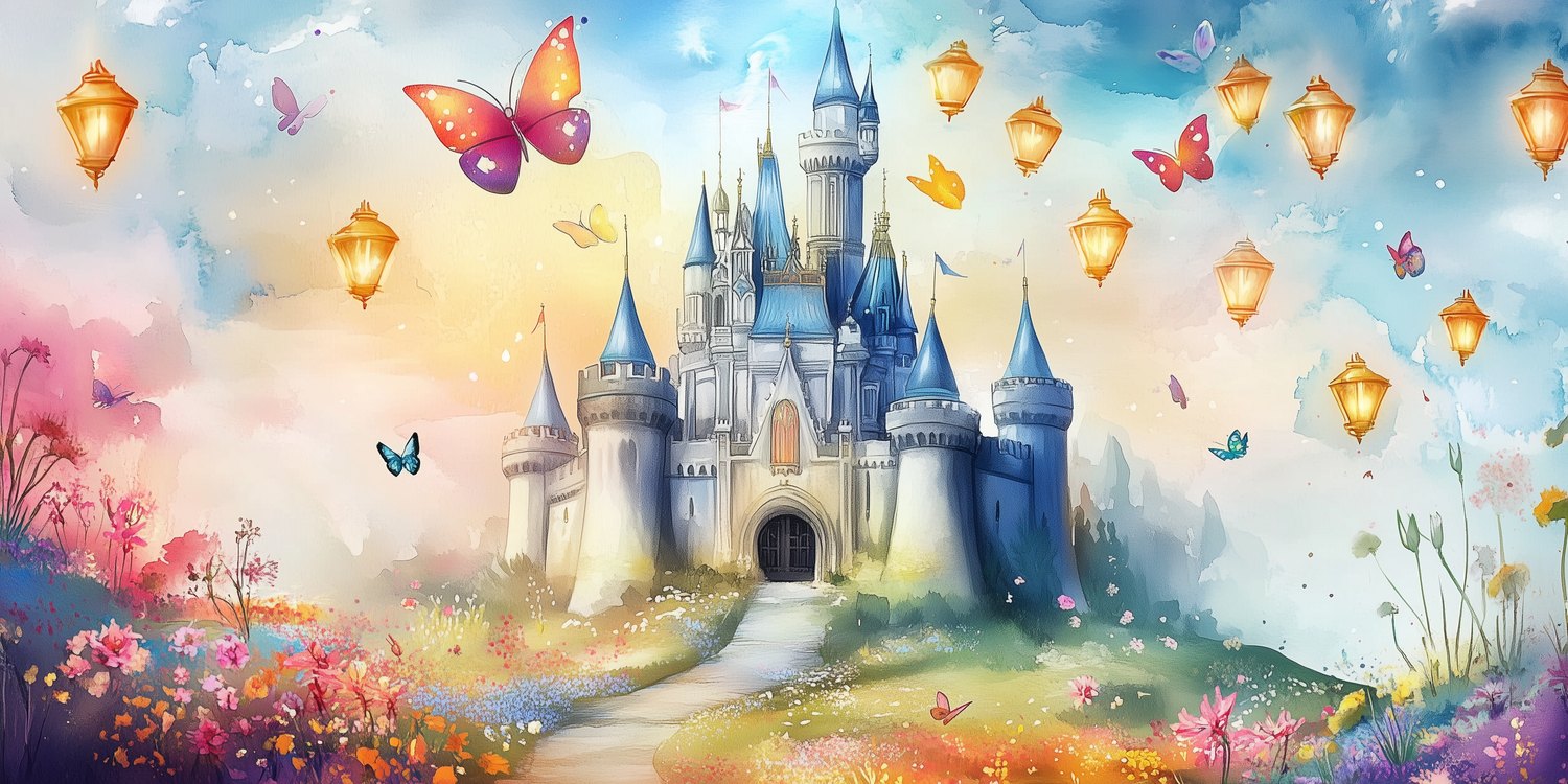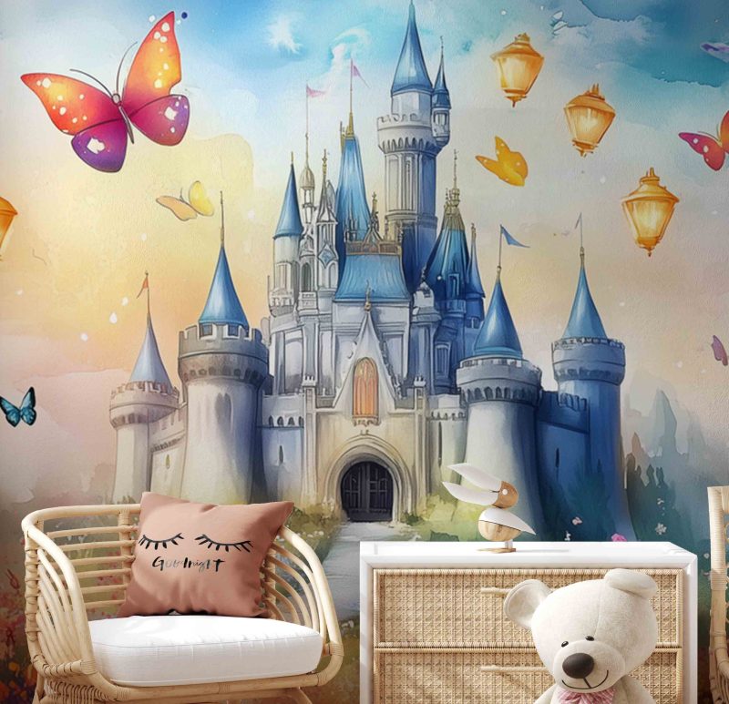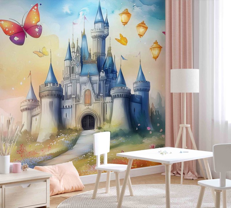Betoverend waterkasteel in zachte blauwtinten, omringd door een dansende bloementuin vol fladderende vlinders. Roze bloesems wiegen zachtjes in de dromerige sfeer. Dit sprookjesachtige behang wekt pure verwondering op en transformeert elke kinderkamer in een magische speelruimte vol fantasie-avonturen, waar verhalen tot leven komen en de verbeelding oneindig speelt.
